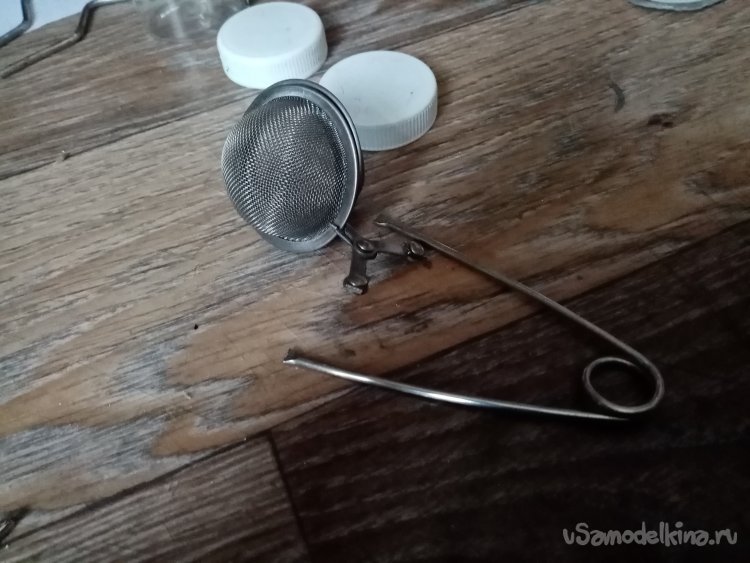 Нужна еще одна баночка с более мелкой сеточкой. Пошарившись по углам извлекаю заварочную ложечку. Хорошая, мелкая сетка. Диаметр как раз подходит по место во флокаторе. Для гарантии примеряю. Все соответствует.