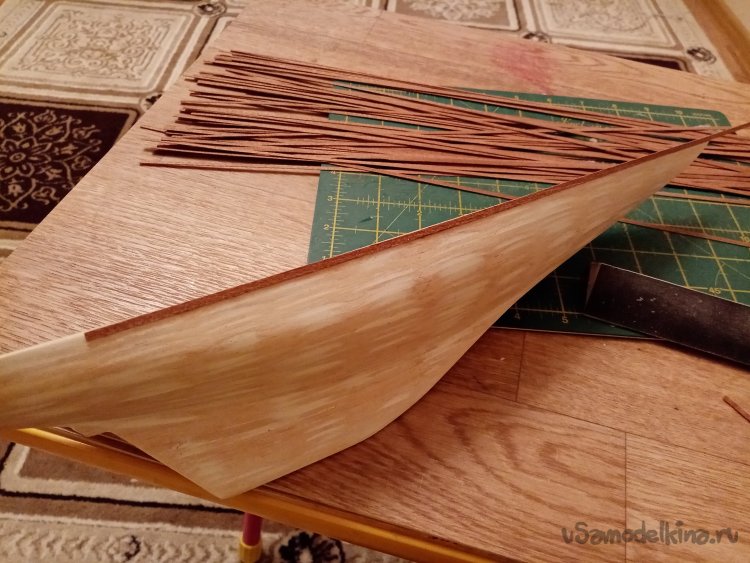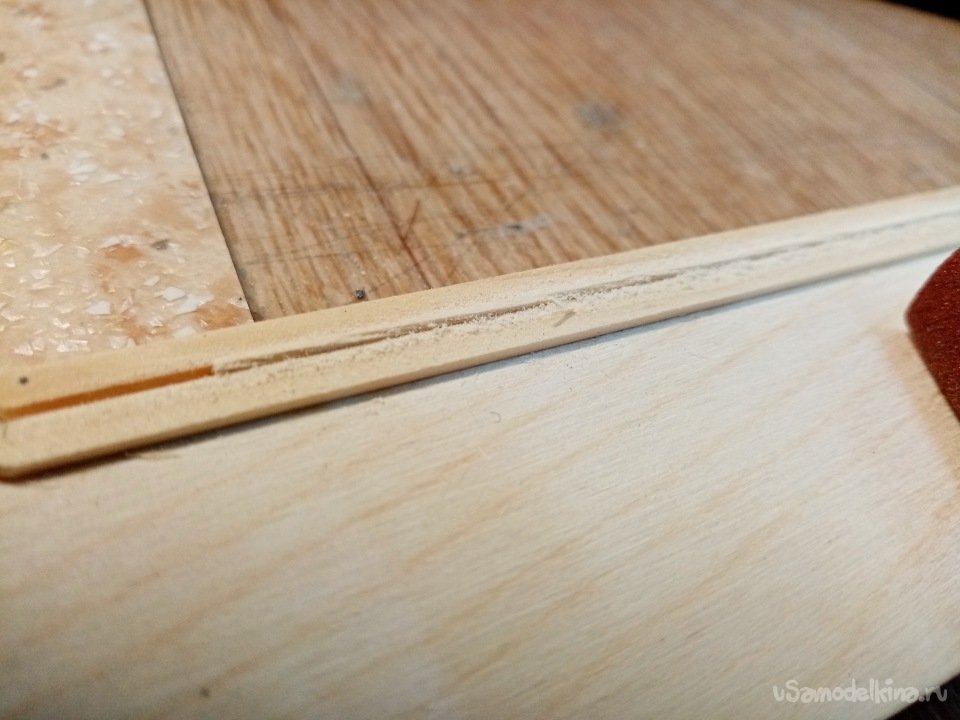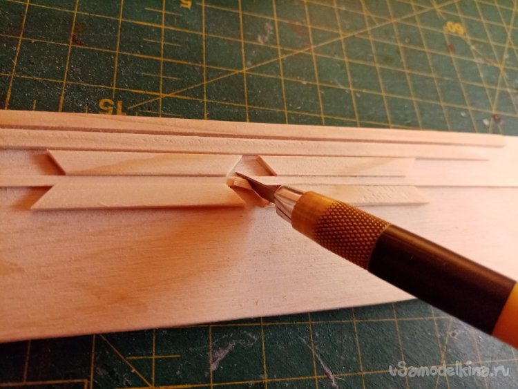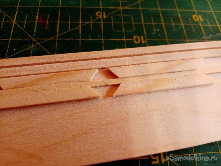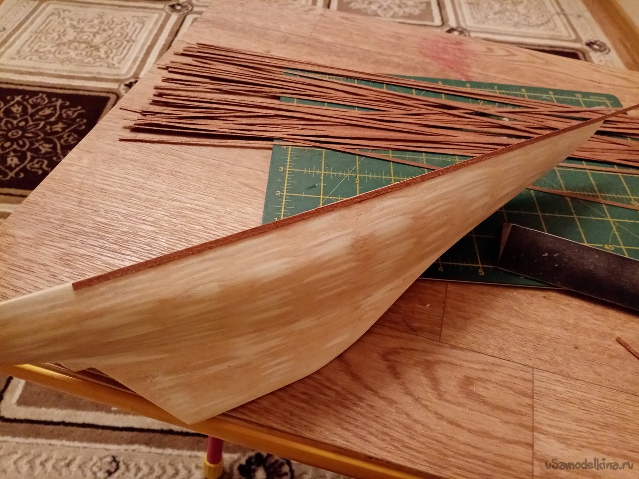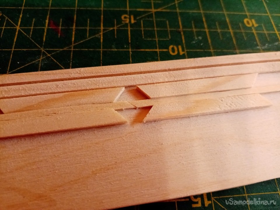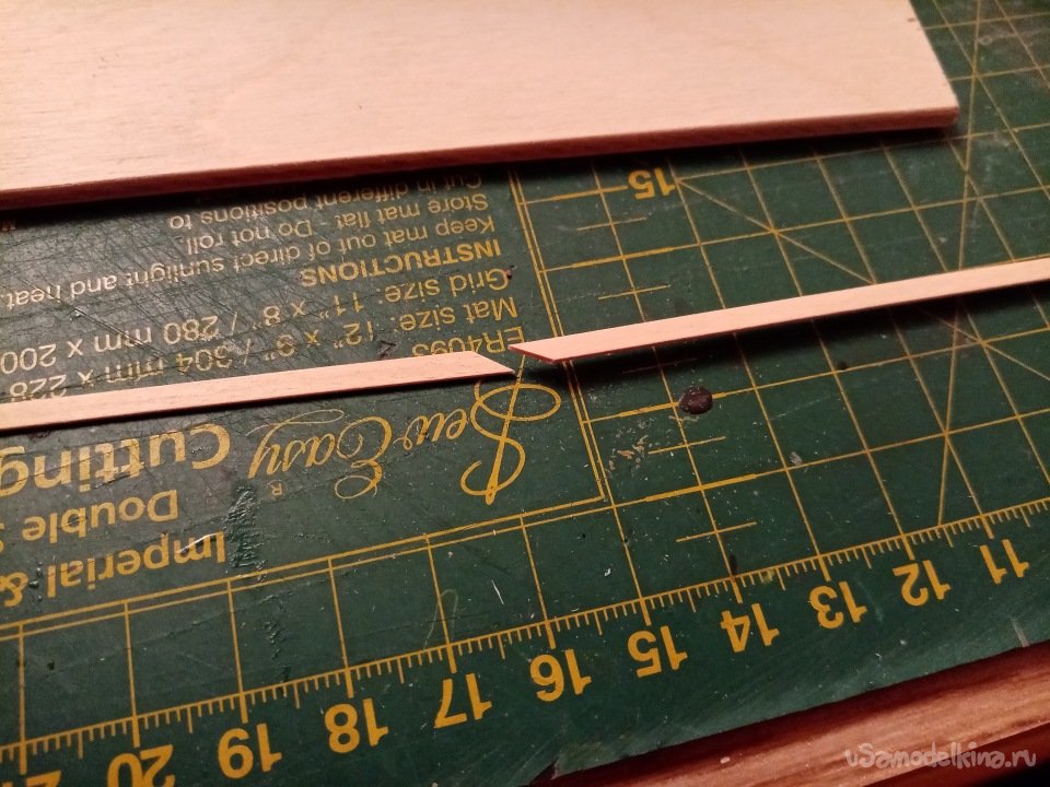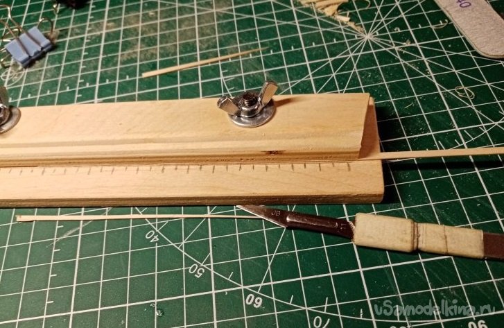 Мне нужно соединить рейки подлине. Не хватает полностью приклеить ряд на корпус. Устанавливаю кончик рейки на стапели и отрезаю под установленным углом острым треугольным ножом. Ответный кончик второй рейки также отрезаю под углом. У меня получается абсолютно одинаковый угол необходимый для склейки рее по длине корпуса.