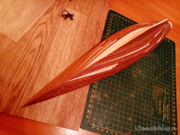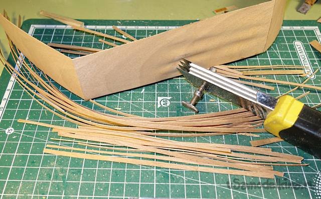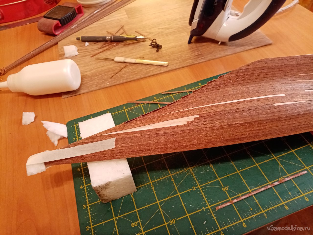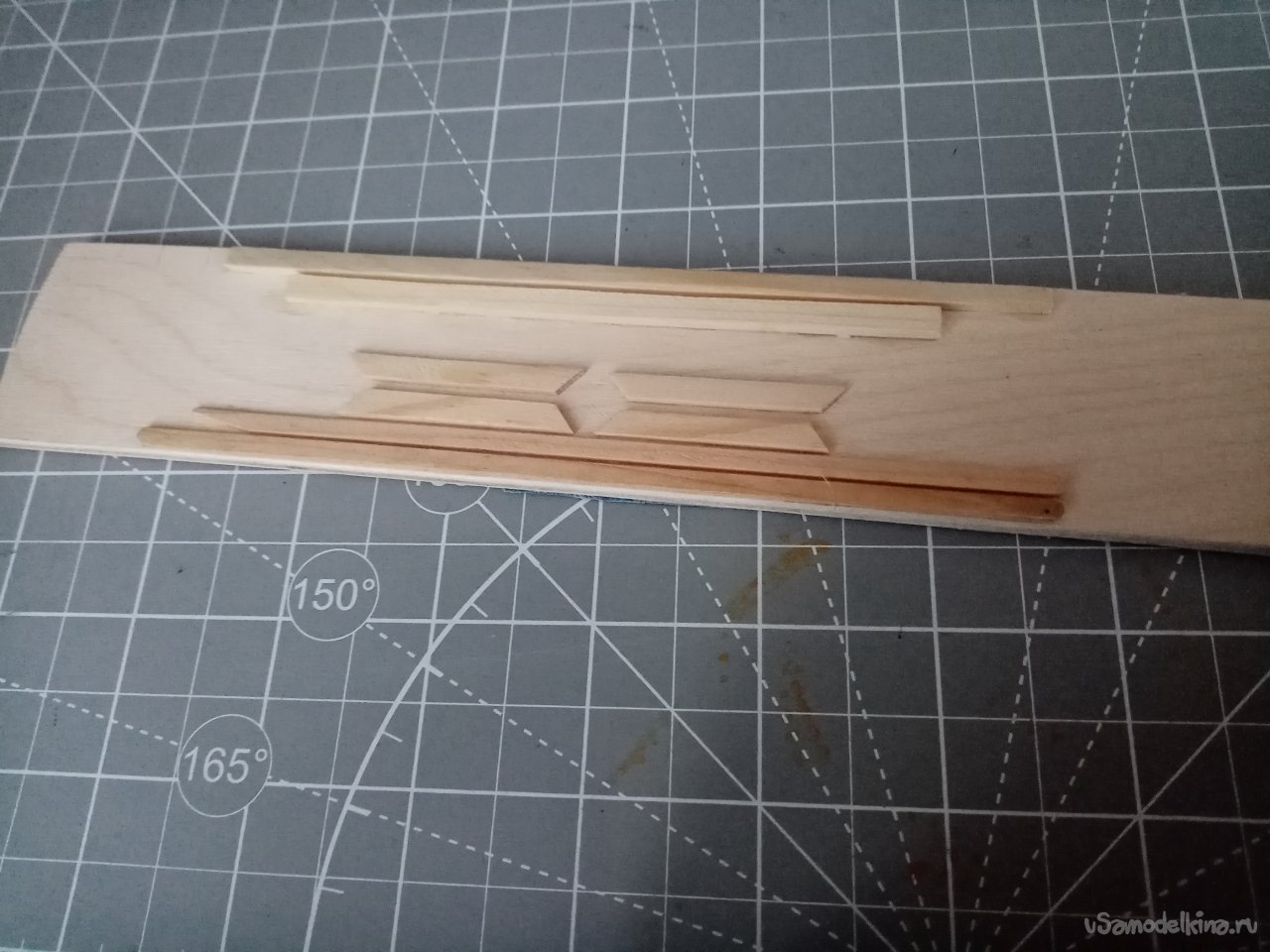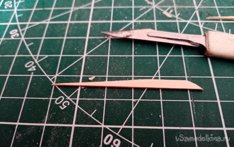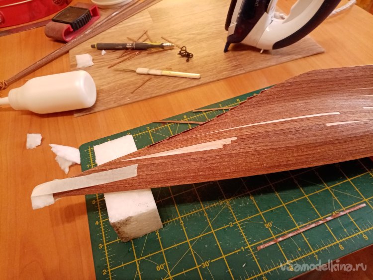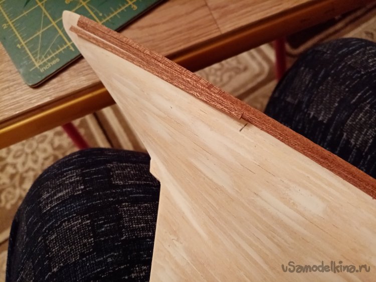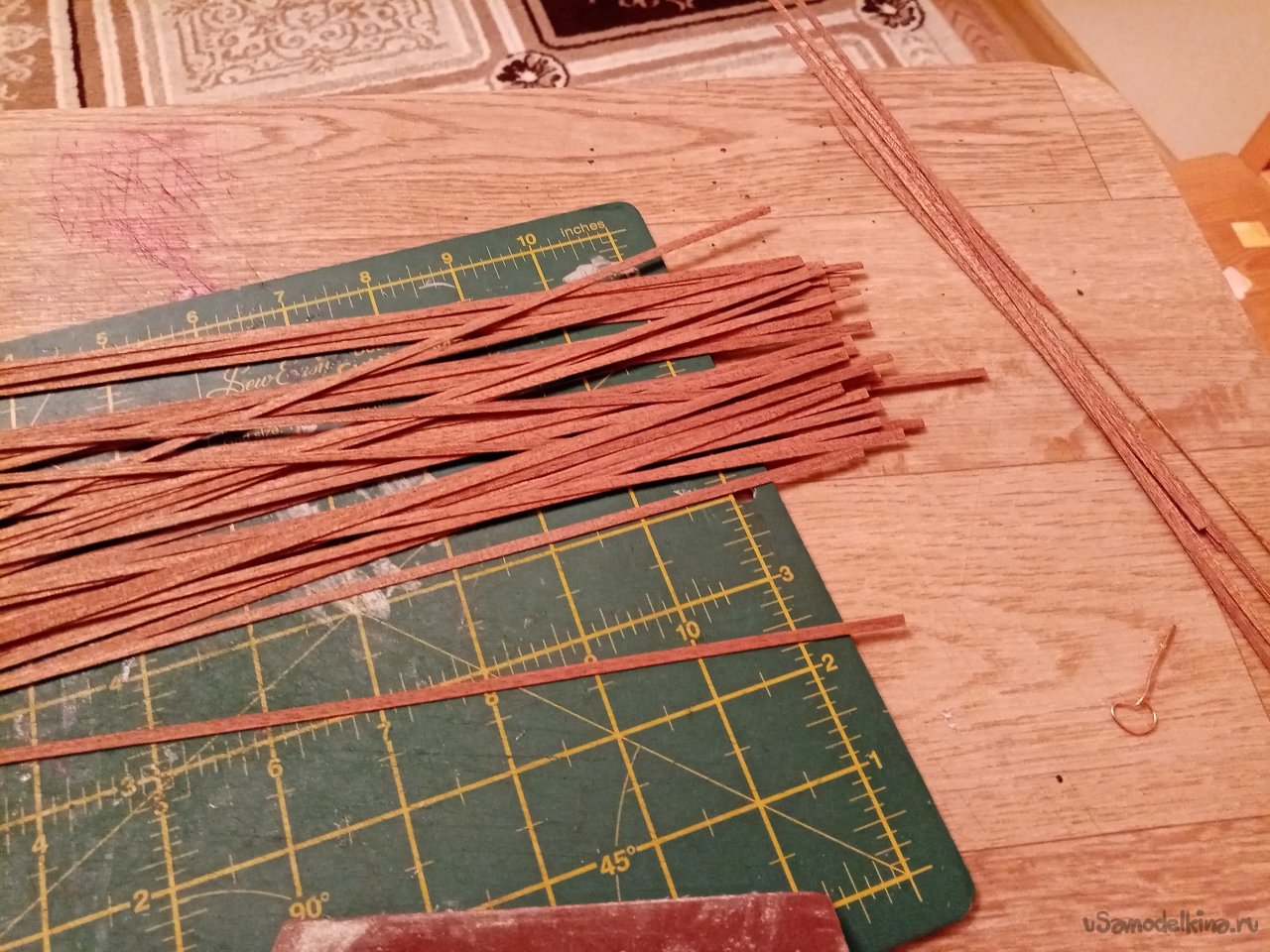 Мне нужно соединить рейки подлине. Не хватает полностью приклеить ряд на корпус. Устанавливаю кончик рейки на стапели и отрезаю под установленным углом острым треугольным ножом. Ответный кончик второй рейки также отрезаю под углом. У меня получается абсолютно одинаковый угол необходимый для склейки рее по длине корпуса.