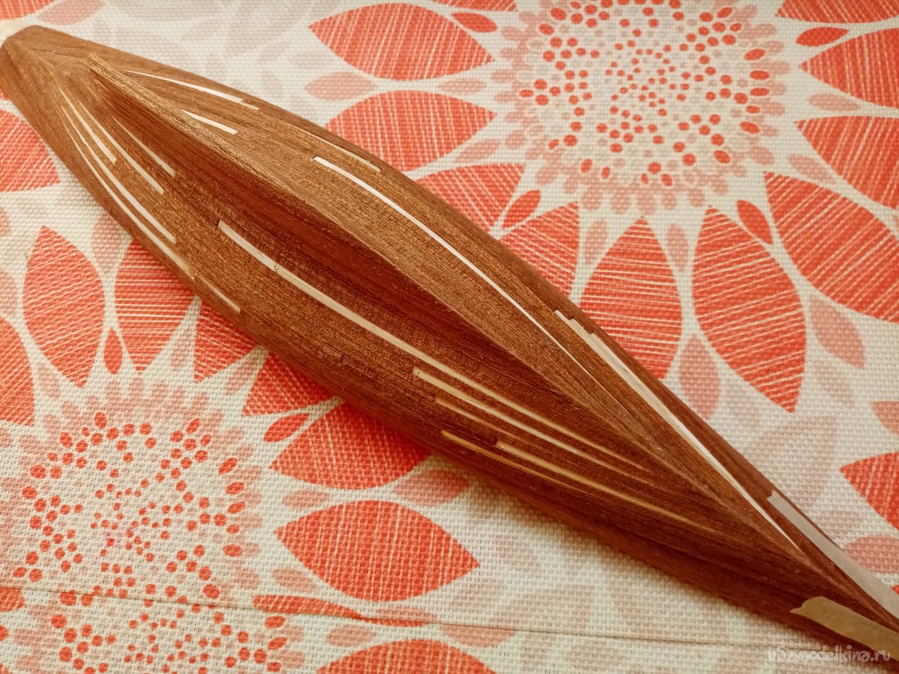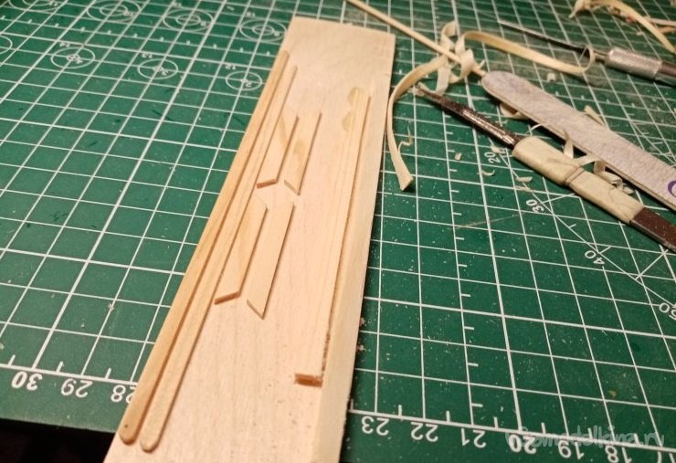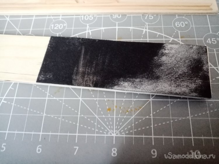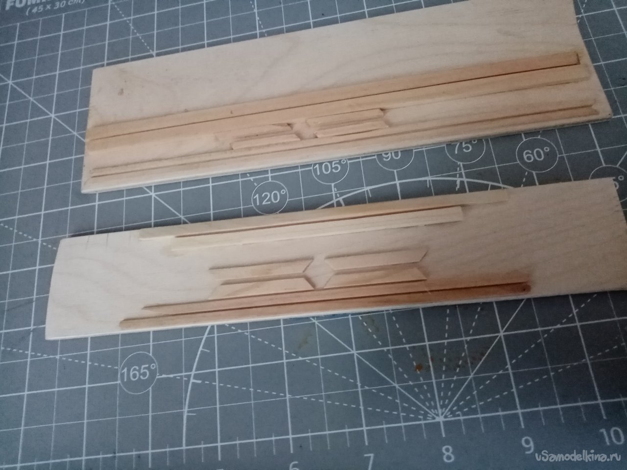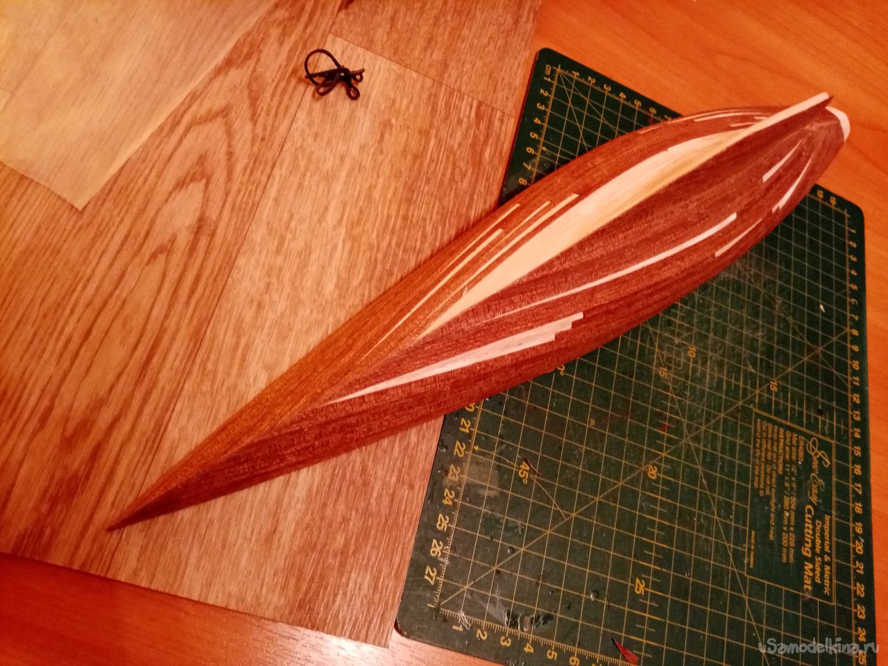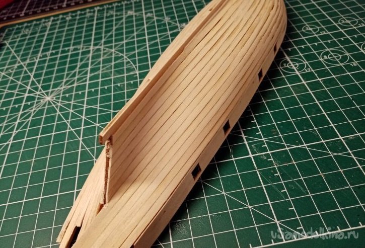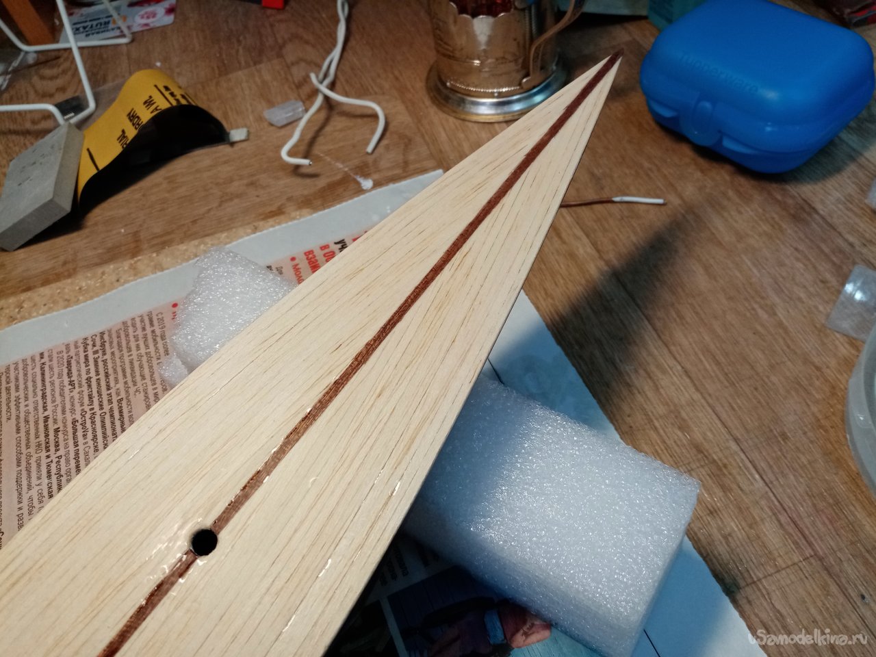 Мне нужно соединить рейки подлине. Не хватает полностью приклеить ряд на корпус. Устанавливаю кончик рейки на стапели и отрезаю под установленным углом острым треугольным ножом. Ответный кончик второй рейки также отрезаю под углом. У меня получается абсолютно одинаковый угол необходимый для склейки рее по длине корпуса.