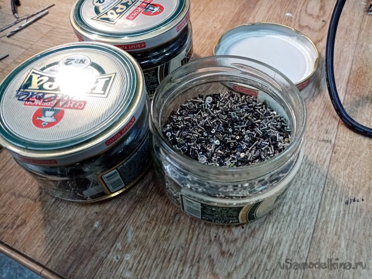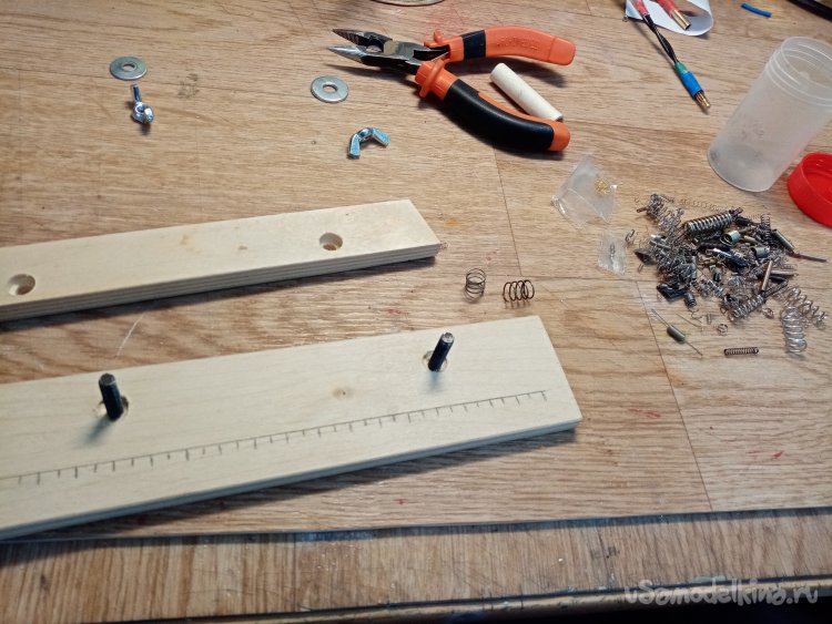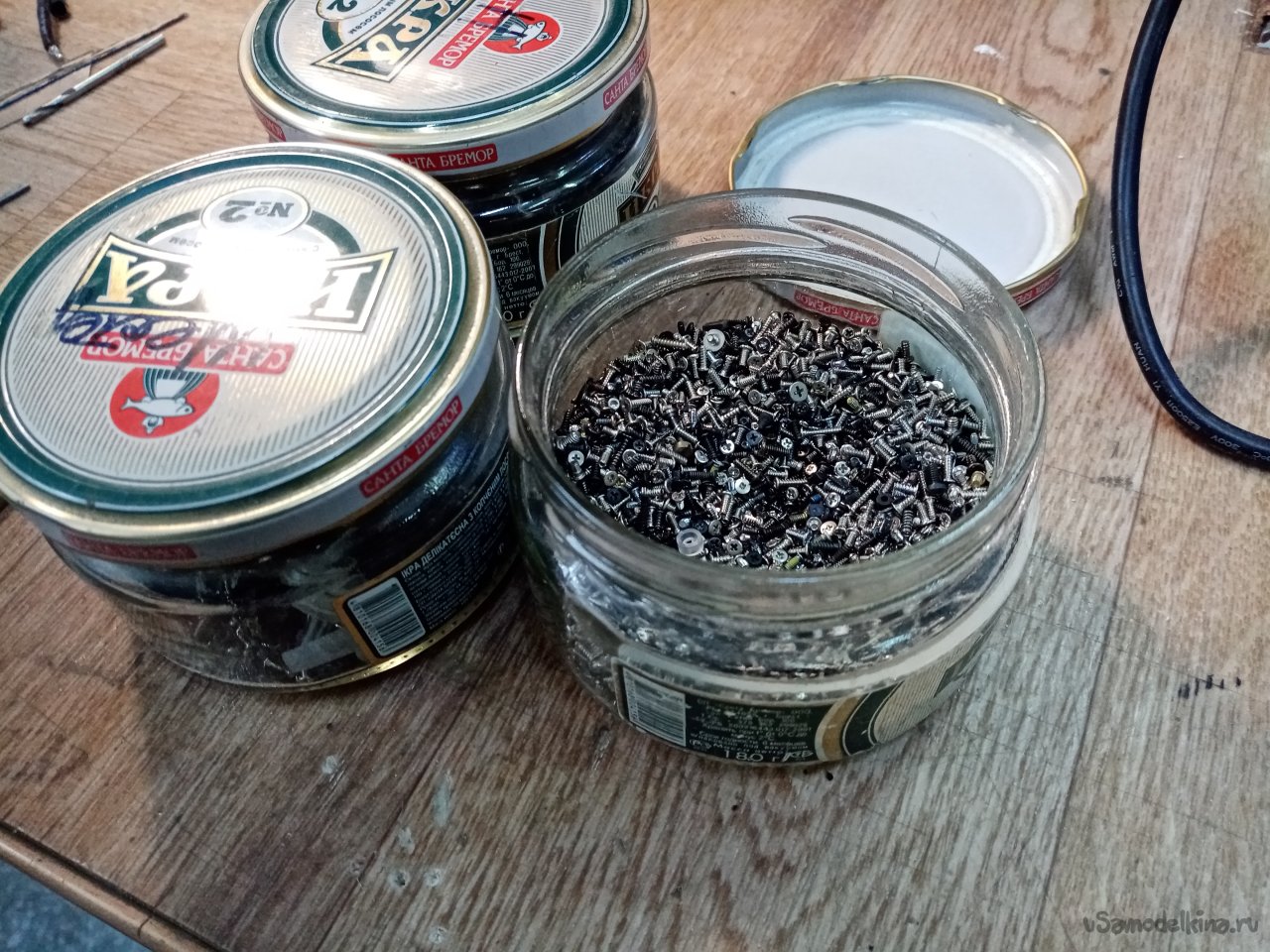 И так приступаю. Первое приспособление-зажим для отрезания реек под нужным углом схождения. Так его назвал. Изначально довольно быстро его собрал. Но работать было неудобно поднимать планку опускать и зажимать рейку обшивки. Решил немного модернизировать. Верхняя и нижняя зажимная планки изготовлены из 8 миллиметровой шлифованной фанеры. Внутри нужно будет установить пружины. Которые будут выдавливать вверх планку при откручивании фиксирующих барашков. Извлекаю несколько баночек. В одной из них находятся всякие пружинки, очень нужные в определенных условиях. Выбираю подходящего диаметра и длины.