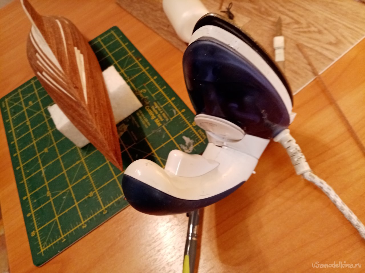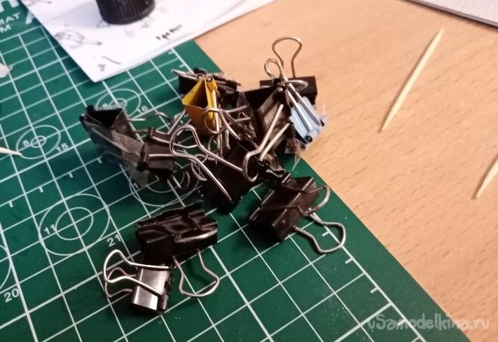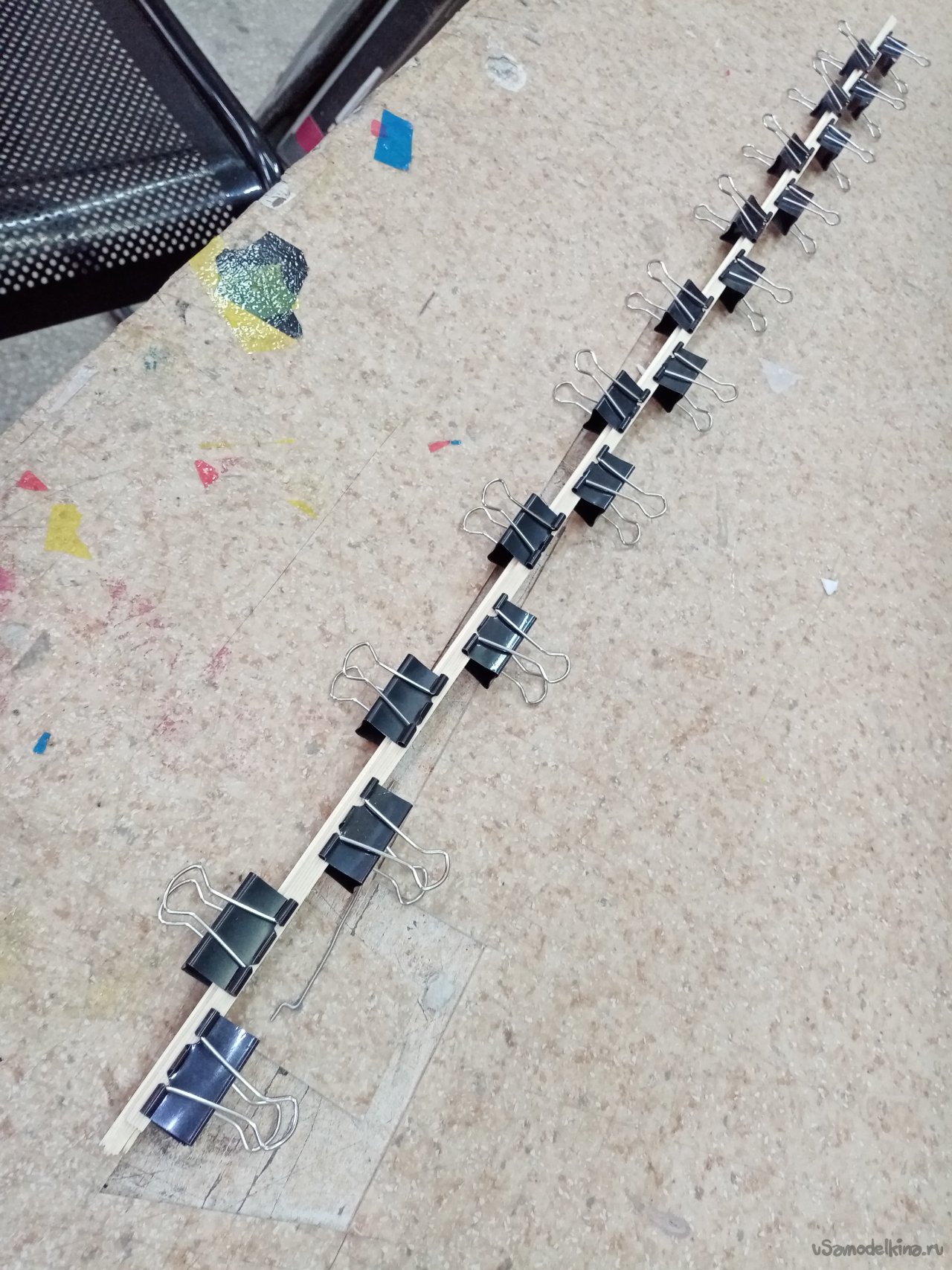 В нужном месте использовал и прямые зажимы для прижатия реек и склеивания частей. Вот мачту собрал из отдельных реек и склеил ПВА. Зажал как нужно.