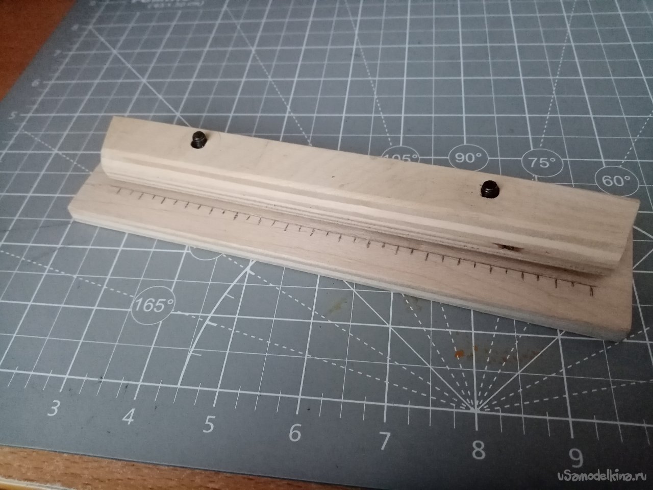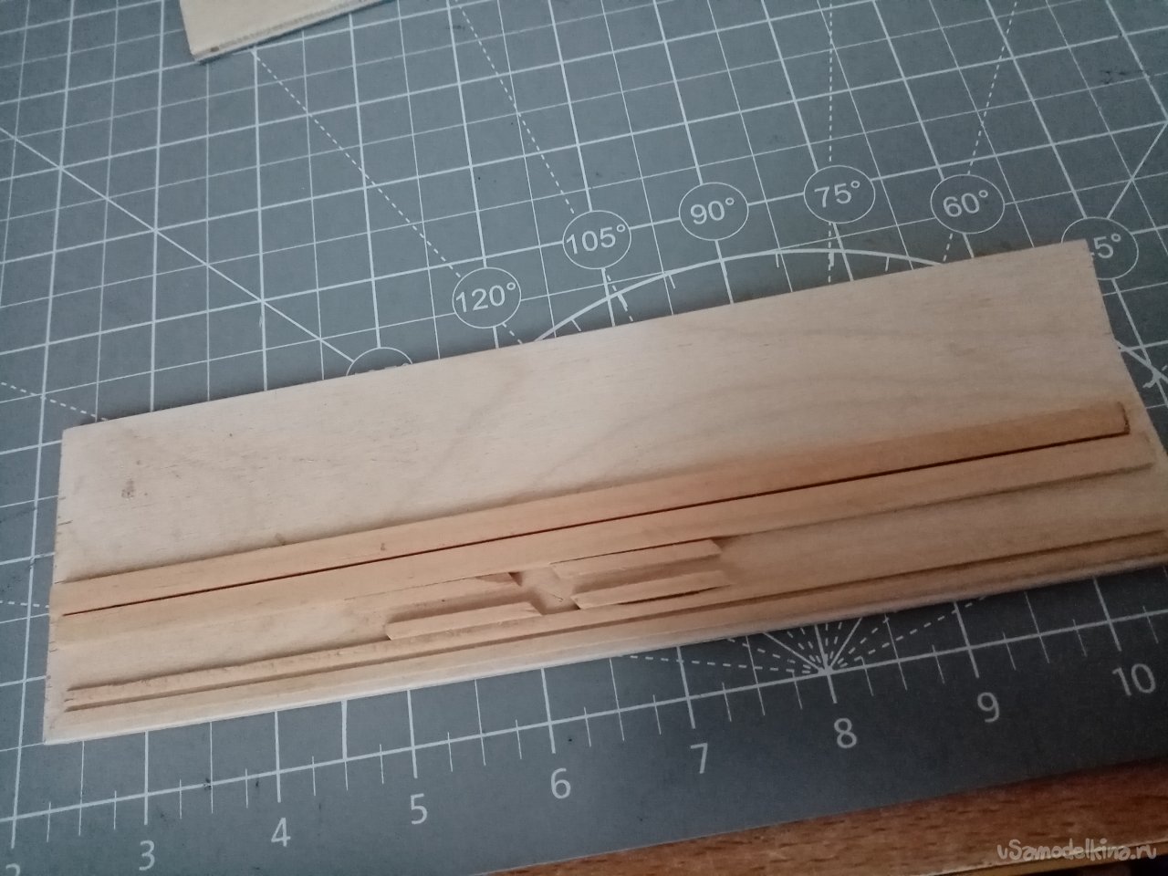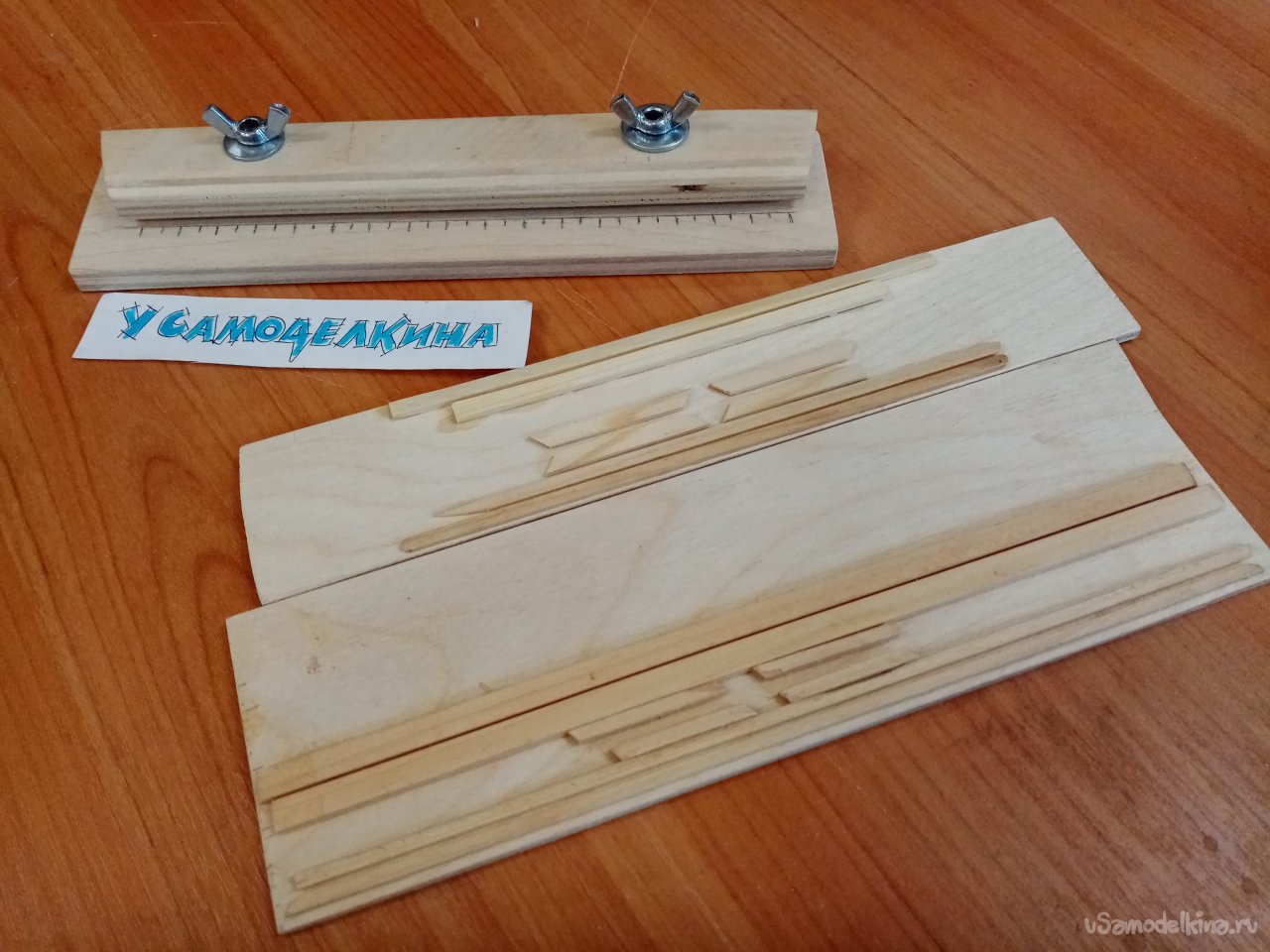Второе приспособление предназначено для формирования точных стыков реек внутренней или первоначальной обшивки корпуса. Изготовил из отрезка шлифованной фанеры толщиной в 6 миллиметров. Выпиливаю нужный размер на циркулярной пиле. Это основание. Все размеры подгоняю под рейки, которые использую в данный момент. Вообще-то это достаточно стандартный вариант внутренней и внешней обшивки данного масштаба. Если перейду в другой, не составит труда быстро изготовить еще один стапель. На основание приклеиваю обрезки реек от проекта. По ширине и высоте. По ширине изготовил рейки со скосами нужного угла. По высоте также использую обрезки. На основание все приклеено и стапель для работы готов.
