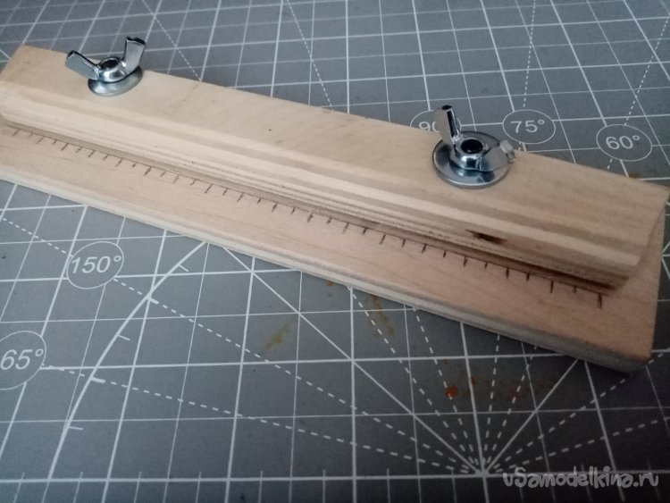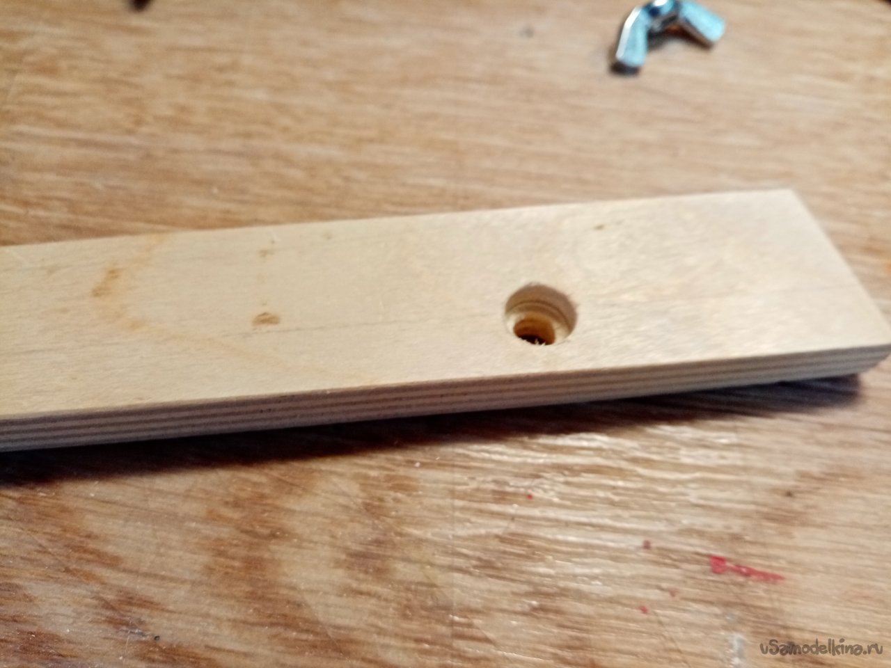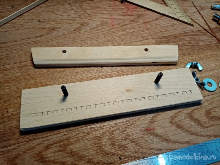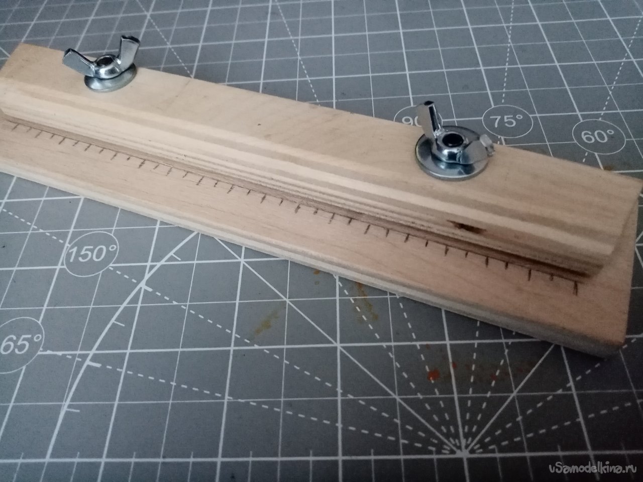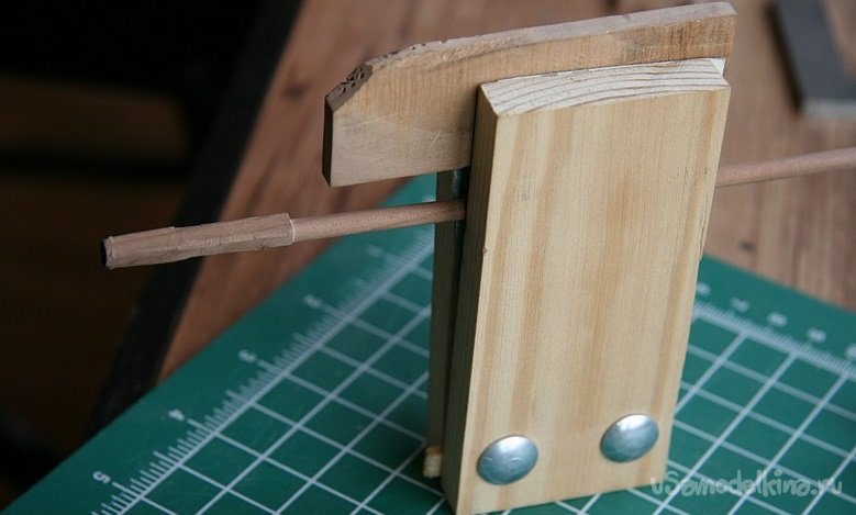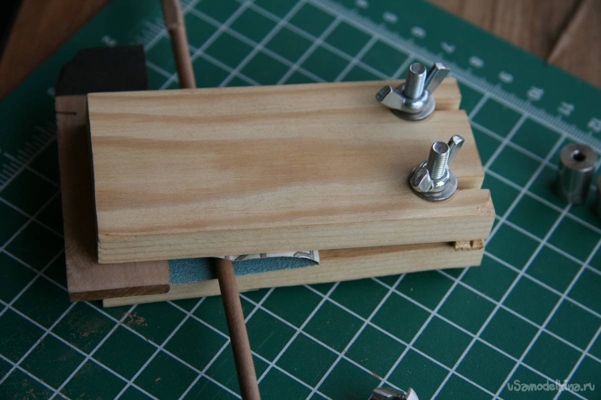 Небольшая струбцина для изготовления мачт и прочих круглых заготовок. Изготовлен из достаточно толстых заготовок и болтиков с барашками. Просто и эффективно. Внутрь щечек помещаю шкурку нужного зерна. Подбираю распорку по месту и вставляю заготовку, предварительно немного подогнанную по диаметру. Конец палочки зажимаю в дрель, начинаю процесс формирования круглой заготовки. Перемещая её по зажиму можно просто сформировать сужение заготовки к нужному концу.