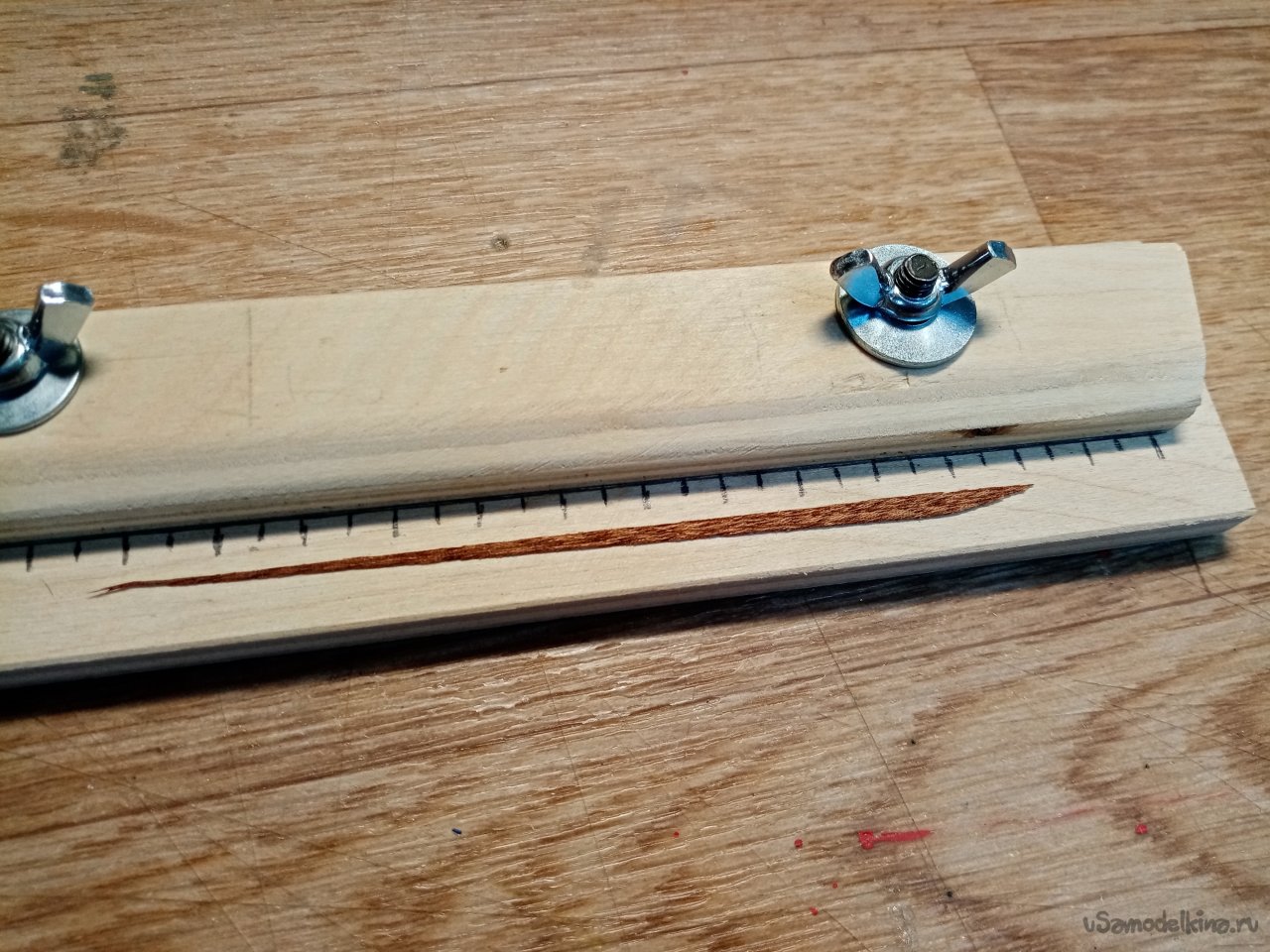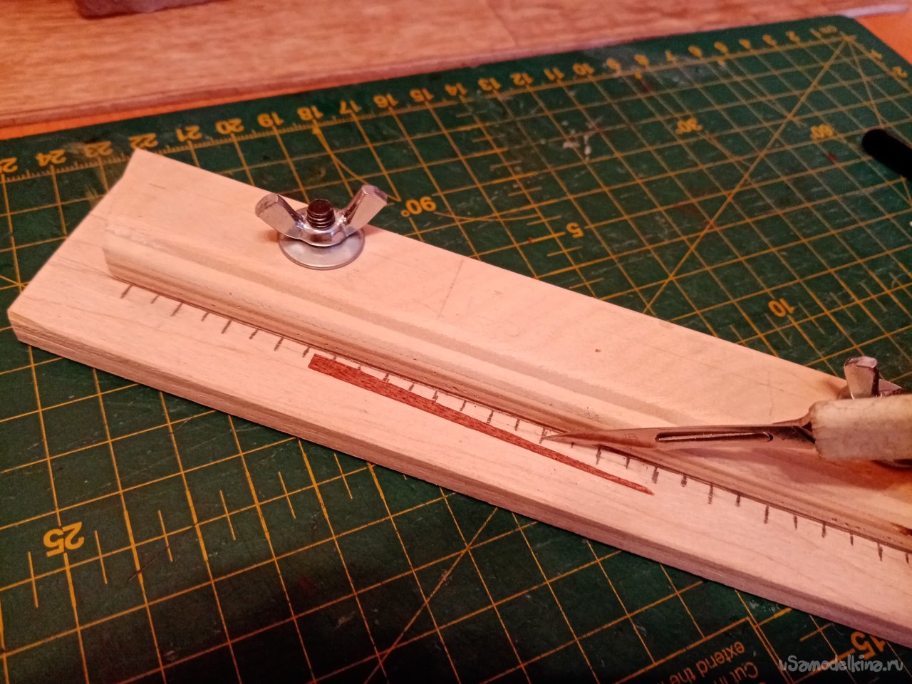 Как работает прижим. Мне нужно срезать на конус тонкую планку внешней обшивки из красного дерева. Размечаю нужную линию. Зажимаю верхней планкой и отрезаю острым скальпелем.