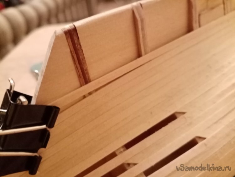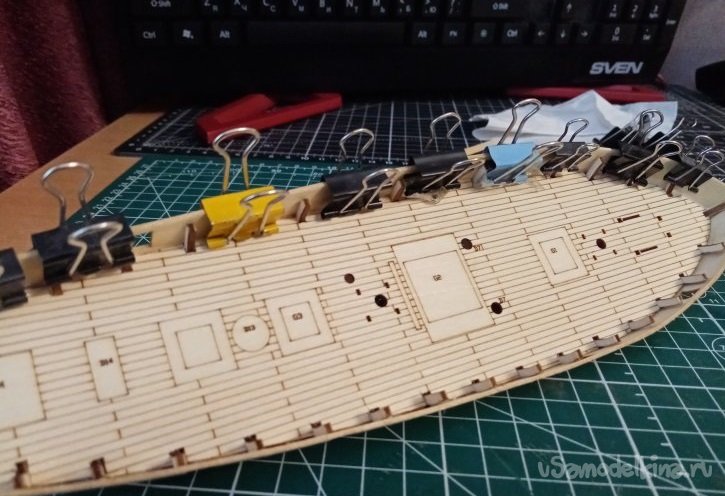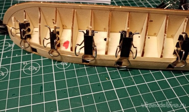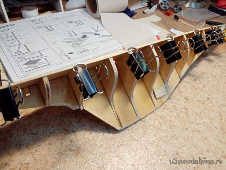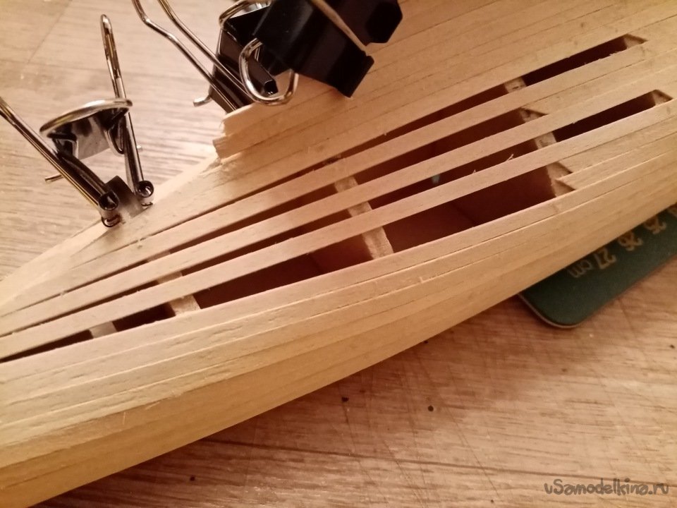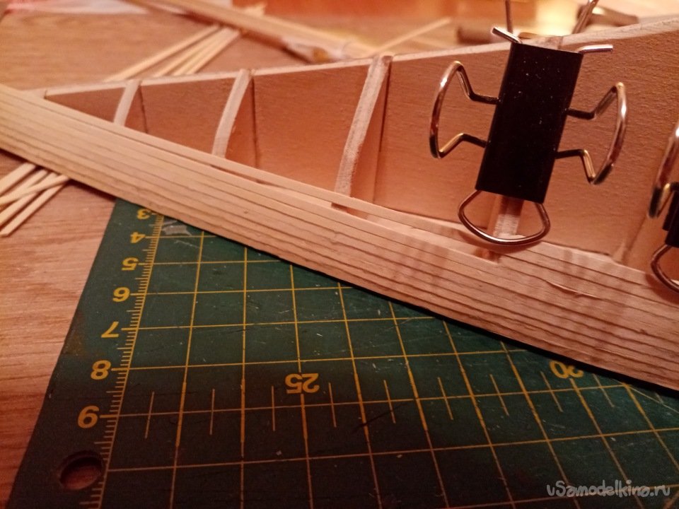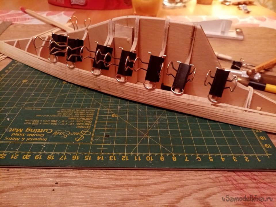 Как уже говорил выше сложная и ответственная процедура при изготовлении модели обшивка корпуса рейками. Установка внутренней силовой обшивки и внешней декоративной. Для прижимания реек обшивки к шпангоутом изготовил простой фиксирующий прижим из канцелярских скрепок. Так это выглядит в работе.