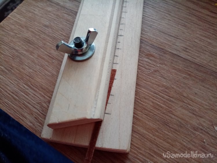 Немного переделал простой канцелярский нож. Вставил в зажим проставки нужного размера и установил лезвия. Такая конструкция позволяет сразу нарезать несколько реек обшивки из тонкого шпона.