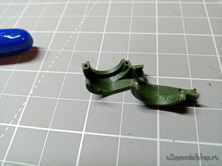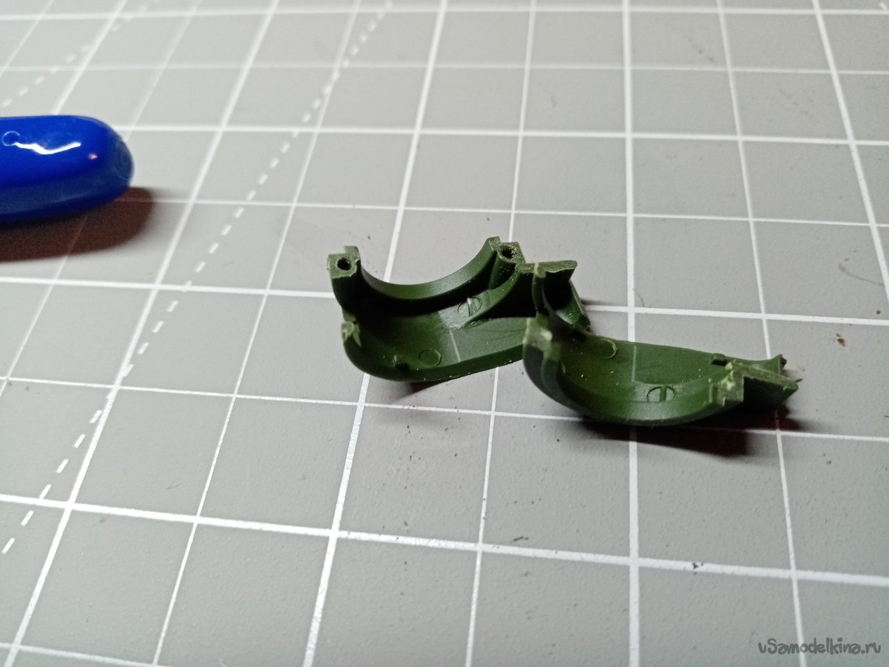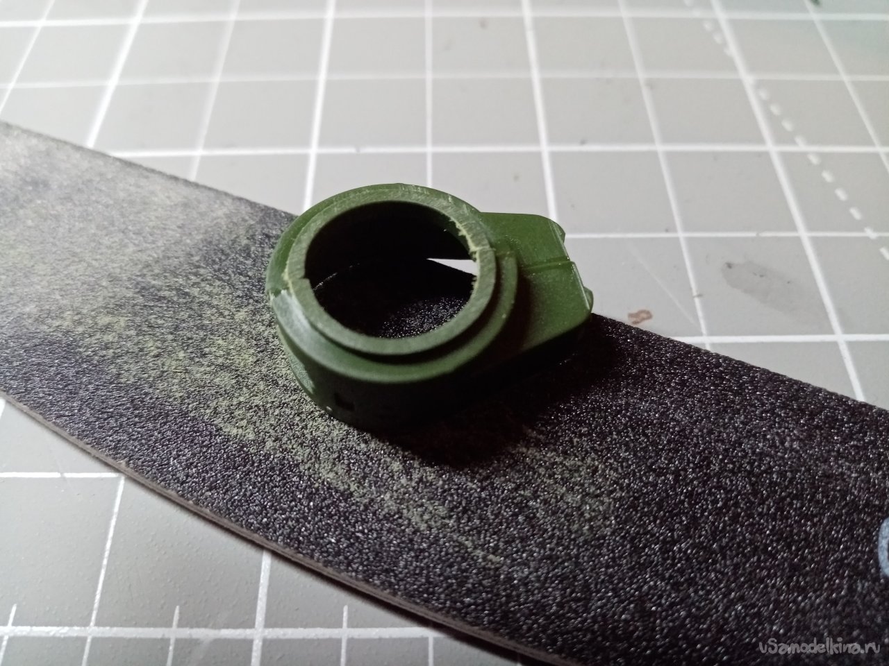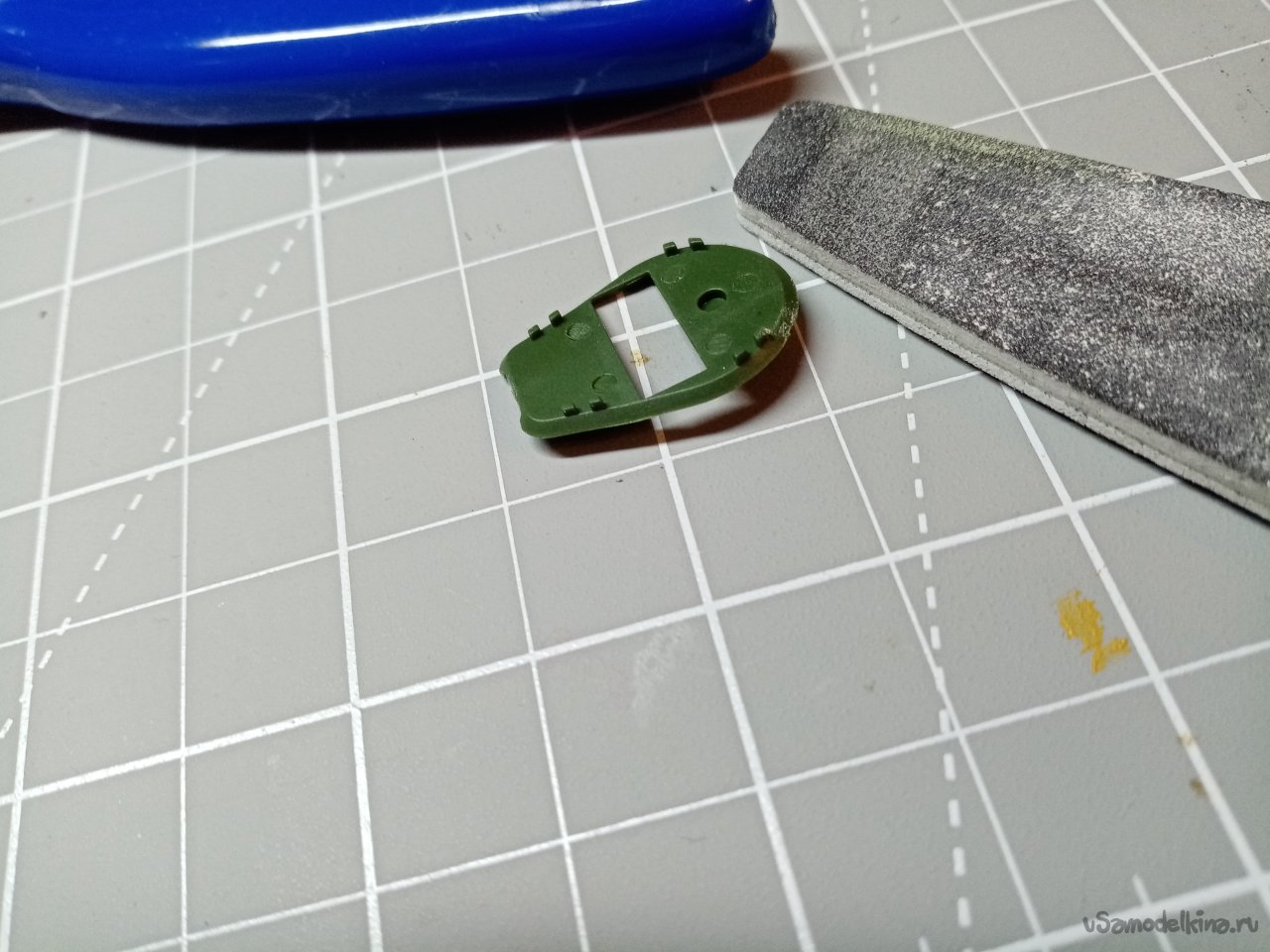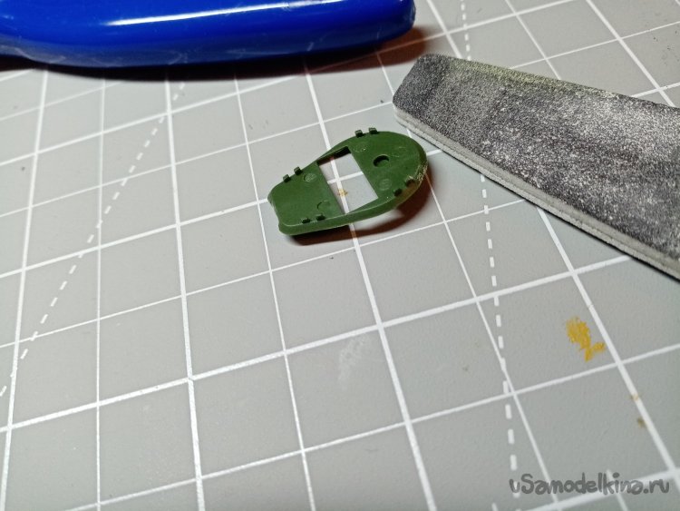 С первых действий переношу работу на башню. Отрезаю от литниковой рамки все детали нужные в этом случае. Внимательно просматриваю части башни. Вижу, что не сойдутся в задней части немного. Поэтому принимаю решение зачистить места стыка половинок. Заодно срезаю выступы, которые по идее должны облегчить позиционирование половинок. Немного не совпадает. Шлифую на наждаке для маникюра. Недавно попались мне на глаза такие штуки. Хорошо зарекомендовали себя в работе.