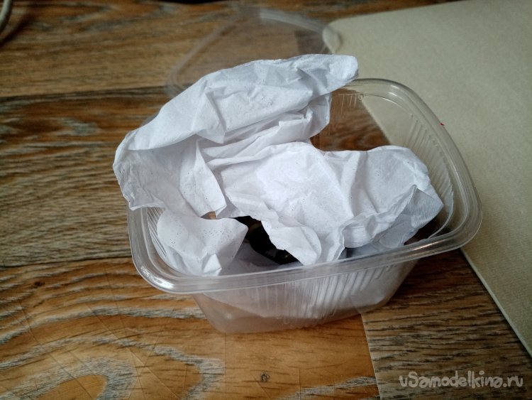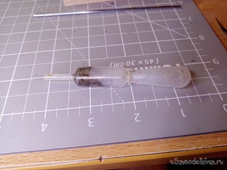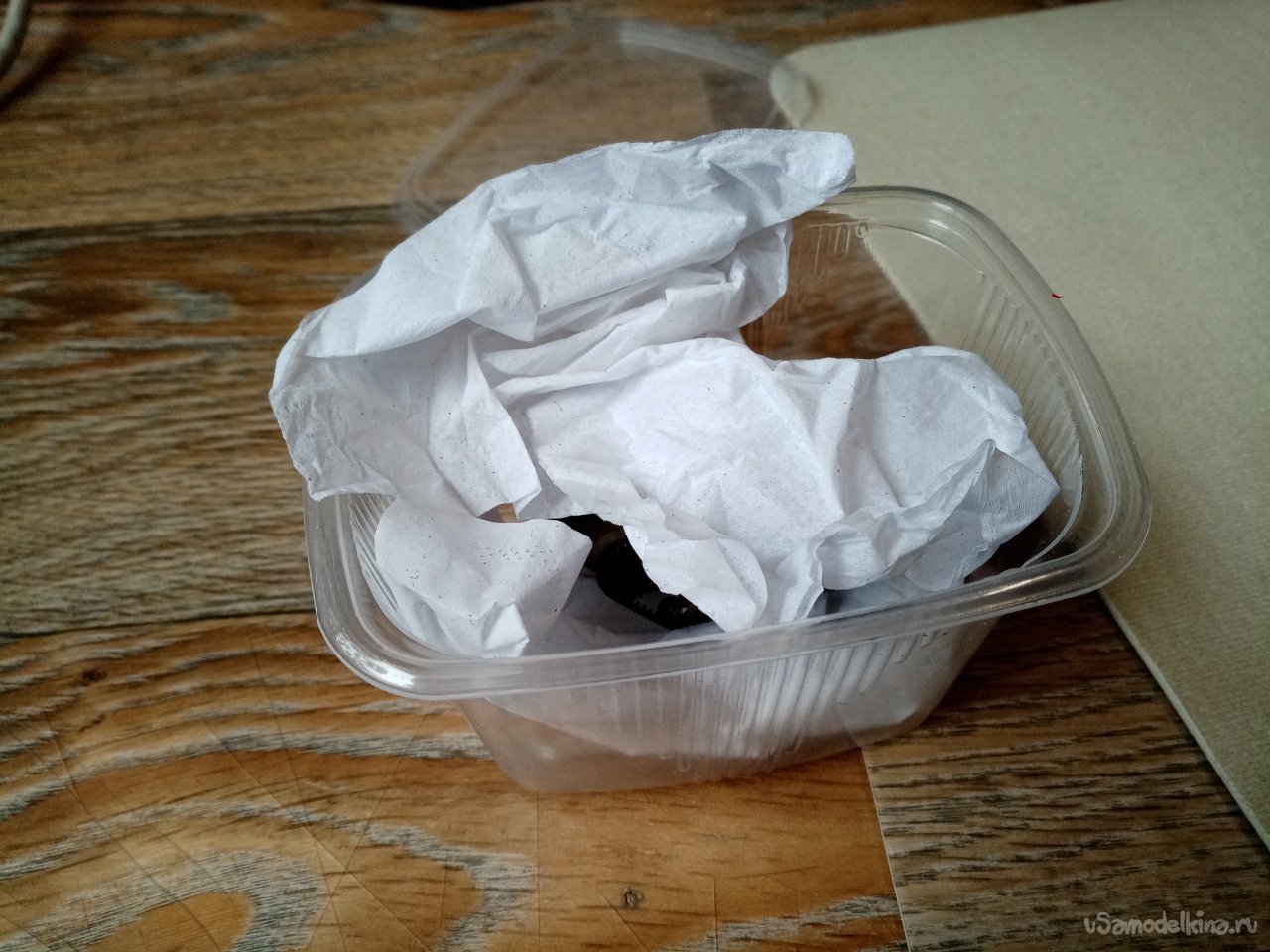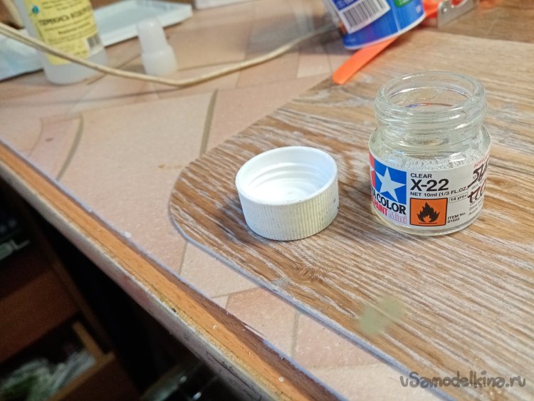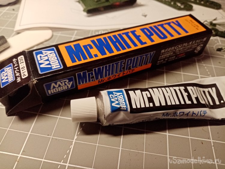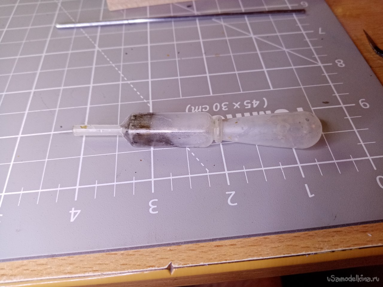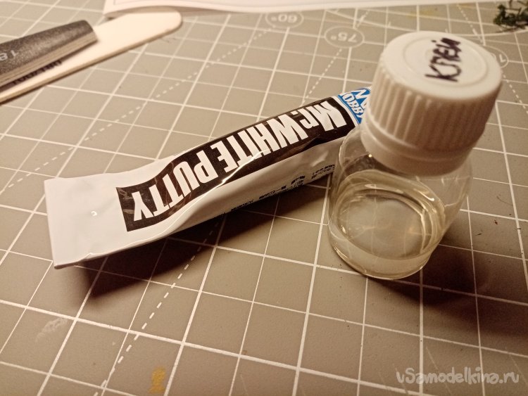 Извлекаю из коробочки фирменную шпаклевку. И привет, загустела. Понюхал тюбик, пахнет клеем для моделей. Иду на риск. При помощи пипетки наливаю в тюбик немного клея от «звезды», размешиваю состав внутри и оставляю расходиться клей.