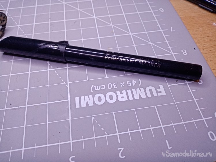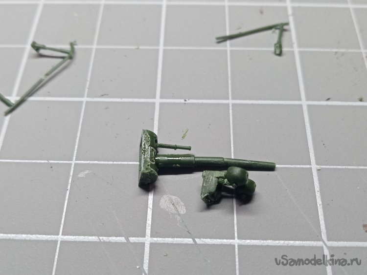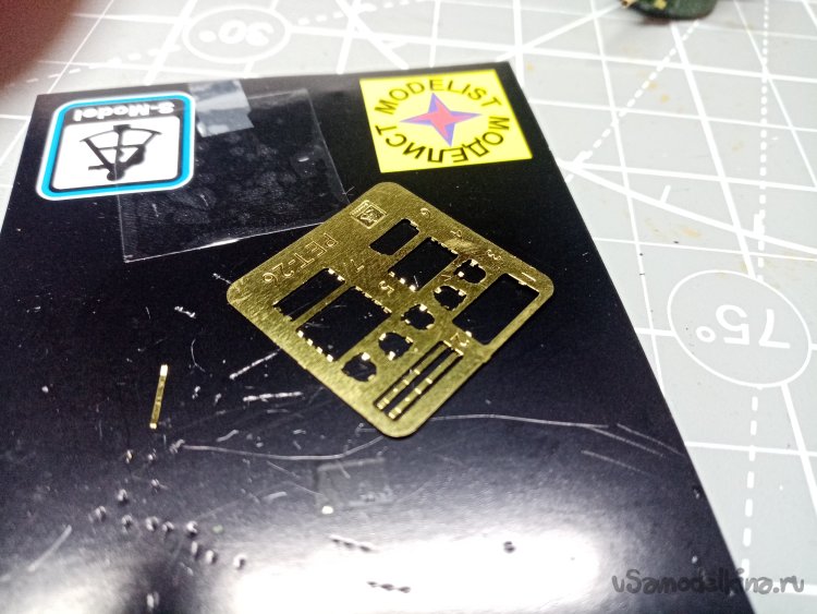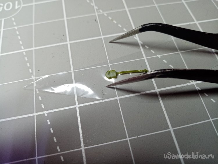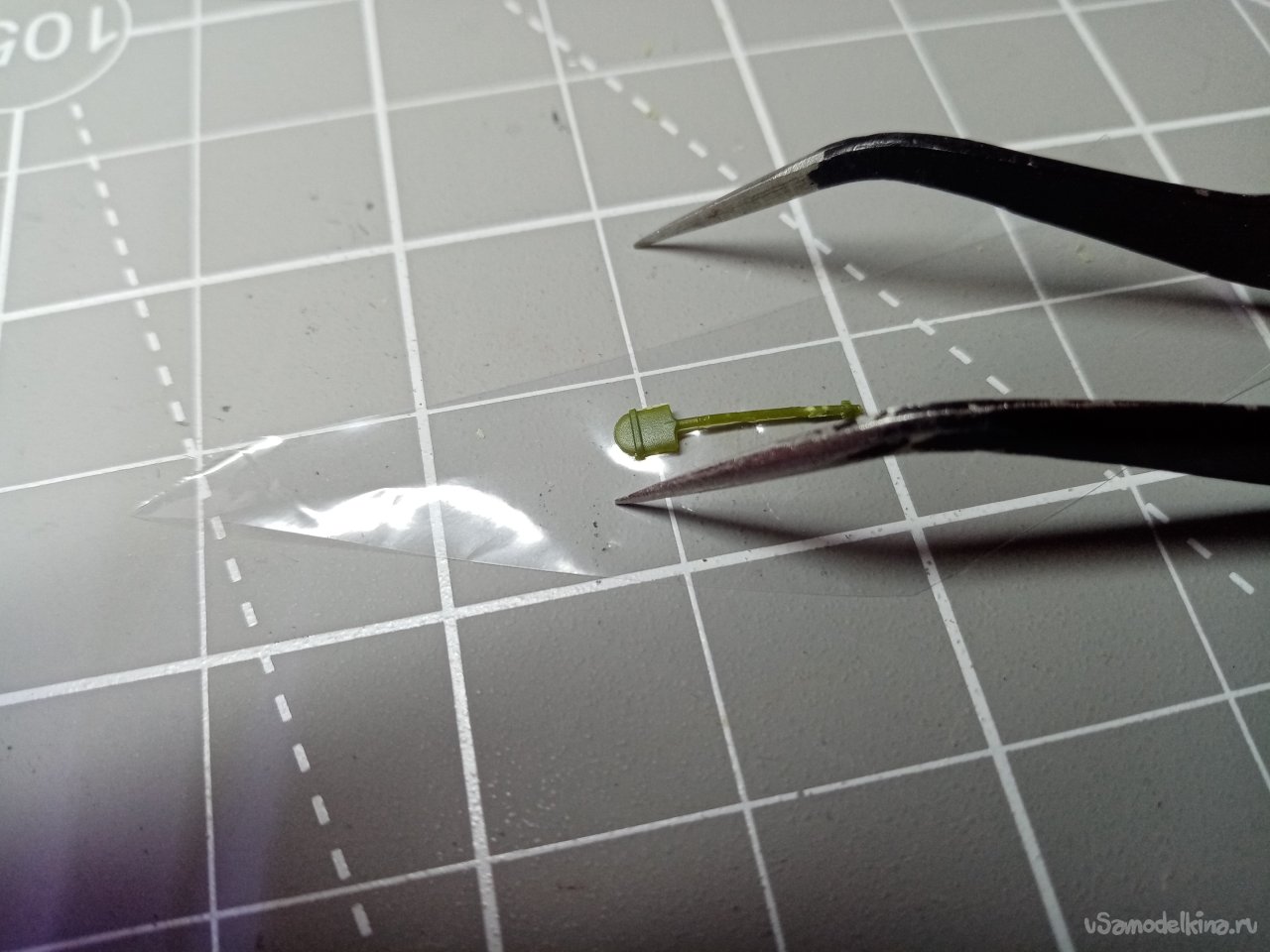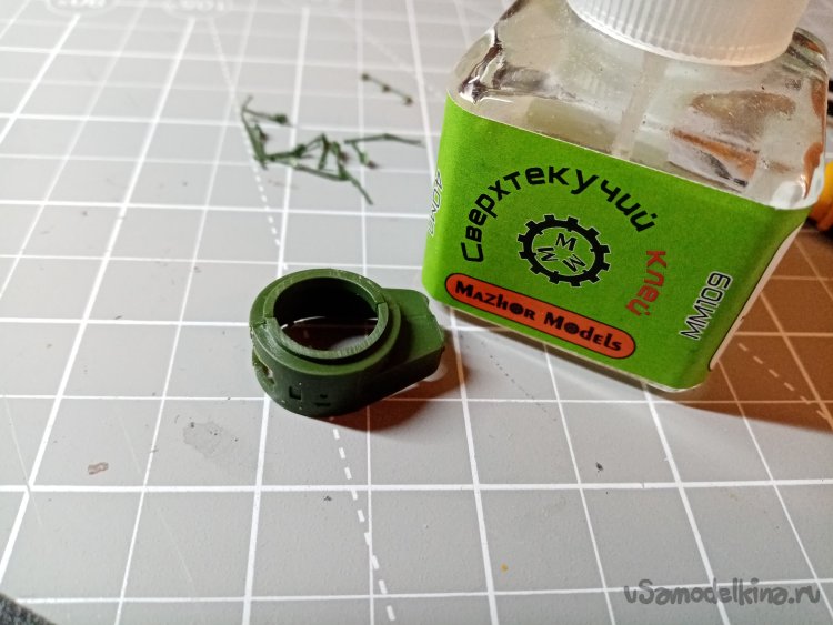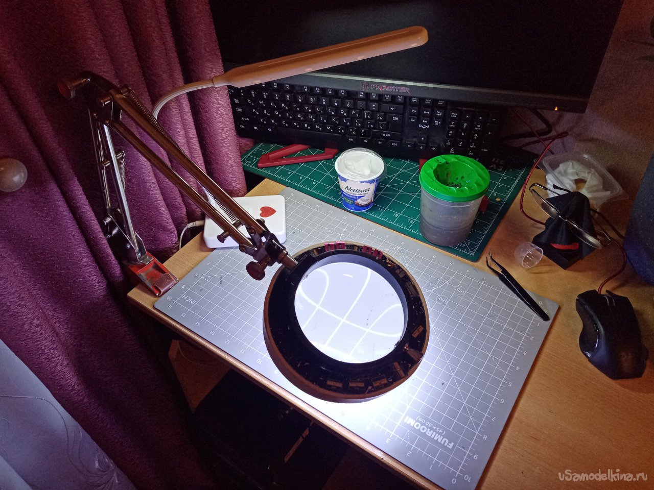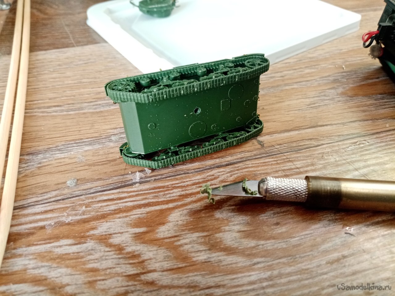 Пока пробую как приклеить гусеницы. Есть немного облоя. Увеличиваю изображение при помощи своих ювелирных очков. Остались от прошлой жизни. Увеличение в пять раз самое то при работе с разной мелочью. Подрезаю все облой на гусеницах. Предпочитаю срезать лишнее, так чище будет. От шкурки иногда остаются волосы.