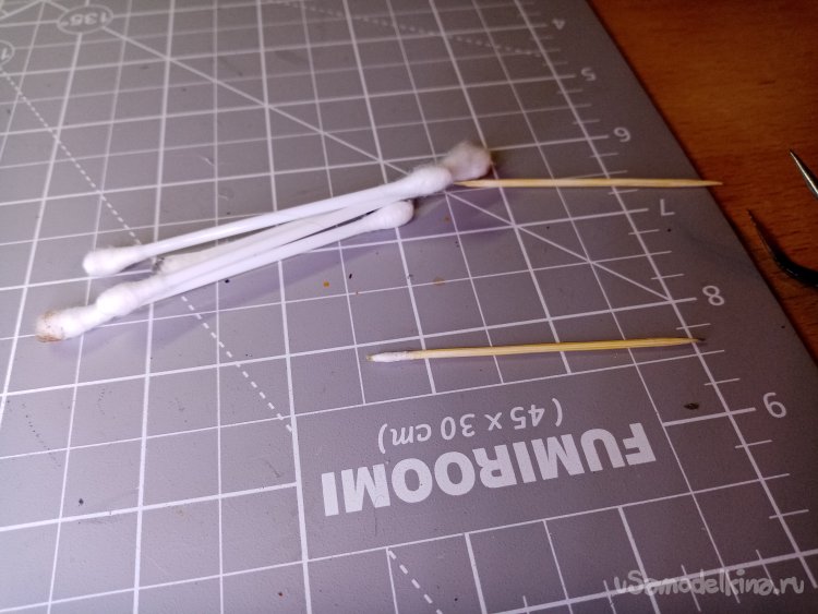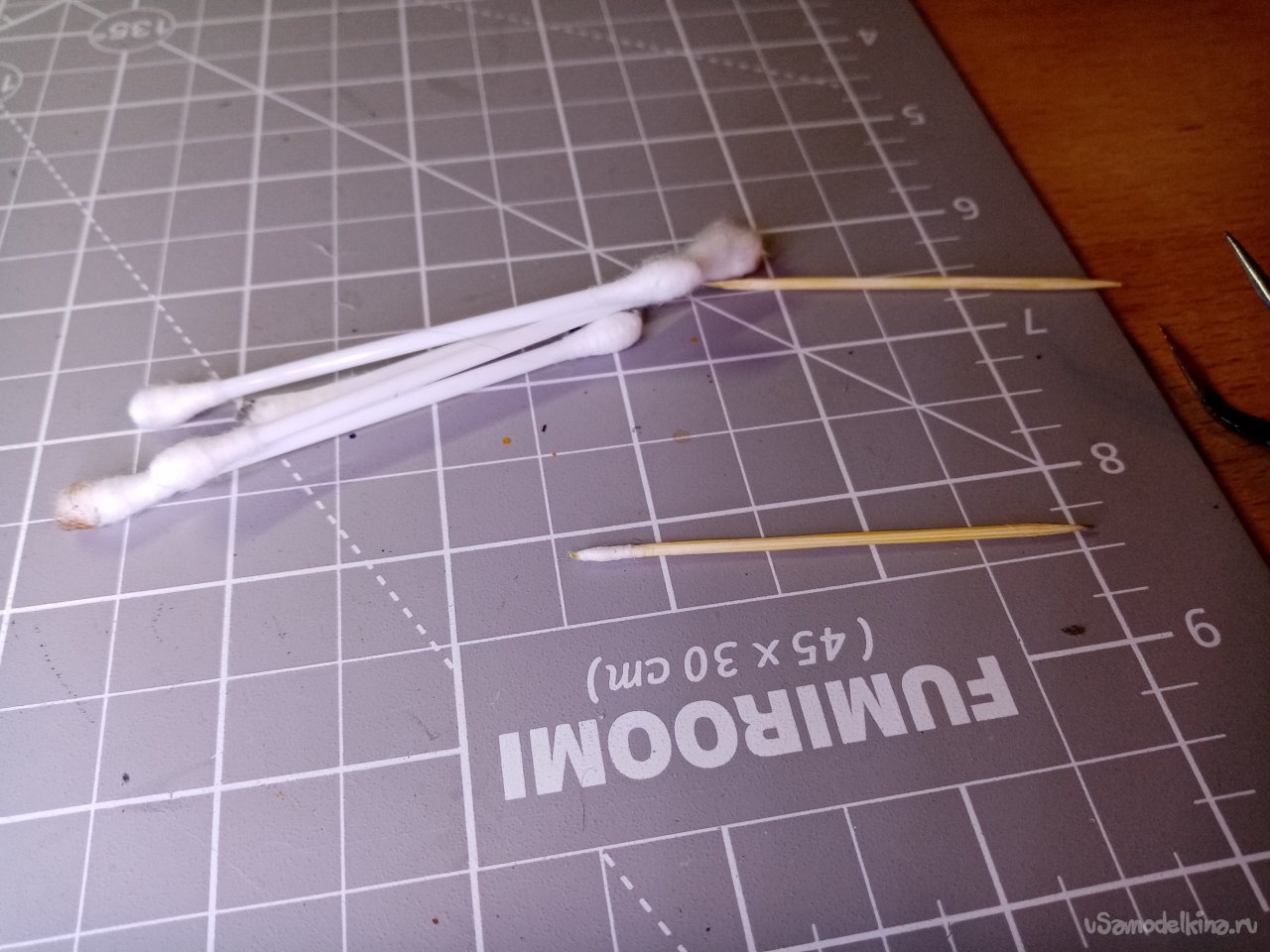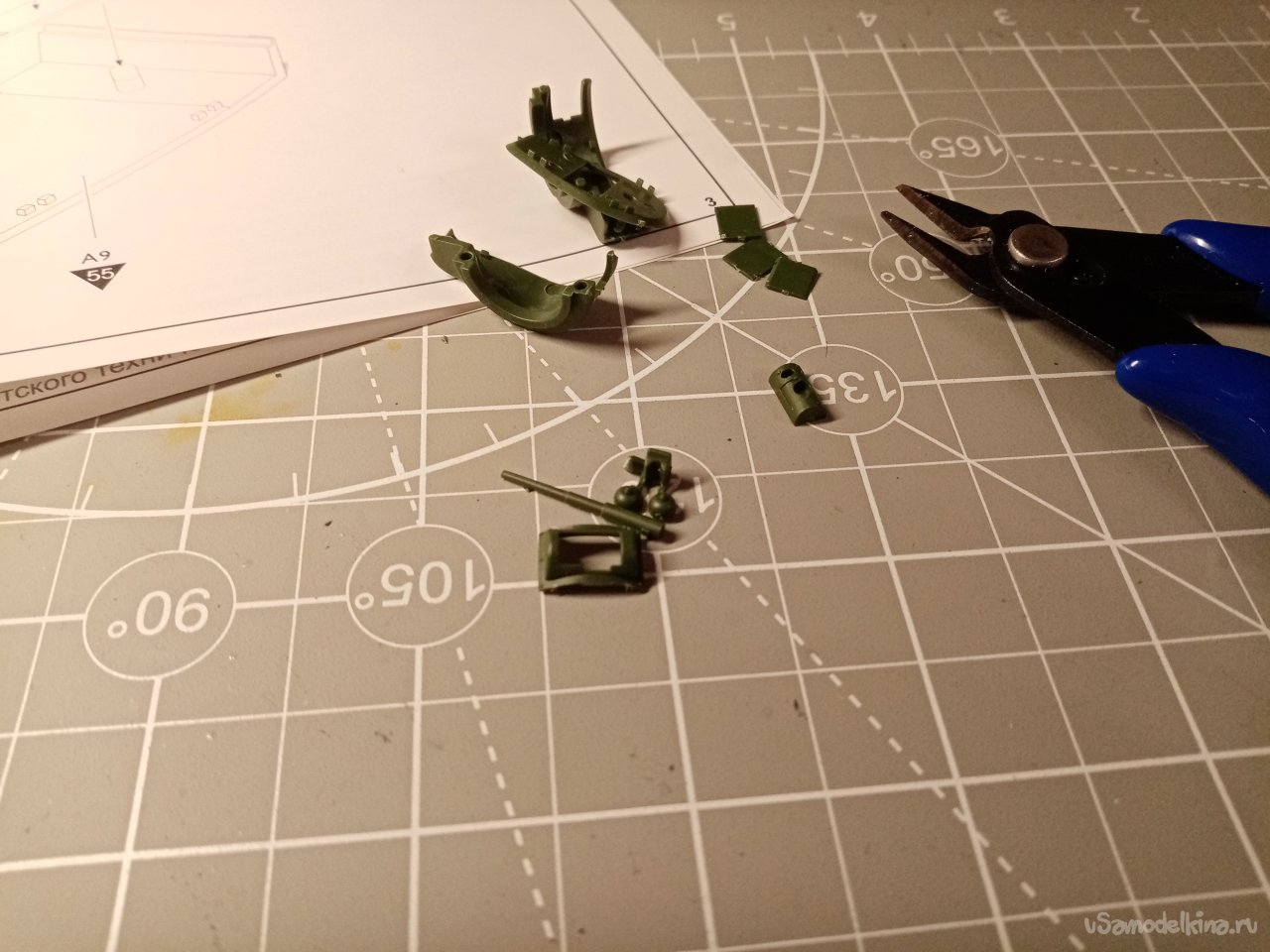По инструкции перехожу к мелочевке. Пила, лопата, топор. Такой внешний обвес модели. Отрезаю от литников осторожно маленькие и тоненькие детальки и приклеиваю на нужные места.