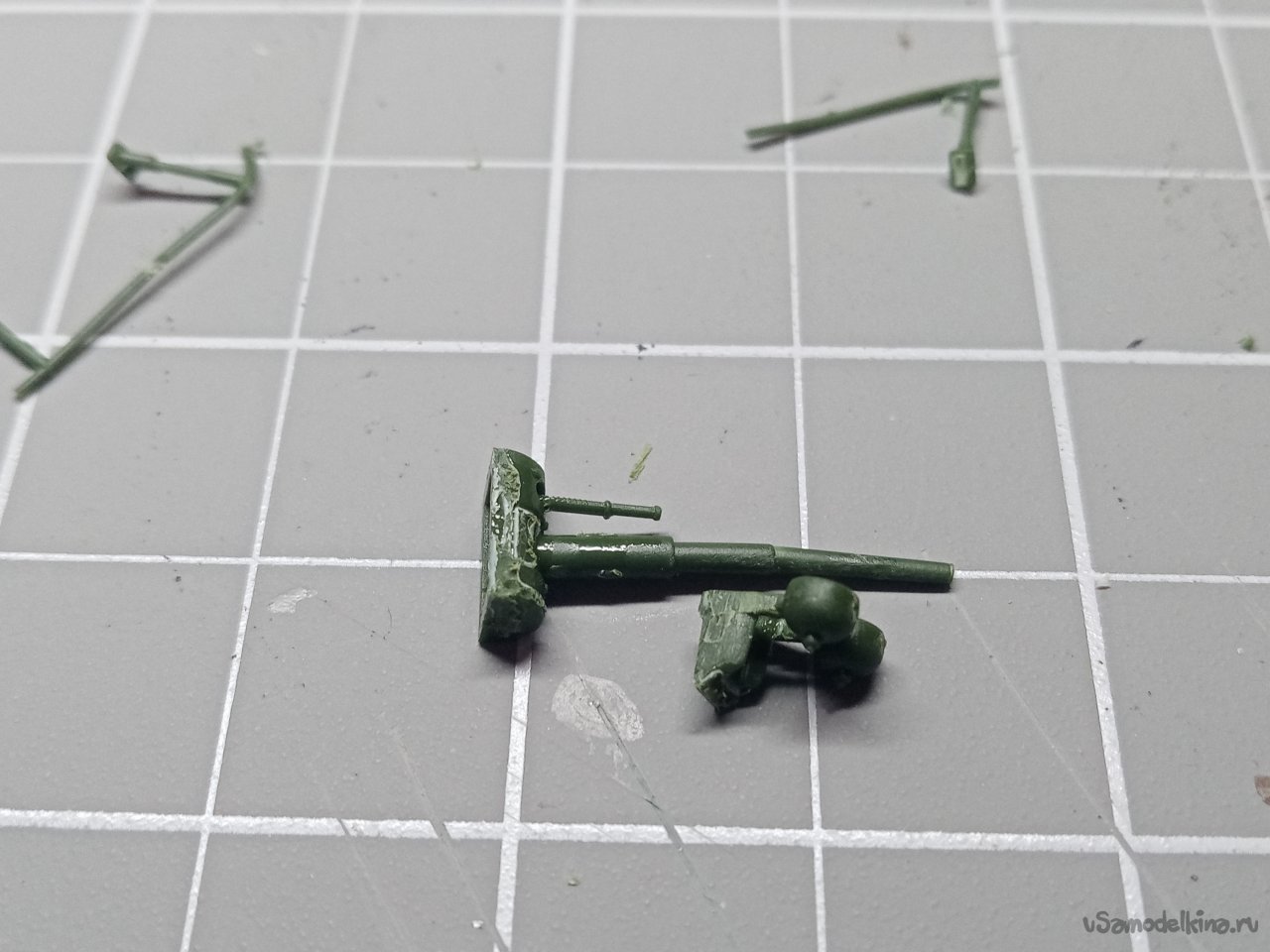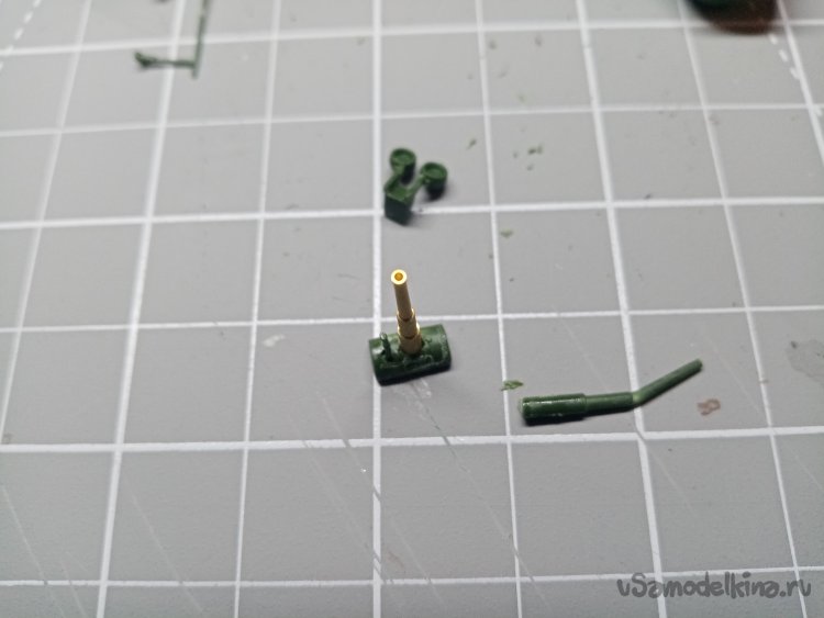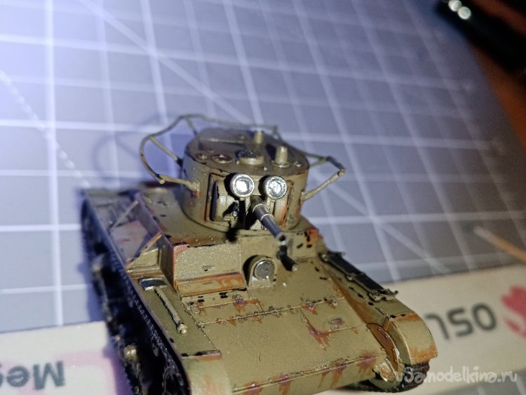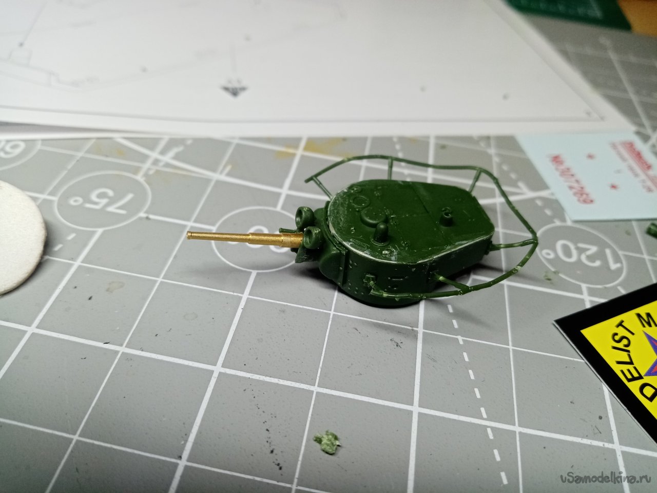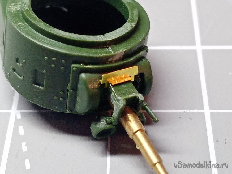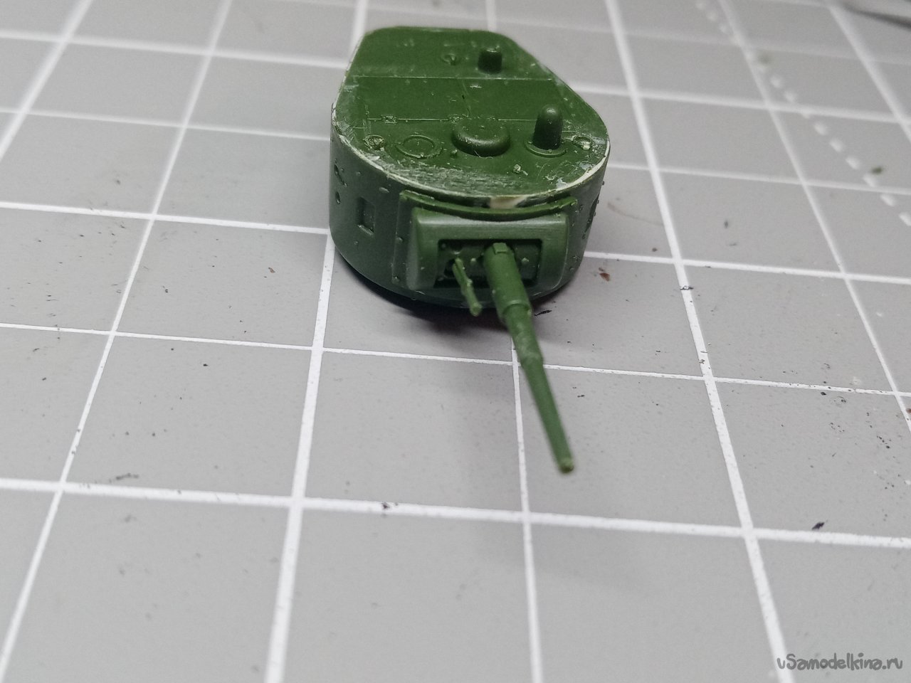 Осматриваю модель со всех сторон. Дополнительно приклеиваю на место фару на корпус фары на башню у ствола пушки. Сигнал.