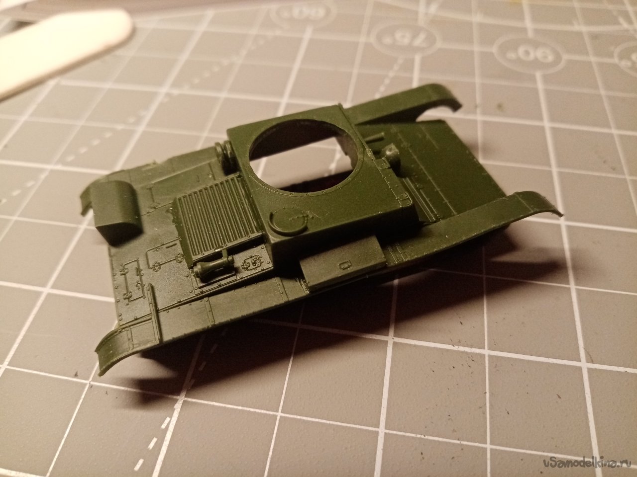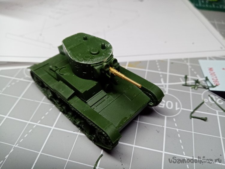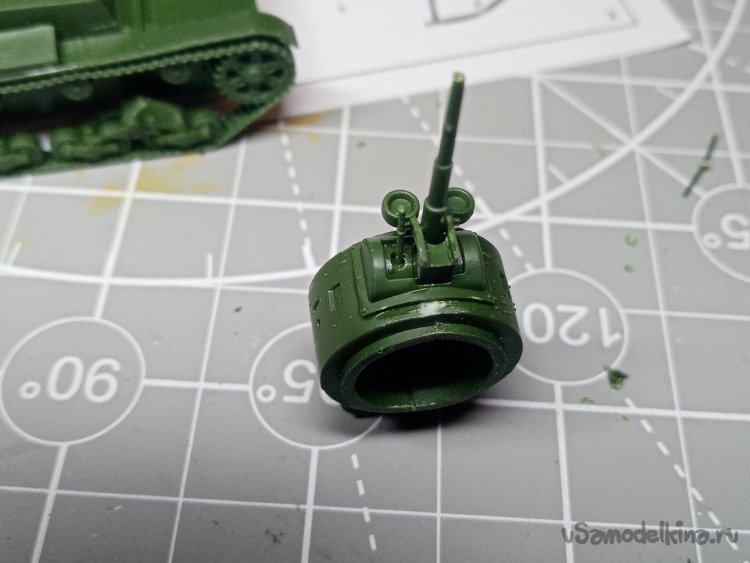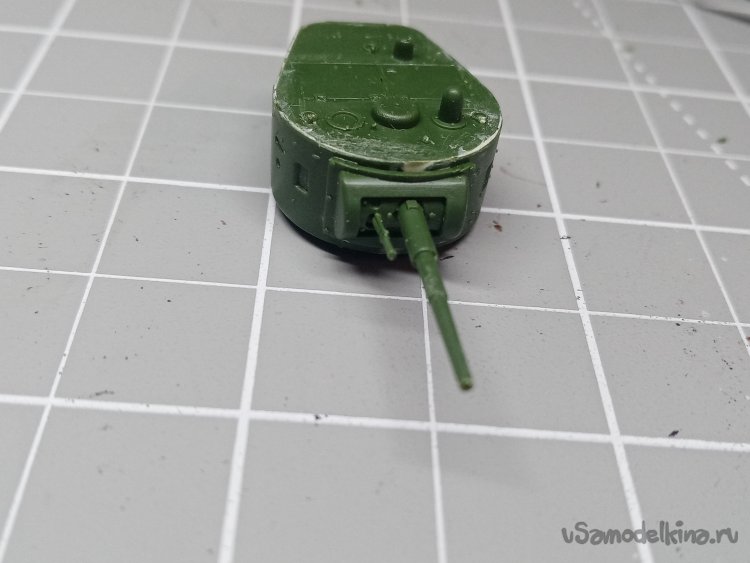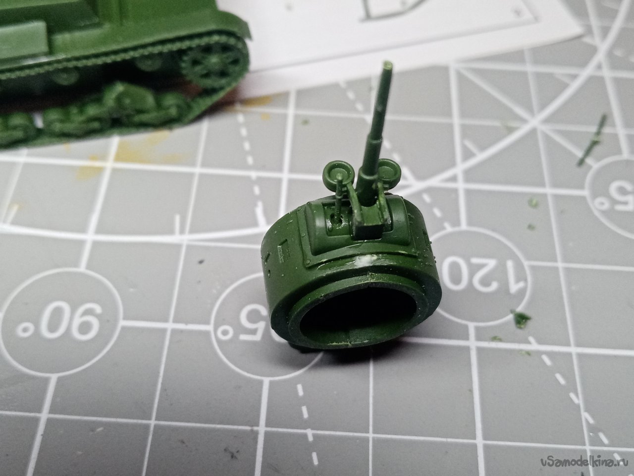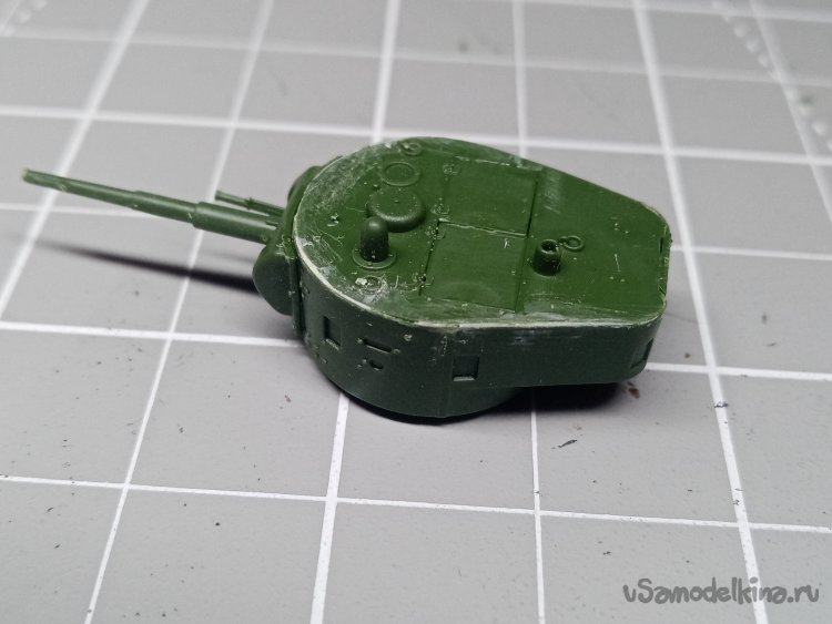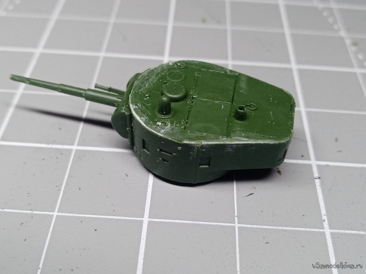Немного подгоняю крышку башки, тоже отлита немного криво. По верхнему шву никак не могу убрать трещину. Придется шпаклевать. Заодно приклеиваю маску и пушку с пулеметом. Практически все, нужно только разобраться с трещиной в крышке башни.