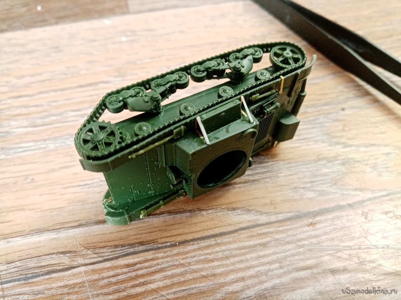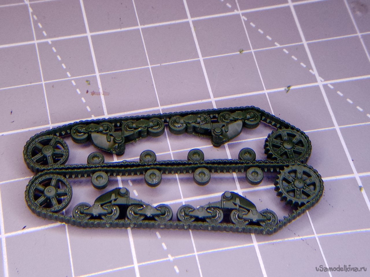 Слегка собираю танк в кучу. Хорошо смотрится, хоть и маленького размера. Отливки качественные. Пролиты все швы и брони и заклепки. На гусеницах катки и звенья тоже хорошего качества. Облой минимален.