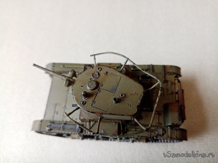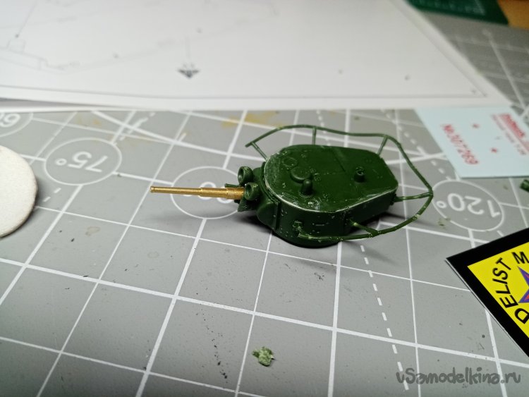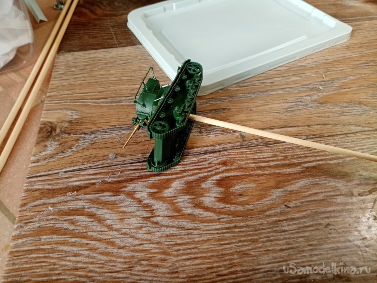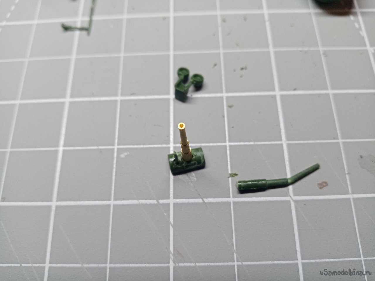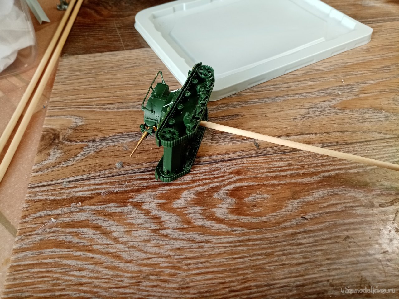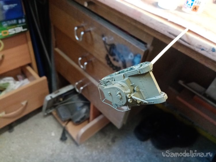Круговая антенна не пошла прямо развалилась в руках. С трудом собрал в кучу на башне. Захотел переделать из проволоки. Но такая кривая деталь придает немного реализма. Иначе получится идеальный танк.