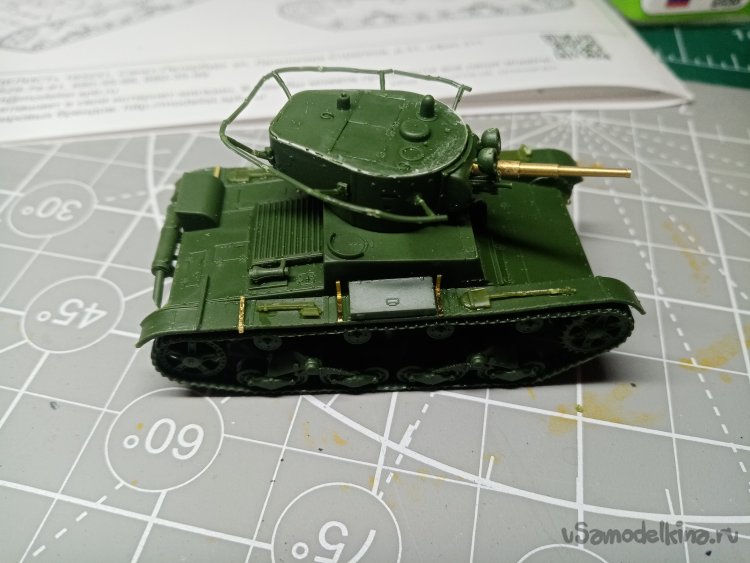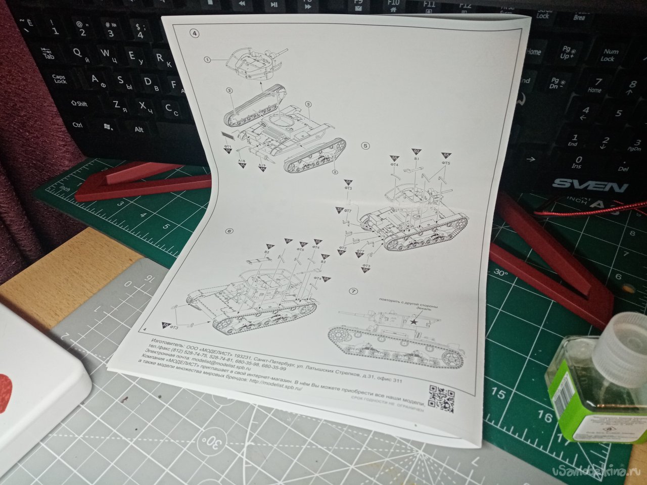 Организую свое рабочее место. Лампа подсветки и коврик для резки. Чего-то разошелся, купил и второй коврик. На зеленом плохо различаются зеленые детали. Заказал еще один черно серый вариант. Теперь любое сочетание можно хорошо разглядеть при работе. Да и вечером на светлом поле все хорошо видно. Перед работой просматриваю инструкцию по этой модели. Поскольку деталей критически мало, инструкция не многословная. Но не нужно мне самонадеянности и кажущейся простоты. Читаю и сразу намечаю свои шаги в изготовлении танка. В некоторых местах можно отступить или передвинуть порядок склейки деталей.