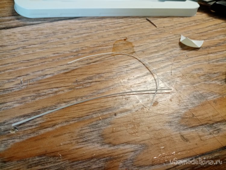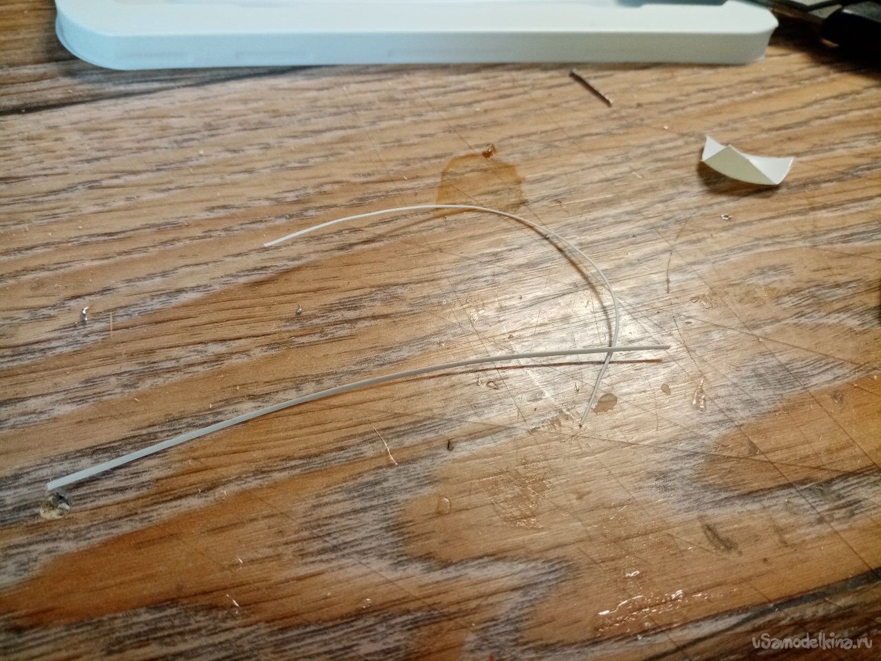 По прибытии на место обнаружил ошибку. Полоски на крылья приклеил не правильно. Это оказались укрепления. Из упаковки доширака отрезаю тонкие полоски пластика и приклеиваю на крылья как нужно. Исправил ошибку.