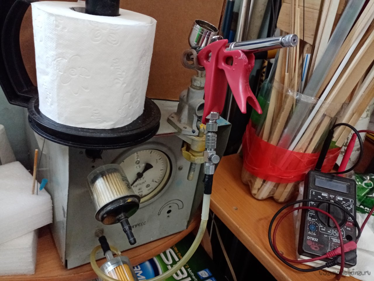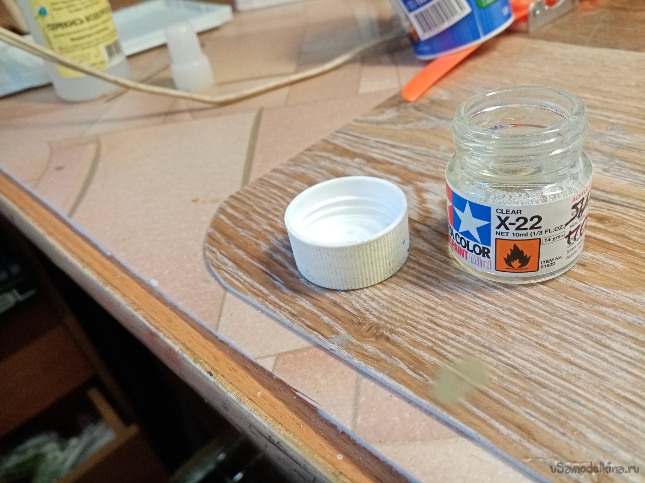 Выбираю основной цвет от «Тамии» под аэрограф. Бесшумный компрессор и китайский аэрограф, готовы к работе. Окраска не заняла много времени. Для дальнейшей работы нужно окрасить модель лаком. Поскольку основная краска корпуса матовая. Все последующие слои будут наноситься плохо на мат.