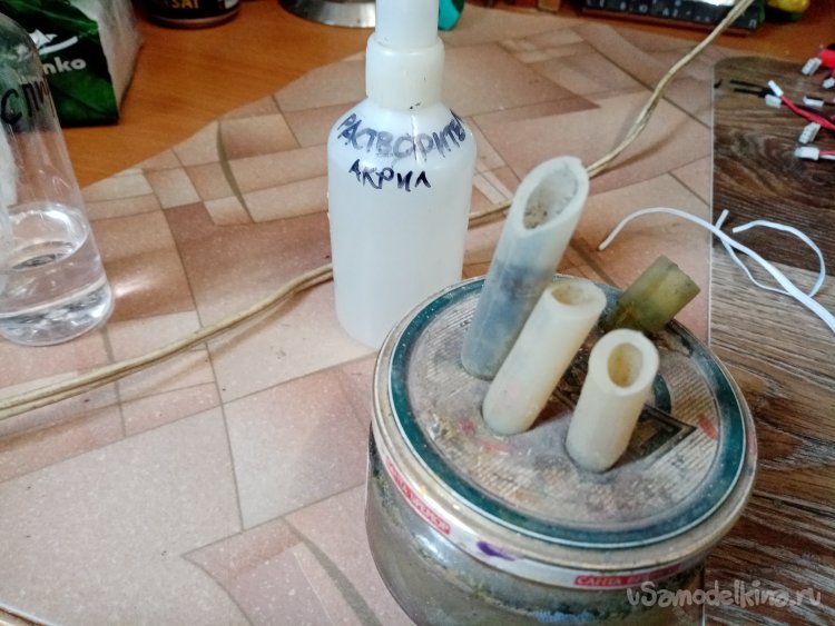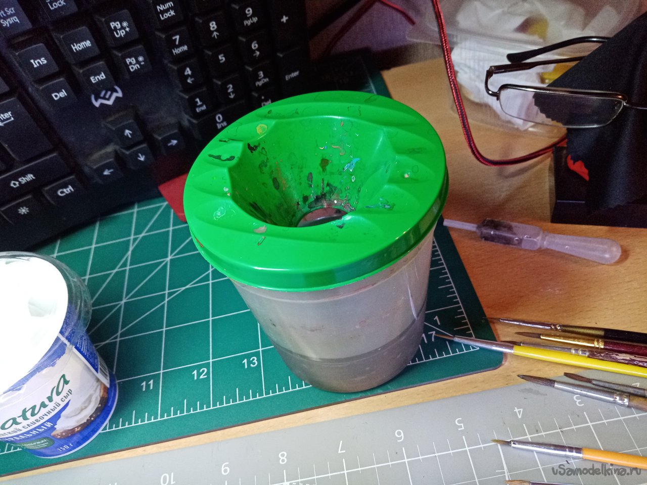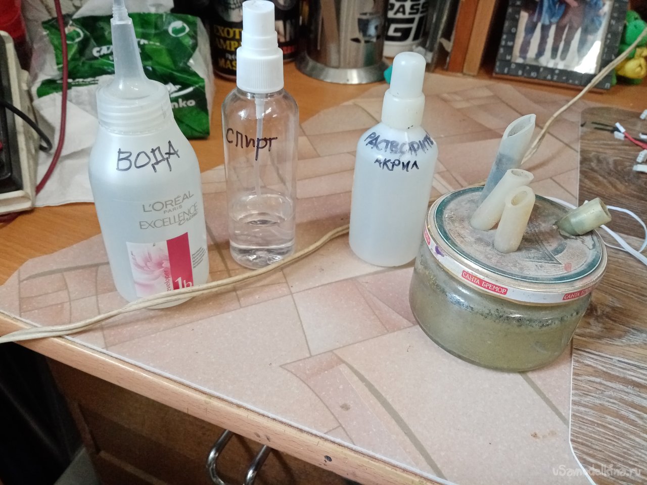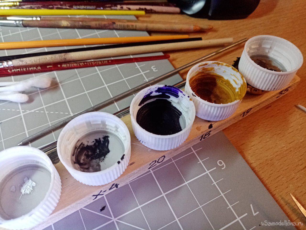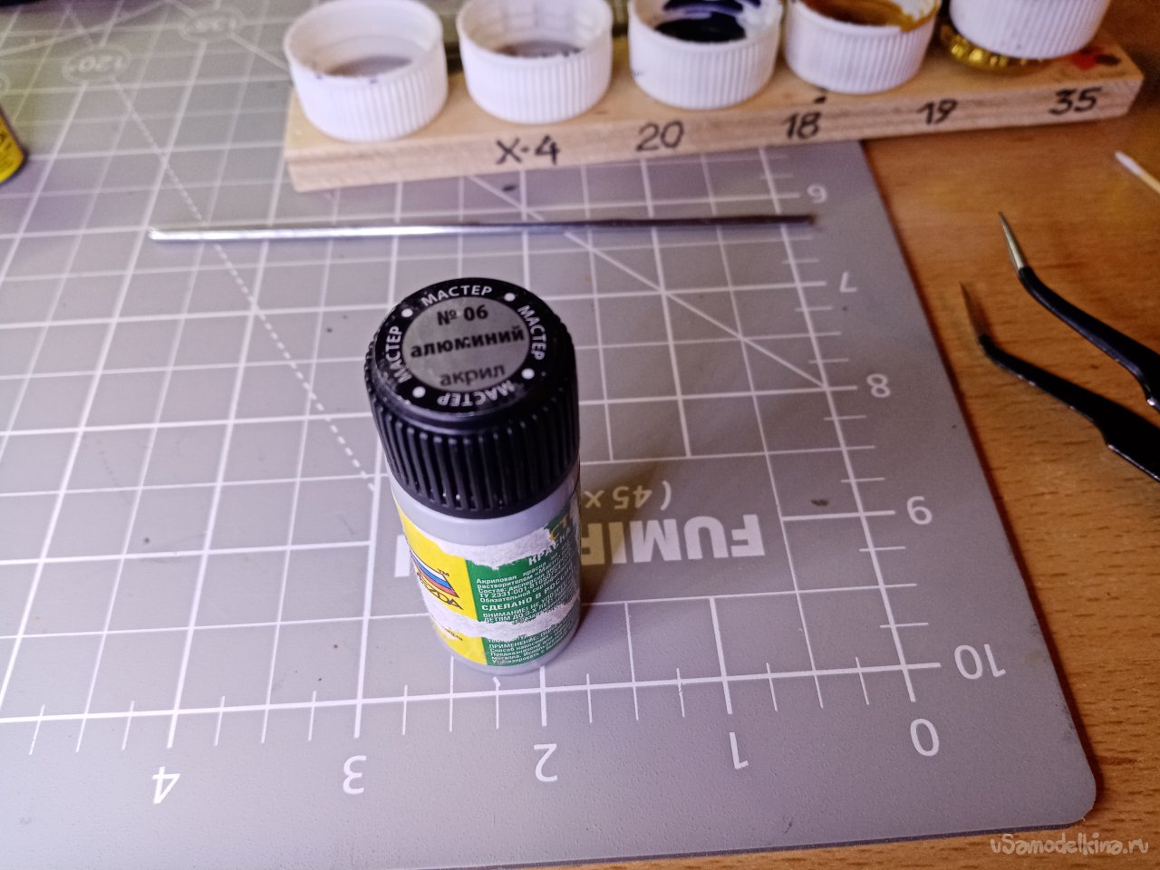 В этом случае акрил разбавляю простой водой. Размешиваю толстой в баночках толстой хромированной проволокой. Добавляю немного воды при помощи пипетки.