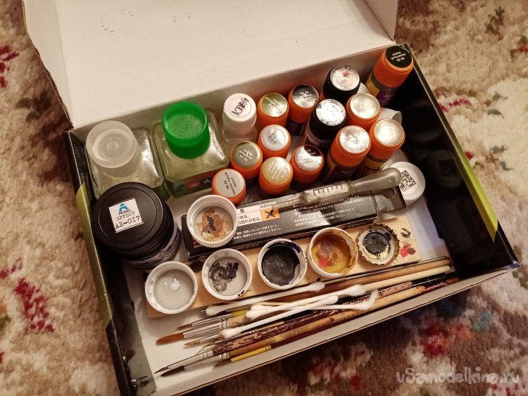 Извлекаю коробочку с красками под кисть. Окрашиваю мелкие детали на корпусе. Пилу, топор, лопату. Прочую мелочь.