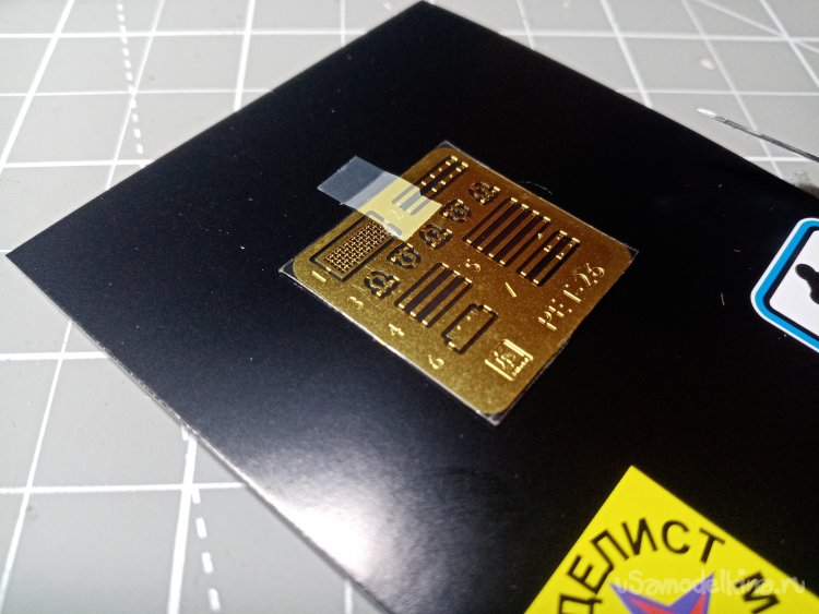 Еще немного травленых деталей. Отделяю при помощи треугольного ножа для творчества нижнюю часть маски. Сгибаю и приклеиваю на место при помощи циакрина. Устанавливаю на место гусеницы и воздухозаборник двигателя. Некоторые мелкие детали травления. Полоски на крылья и петли для тросов транспортировки.