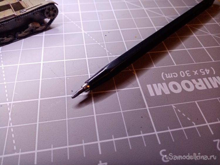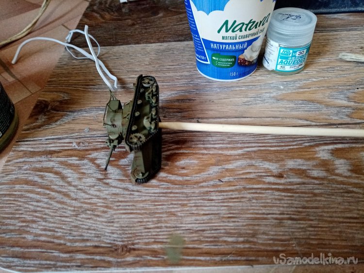 В днище танка просверливаю отверстие треугольным ножом для творчества. Вставляю державку и танк готов к покраске.