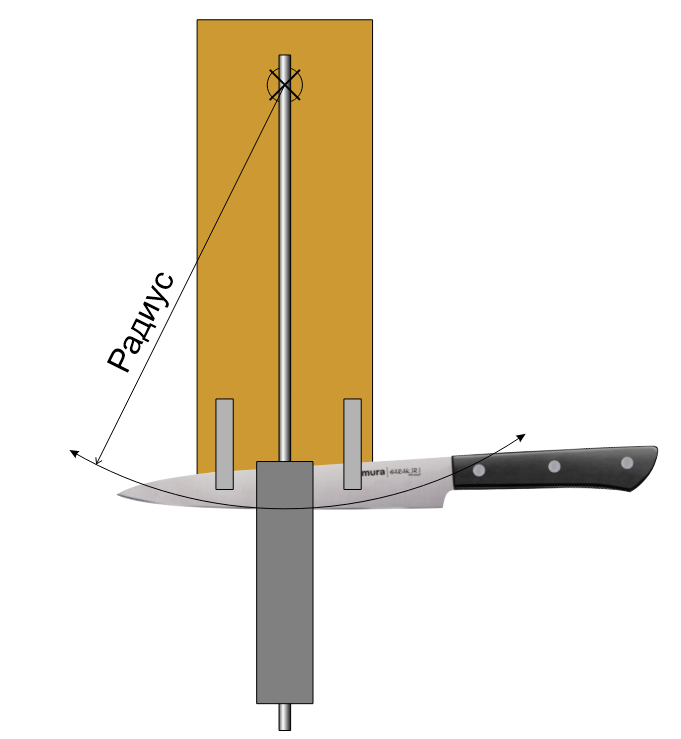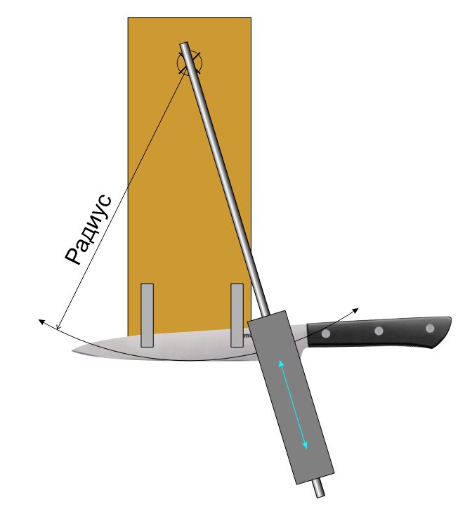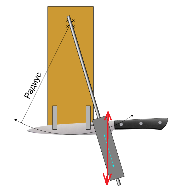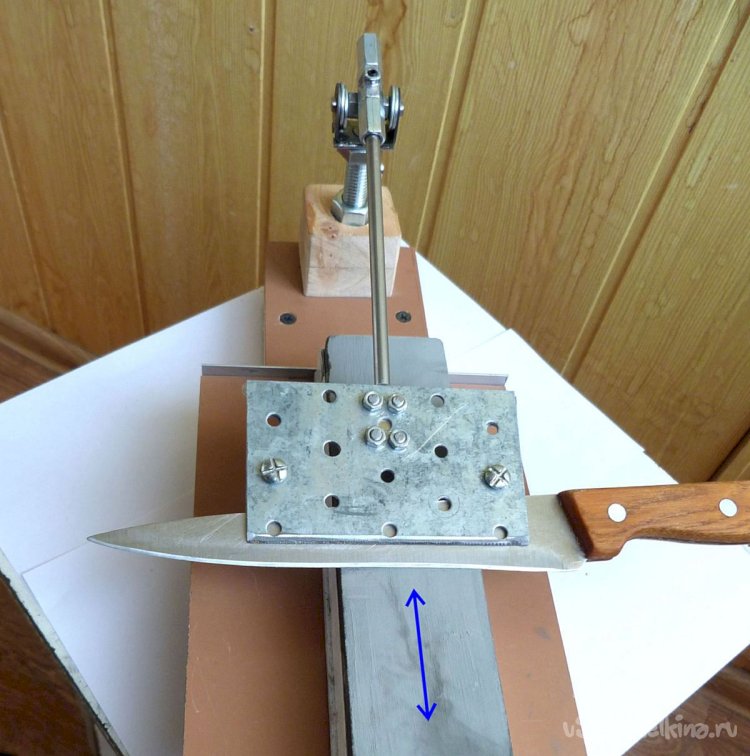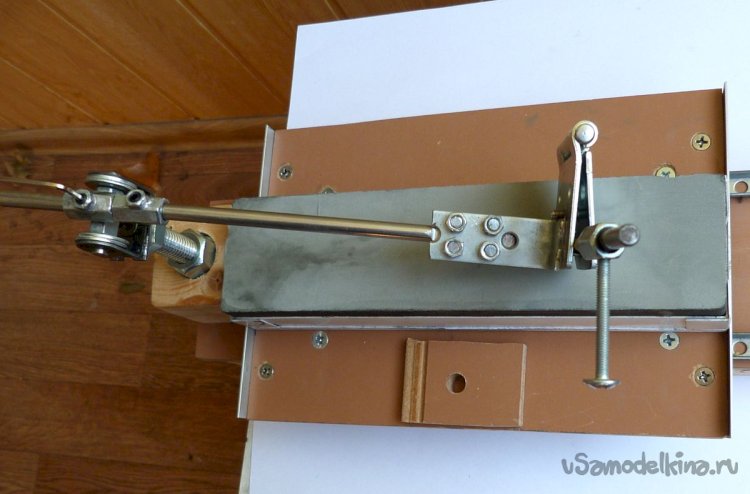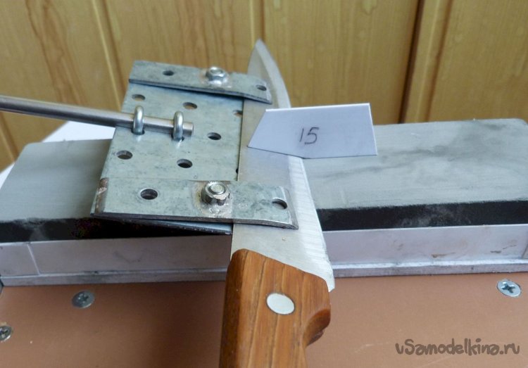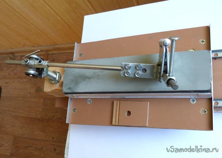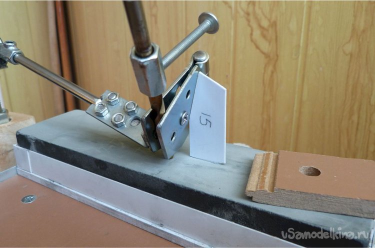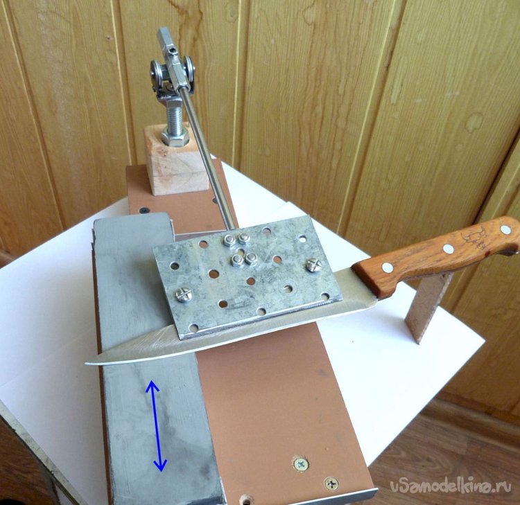 По сути ножеточка готова, и на ней можно затачивать ножи. Кладём точильный брусок на основание, выставляем при помощи кондуктора угол заточки, и удерживая одной рукой нож, второй рукой совершаем возвратно-поступательные движения точильного бруска.