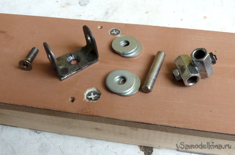 Две удлинённые гайки спаиваются крестом, чтобы припаянные гайки были на противоположных гранях креста. От прутка Ø 6мм отрезается отрезок длиной 30мм. При помощи этого отрезка спаянный крест закрепляется в ранее спаянном кронштейне, и через отверстие с припаянной гайкой М4 фиксируется установочным винтом. Поскольку удлинённая гайка М6 имеет меньший размер по длине, чем расстояние между щёчками кронштейна, этот зазор убирается шайбами М6. по две с каждой стороны.