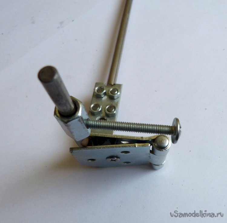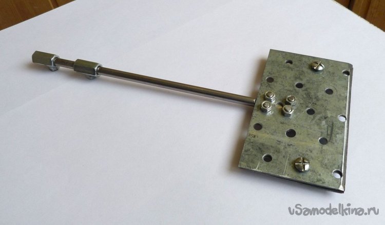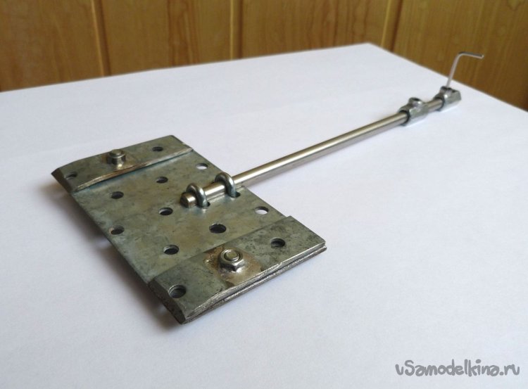 Для установки штанги используется качалка изготовленная из двух обрезанных по отверстию металлических крепёжных уголков 20х20мм. припаянных к металлической пластинке 20х25мм. Металлическую пластинку 20х25мм. можно получить отрезав полку от крепёжного уголка 50х50х20мм.