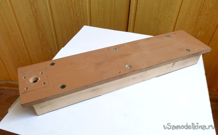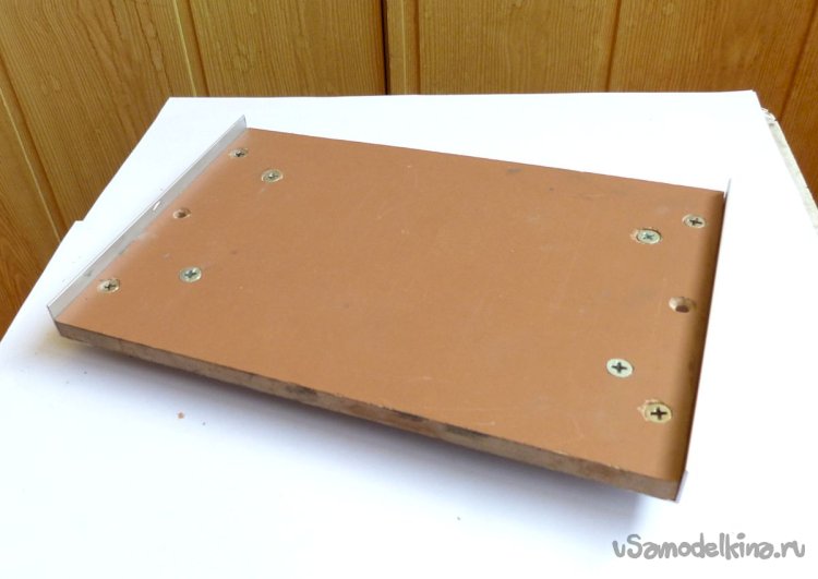 Для основания использовался отрезок ламината, который остался от настилки пола. Выпиливается по размеру и просверливаются необходимые отверстия. Снизу, по краям, прикручиваются отрезки рейки 25х25. На рейки снизу приклеиваются противоскользящие накладки.