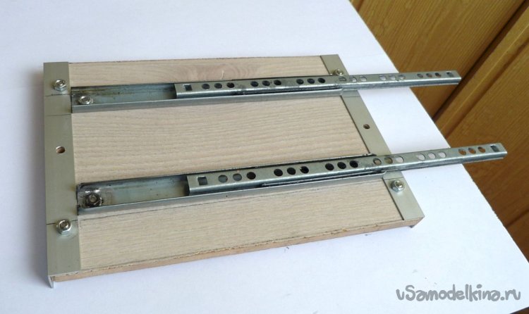 К основанию точилки каретка крепится шариковыми направляющими 17 мм 214 мм частичного выдвижения. Поскольку эти направляющие являются неразборными, к одному из крайних отверстий подвижной части припаивается гайка М4. (это в том случае, если отсутствует возможность вкрутить шуруп в основание каретки.) На противоположном конце этой части уже имеются отверстия с резьбой М4. Через эти отверстия винтами М4 направляющая крепится к каретке. К основанию ножеточки направляющие крепятся саморезами.