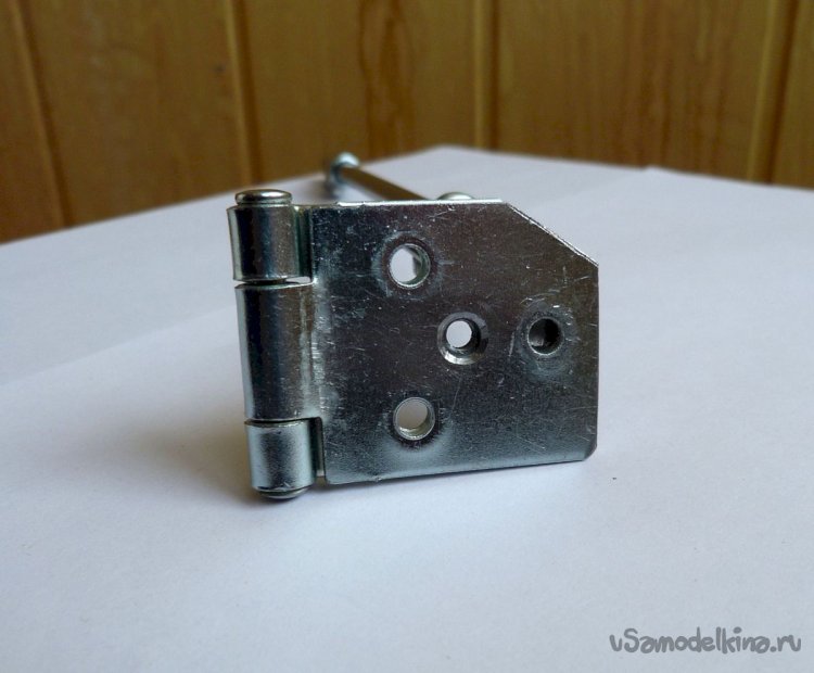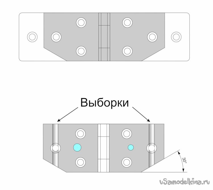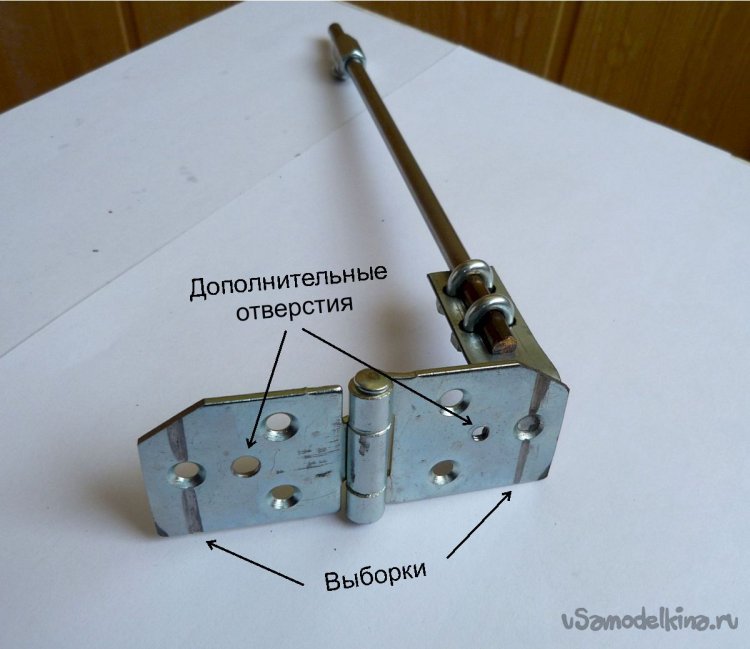 Петля обрезается, просверливаются дополнительные отверстия. В задней карте, в просверленном отверстии нарезается резьба М4 В передней карте просверливается отверстие Ø5.5 мм. Круглым надфилем делаются выборки для удержания свёрл.
