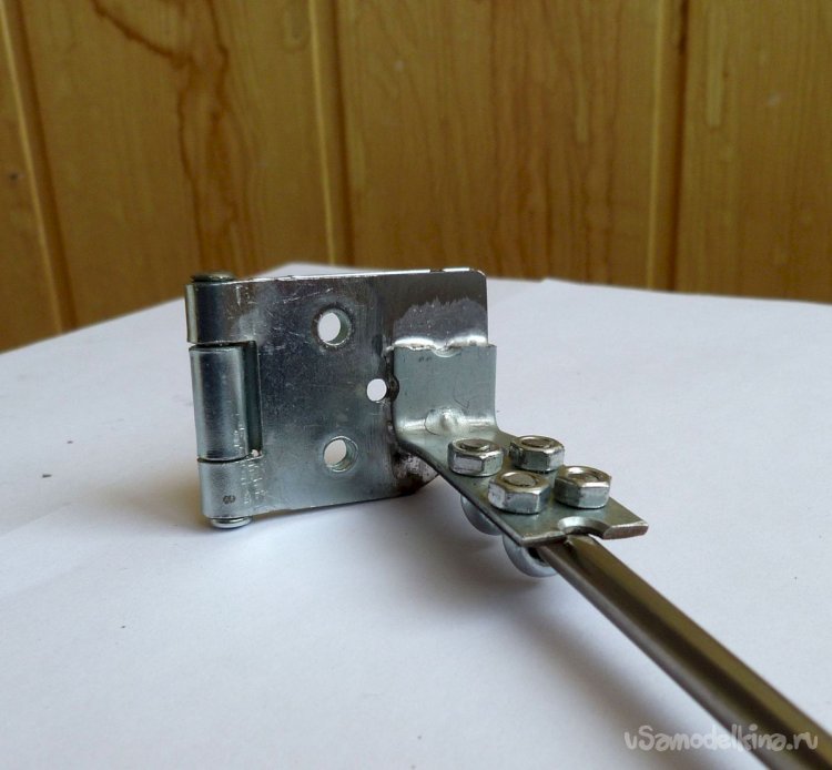 Петля припаивается к обрезанному уголку 50х50Х20. Обрезанный он стал 20Х50Х20. В уголке просверливаются отверстия для крепления штанги U-образными зажимами и этими зажимами он крепится к штанге.