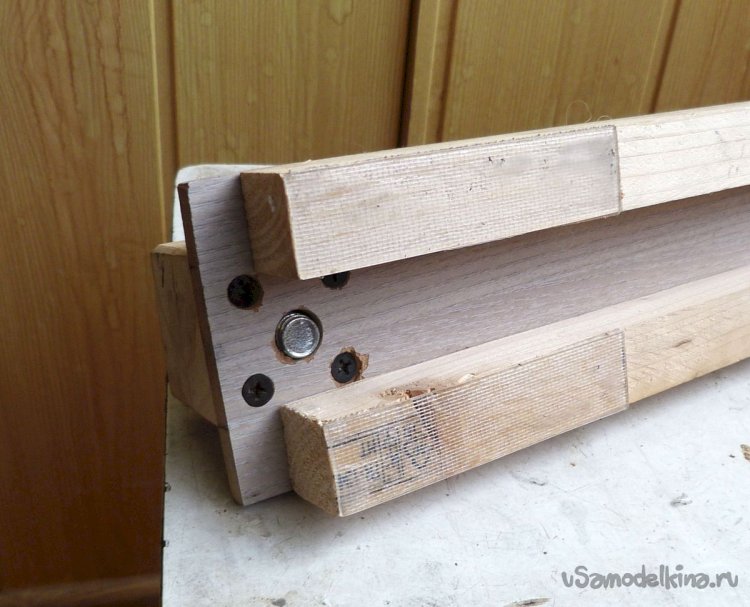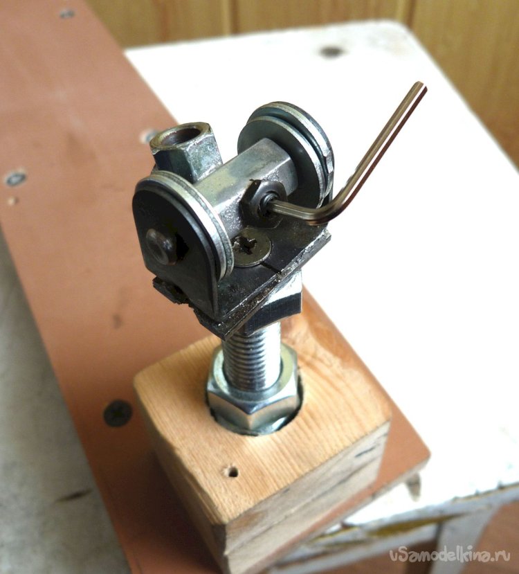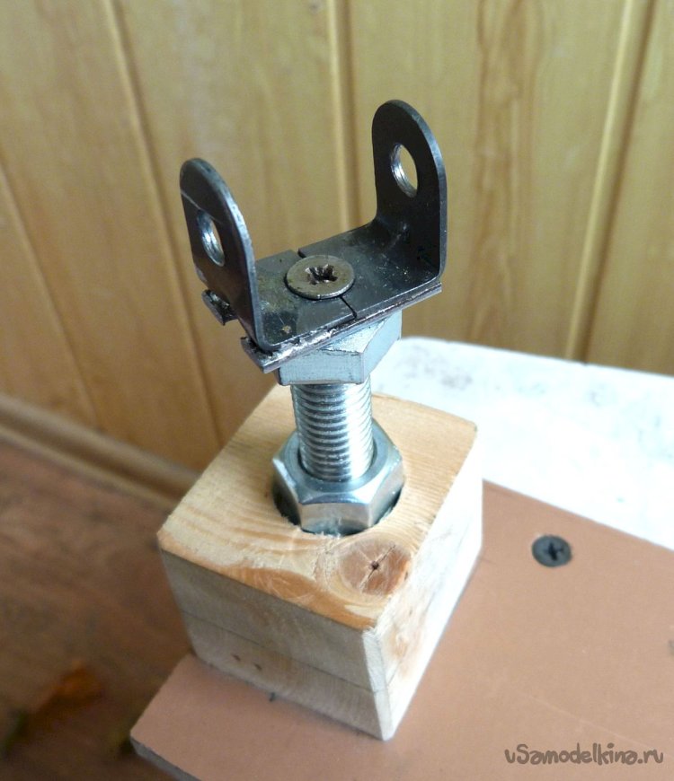В деревянных квадратиках по центру просверливается отверстие Ø22 мм. Квадратики склеиваются между собой. В отверстие запрессовывается удлинённая гайка М12 предварительно обёрнутая полоской жести от консервной банки (чтобы плотно входила) и узел крепится к основанию шурупами.