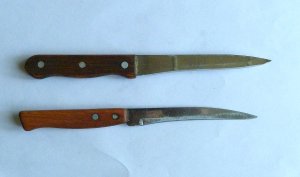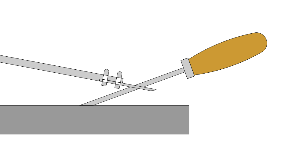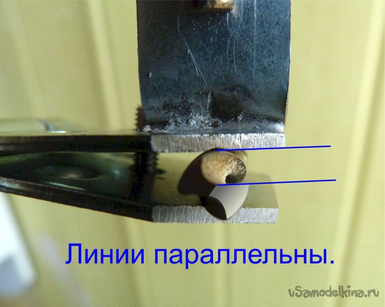 Для штанги используется металлический пруток Ø 6мм. На одном конце прутка для крепления удерживающей пластины, напильником делается выборка длиной 30 и глубиной 2,4 мм. Размер 2,4 мм. необходимо выдержать для того, чтобы режущая кромка столового ножа толщиной 1,2 мм при закреплении ножа на пластине, находилась по центру диаметра штанги. Если предполагается затачивать ножи другой толщины, глубина выборки рассчитывается под эту толщину.