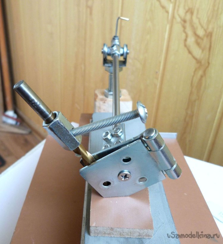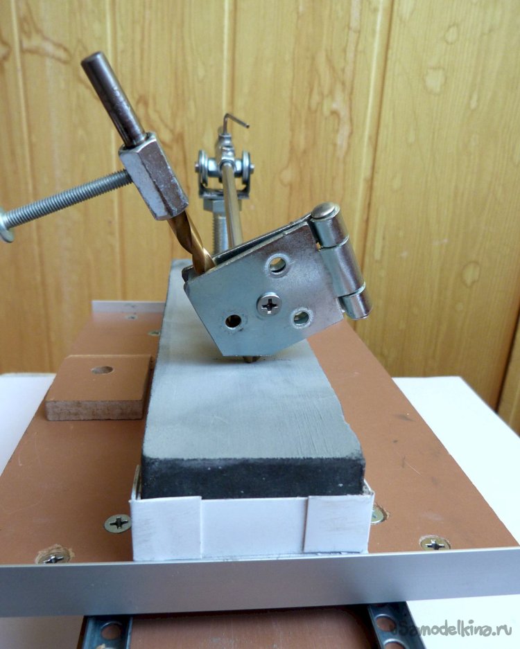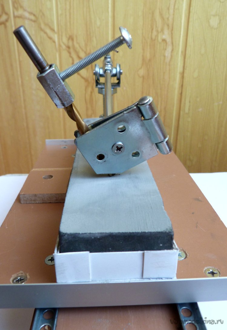 Через прокладку с просверленным отверстием, сверло устанавливается так, чтобы спиленный угол карты был параллелен прокладке. То-бишь, спиленным углом устанавливается на прокладку, чем обеспечивается угол заточки 120°. И штанга фиксируется от проворачивания верхним винтом на крестовине.