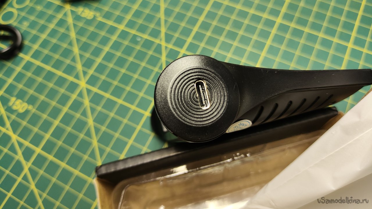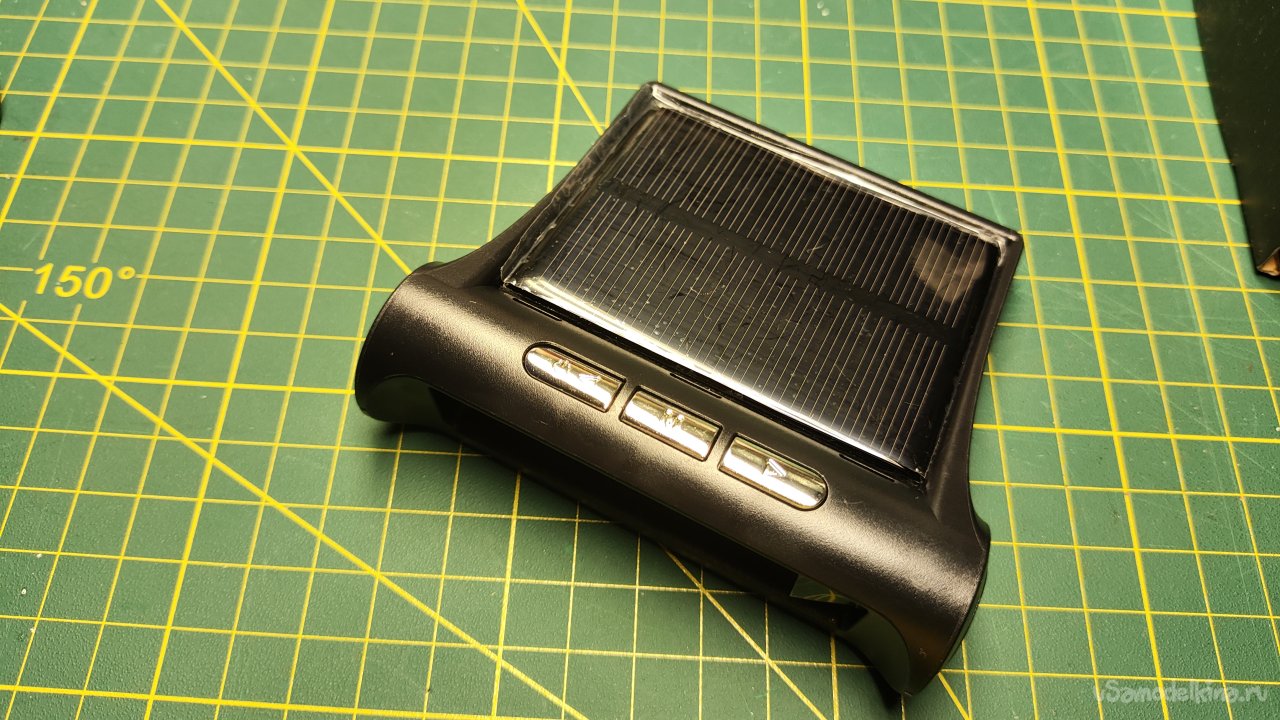На внешнем блоке сверху три кнопки управления для включения, настройки, управления яркостью подсветки, солнечная панель. Справа порт для зарядки. Снизу место для приклеивания скотча.