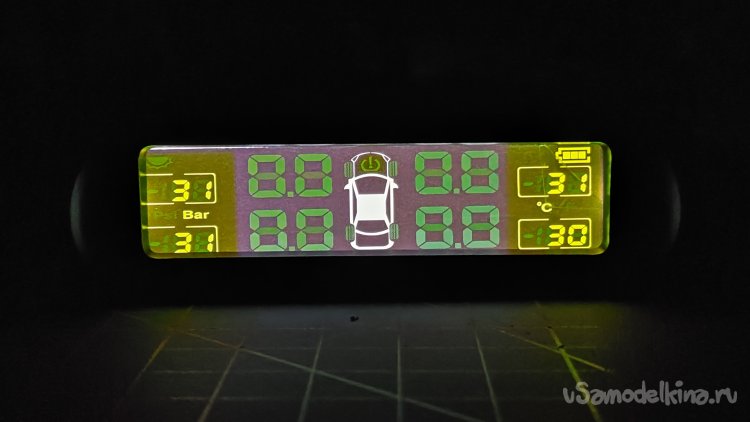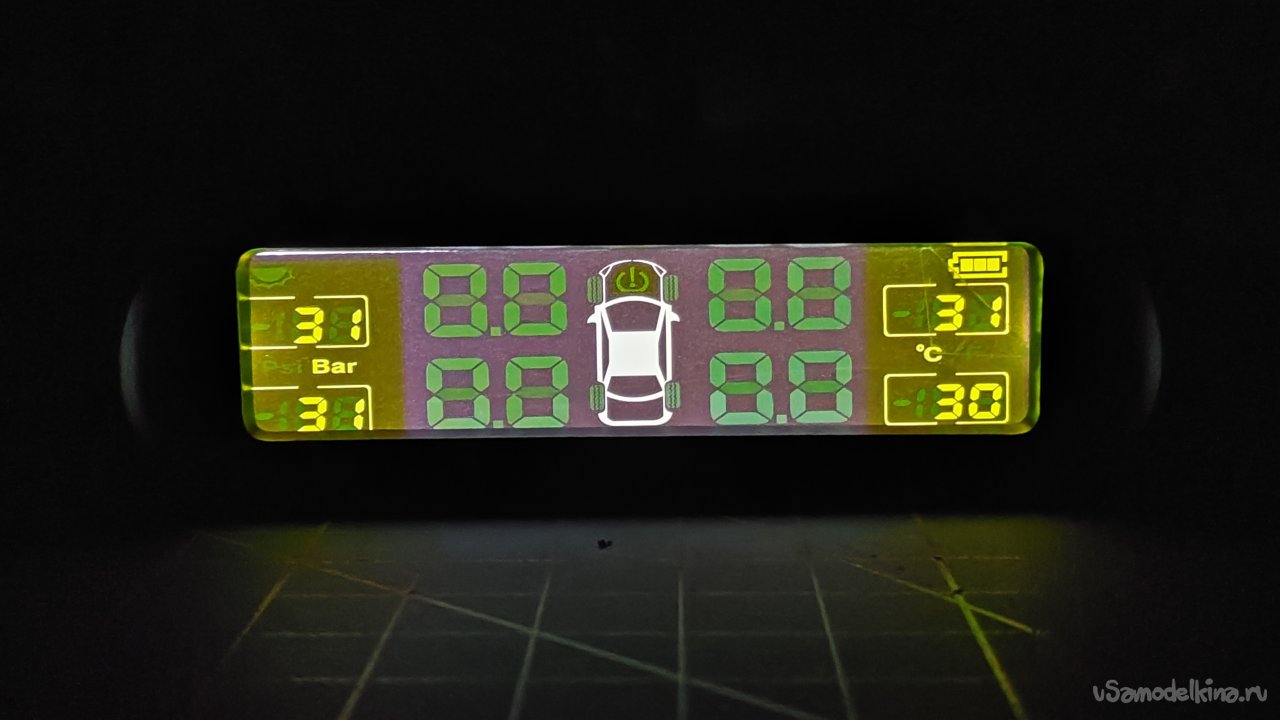 Показания давления белые крупные цифры. Показания температуры маленькие цифры. В зависимости от производителя, могут быть красные и зеленые, зависит от установленного в дисплее светофильтра.