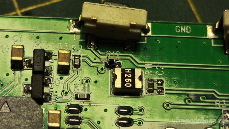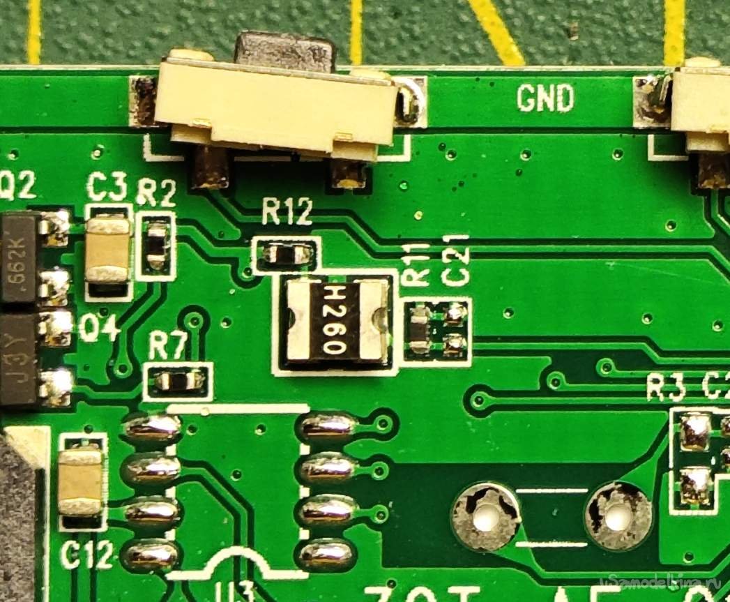 Осталось только проверить, элемент на плате. По дорожкам и элементам видим, что на левую ножку H260 через резистор R12 приходит 3,3 В со стабилизатора Q2 с маркировкой 662K. На правой ножке H260 тоже есть напряжение 3,3 В, но когда по плате ударяешь, напряжение пропадает. Значит, это точно датчик вибрации. Осталось только понять, элемент должен быть замкнут, разомкнут или периодически вибрировать, чтобы блок не уходил в спящий режим. Оказалось, достаточно датчику быть разомкнутому, чтобы вход контроллера резистором R11 был подтянут к нулю и блок перестал уходить в спящий режим. Выпаивать датчик не хочется, есть риск его повредить. Мало ли, вдруг он понадобится. А вот резистор R12 вполне можно аккуратно отпаять или откусить, что у кого получится.