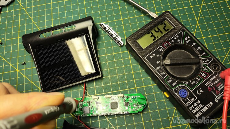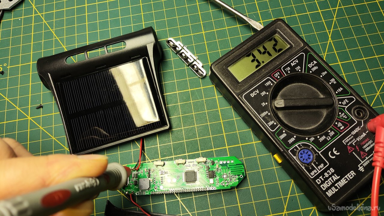 Измерил напряжение солнечной панели в свете лампы дневного света мощностью 30 Вт. Напряжение 3,42 В. На Солнце будет норм. Но это не точно. По схеме, солнечная панель подключена к аккумулятору через диод D2. Никакого контроля заряда от солнечной панели, кроме платы защиты самого аккумулятора, нет.