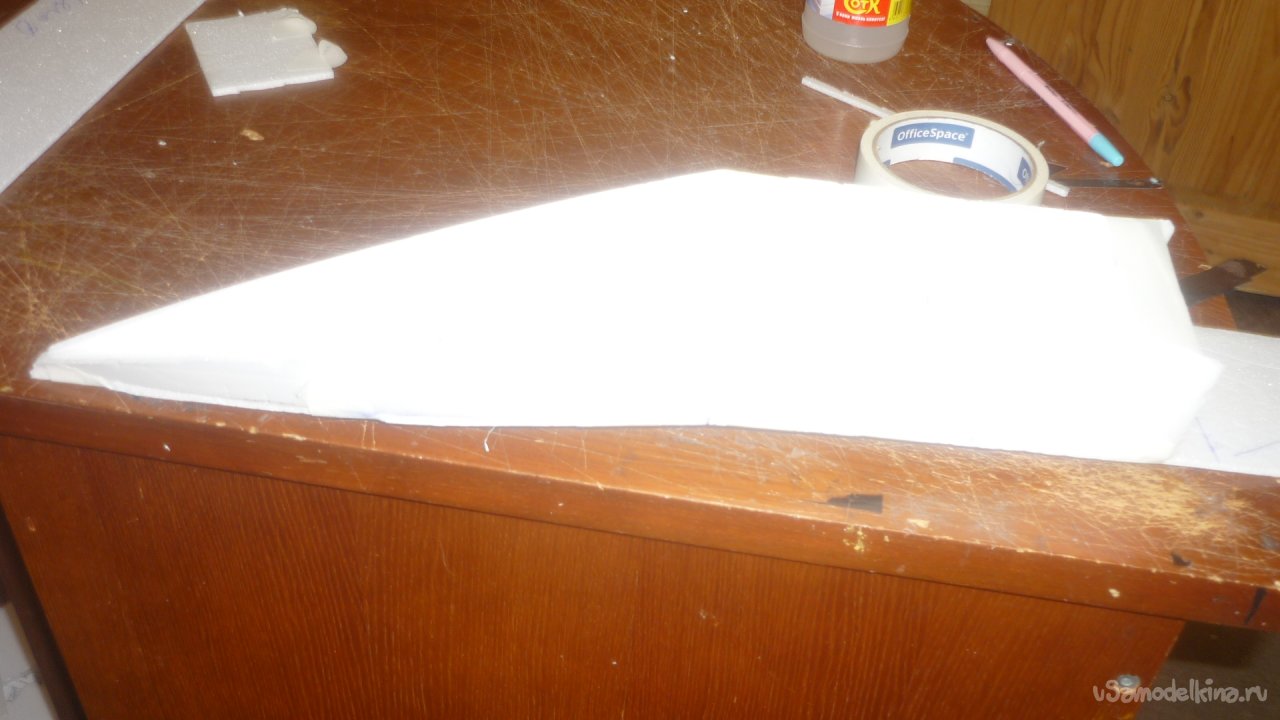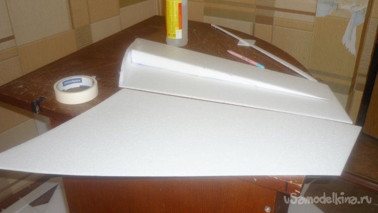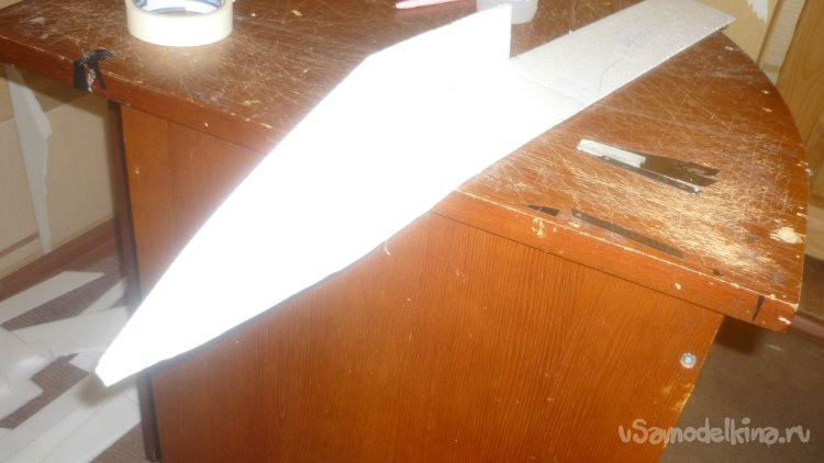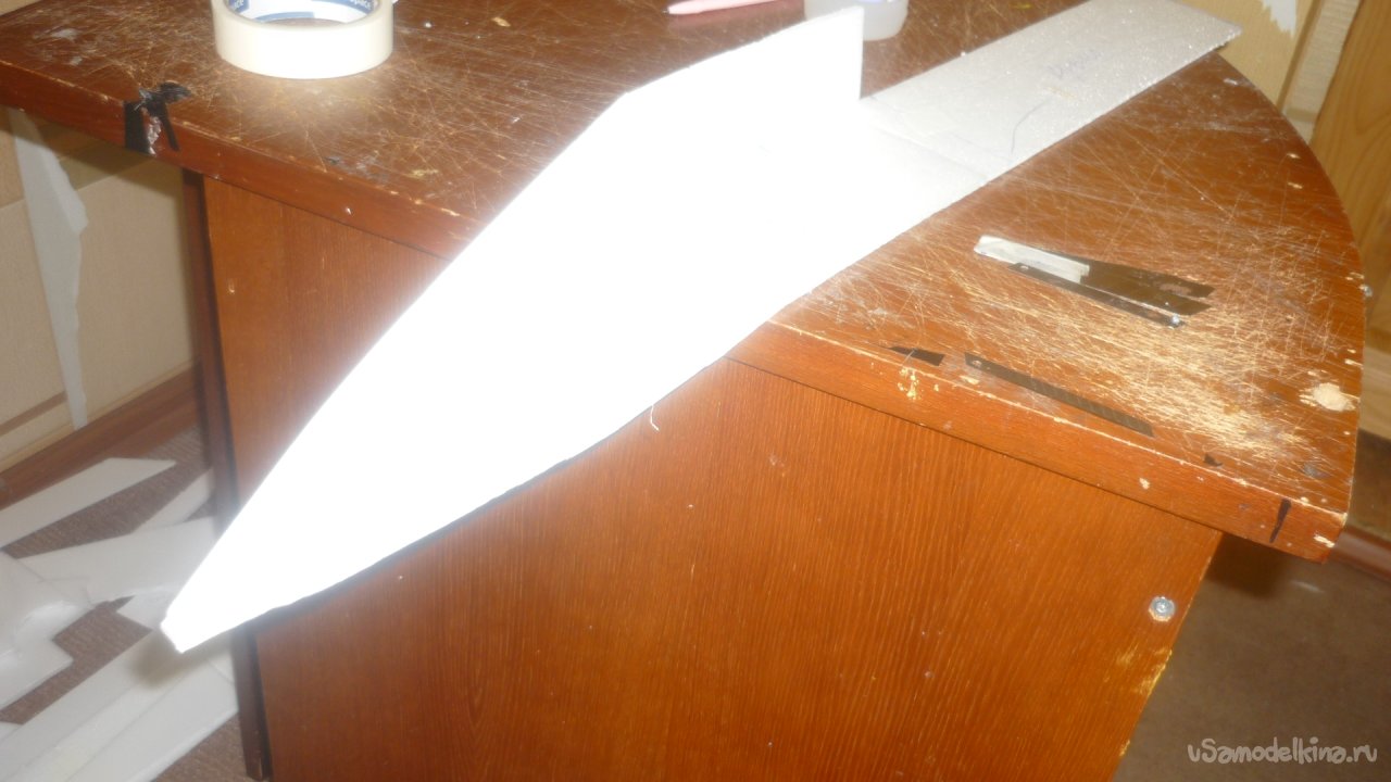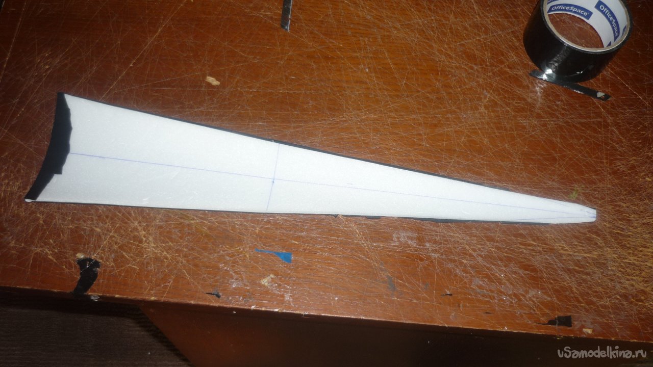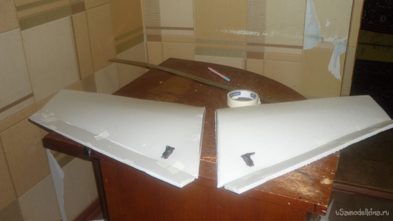 Выкраиваю заготовки элевонов, склеиваю в два слоя, срезаю под углом в 45 градусов передние кромки и навешиваю элевоны на бумажный, малярный скотч.
