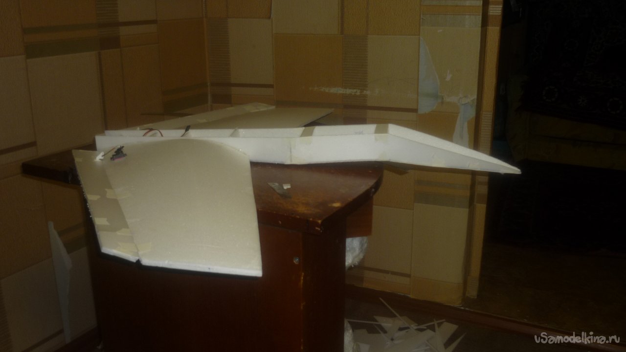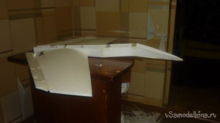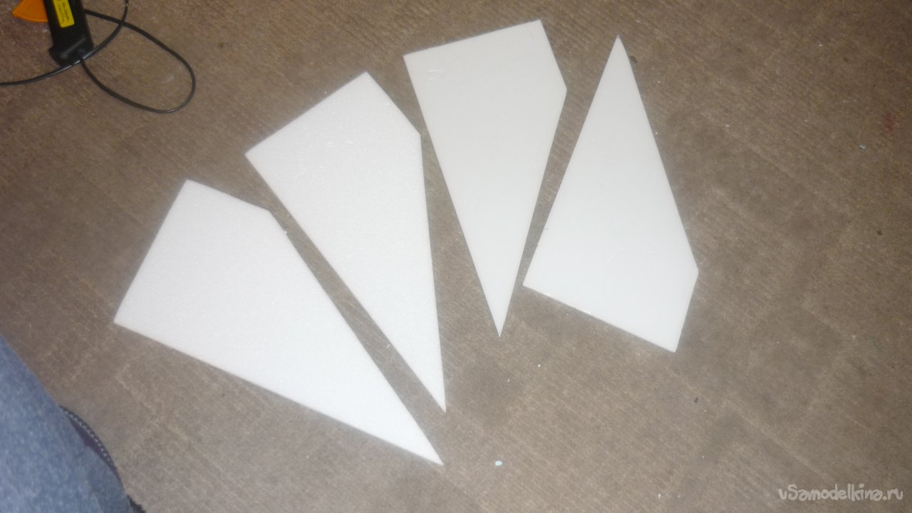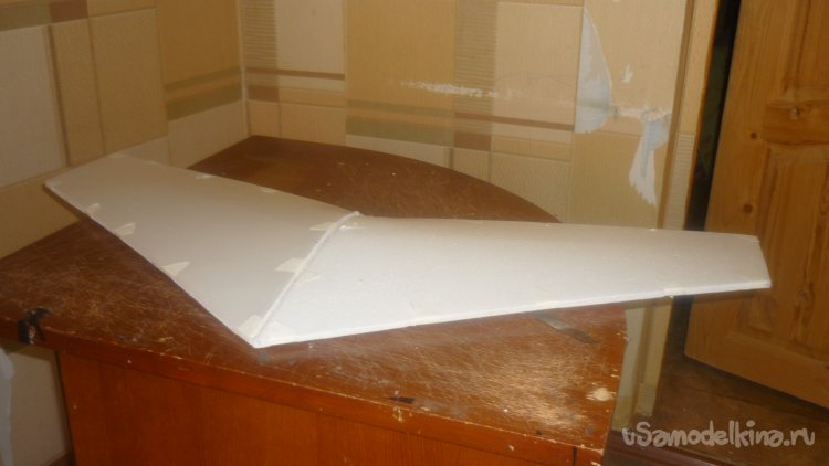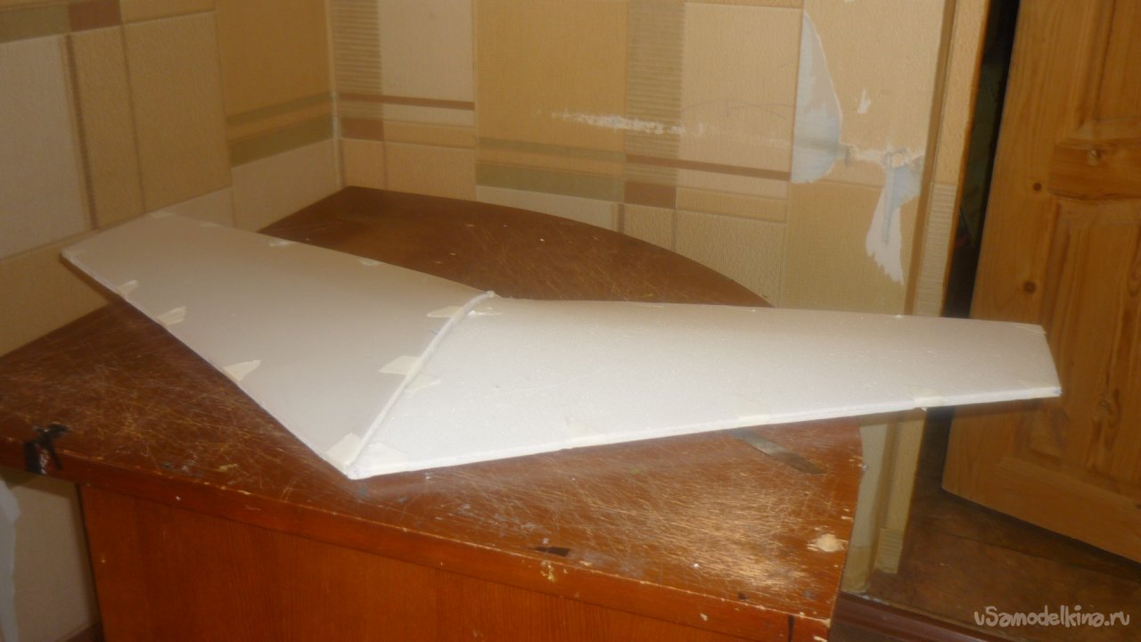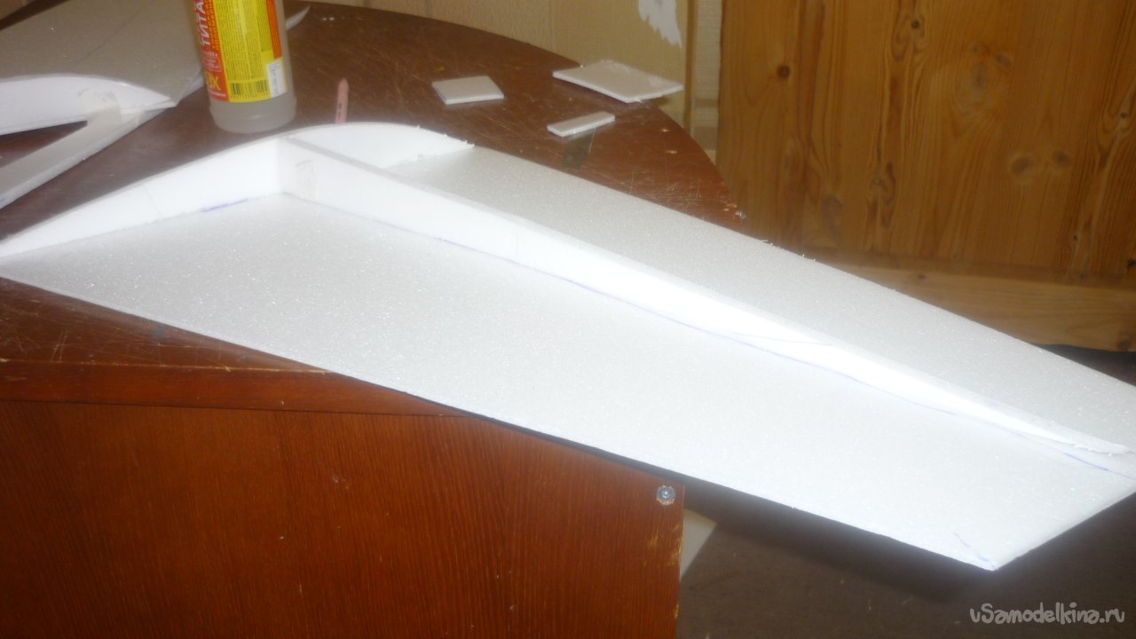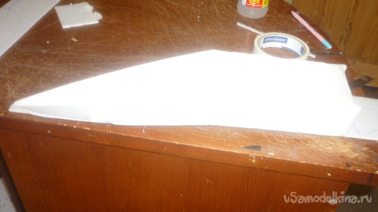 Выкраиваю заготовки элевонов, склеиваю в два слоя, срезаю под углом в 45 градусов передние кромки и навешиваю элевоны на бумажный, малярный скотч.