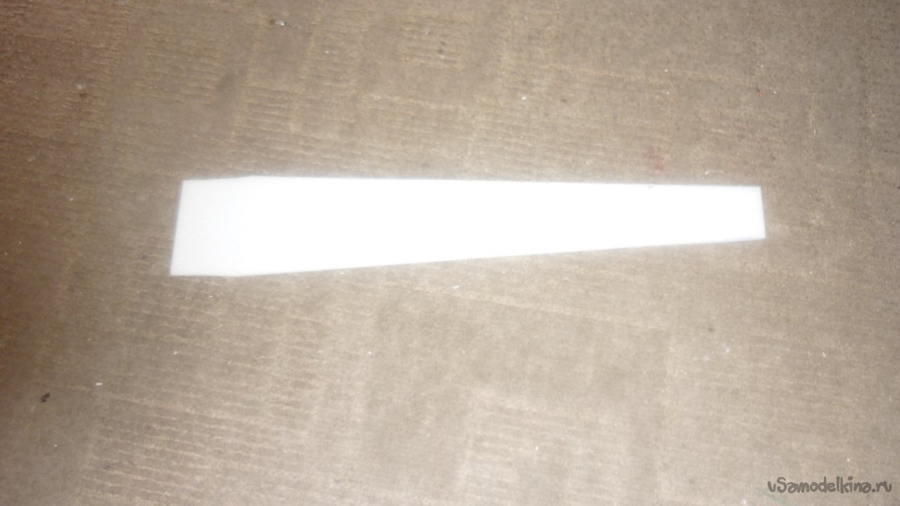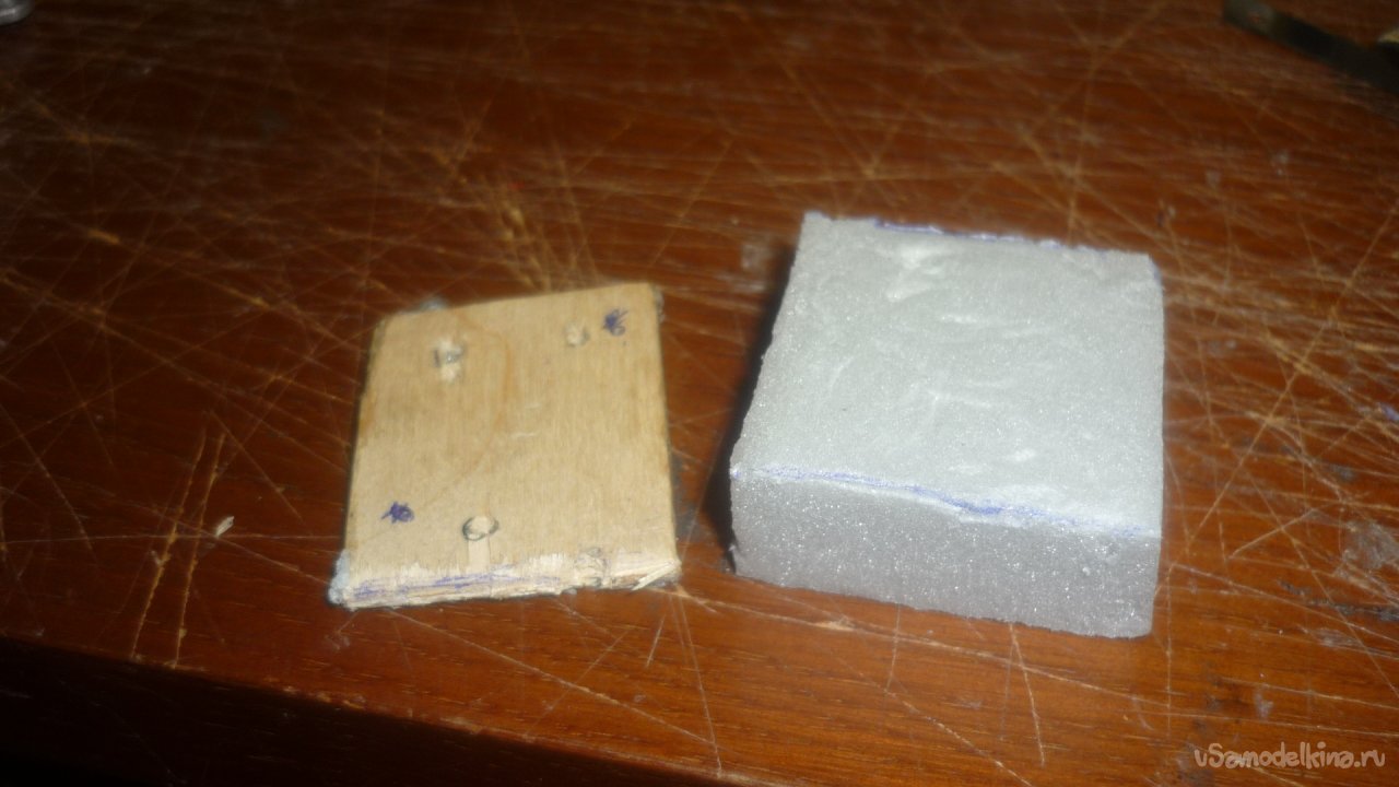 От листа утеплителя, толщиной 20 мм. отрезал кусочек, приклеил на него кусочек 3 мм. фанеры - получилась моторама. На неё будет крепиться мотор с винтом ( пропеллером).