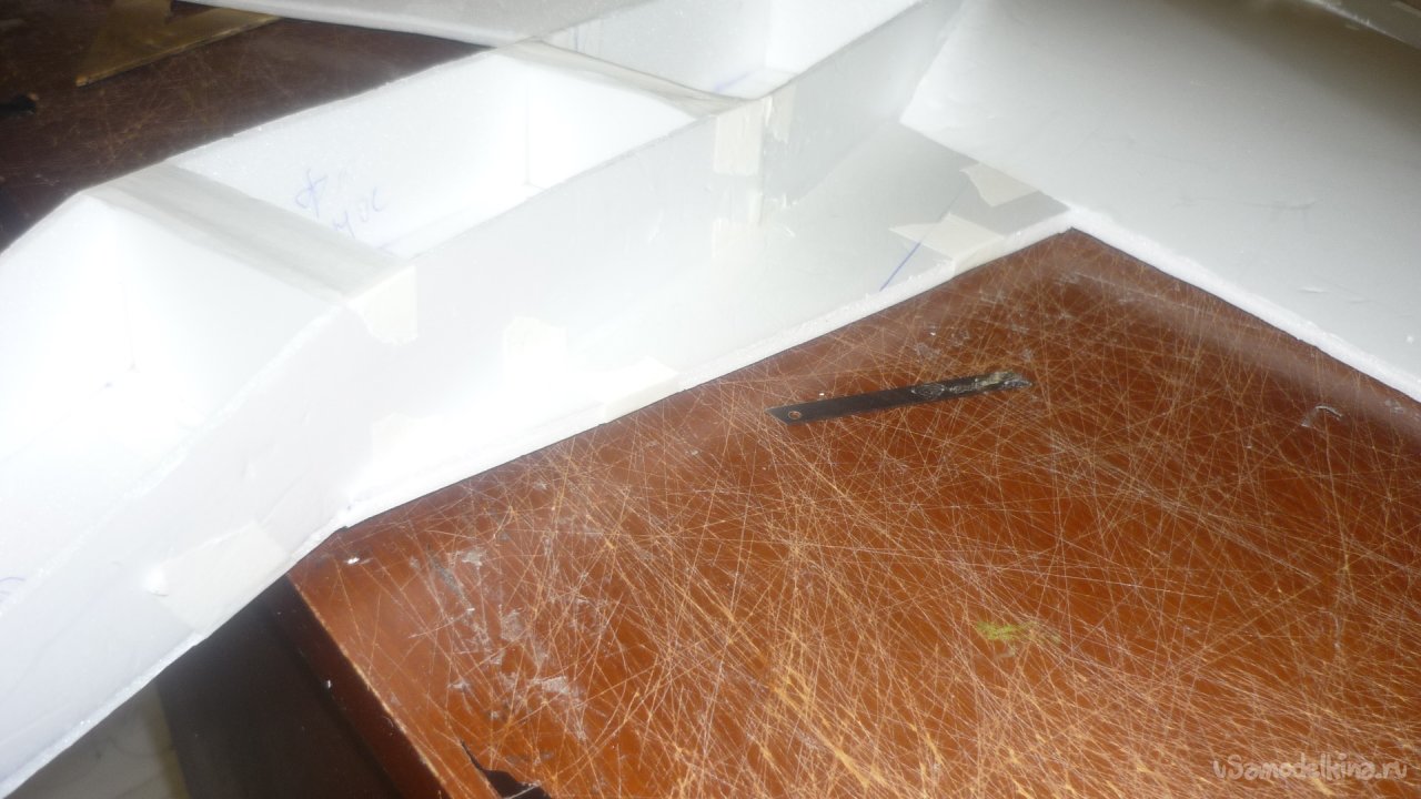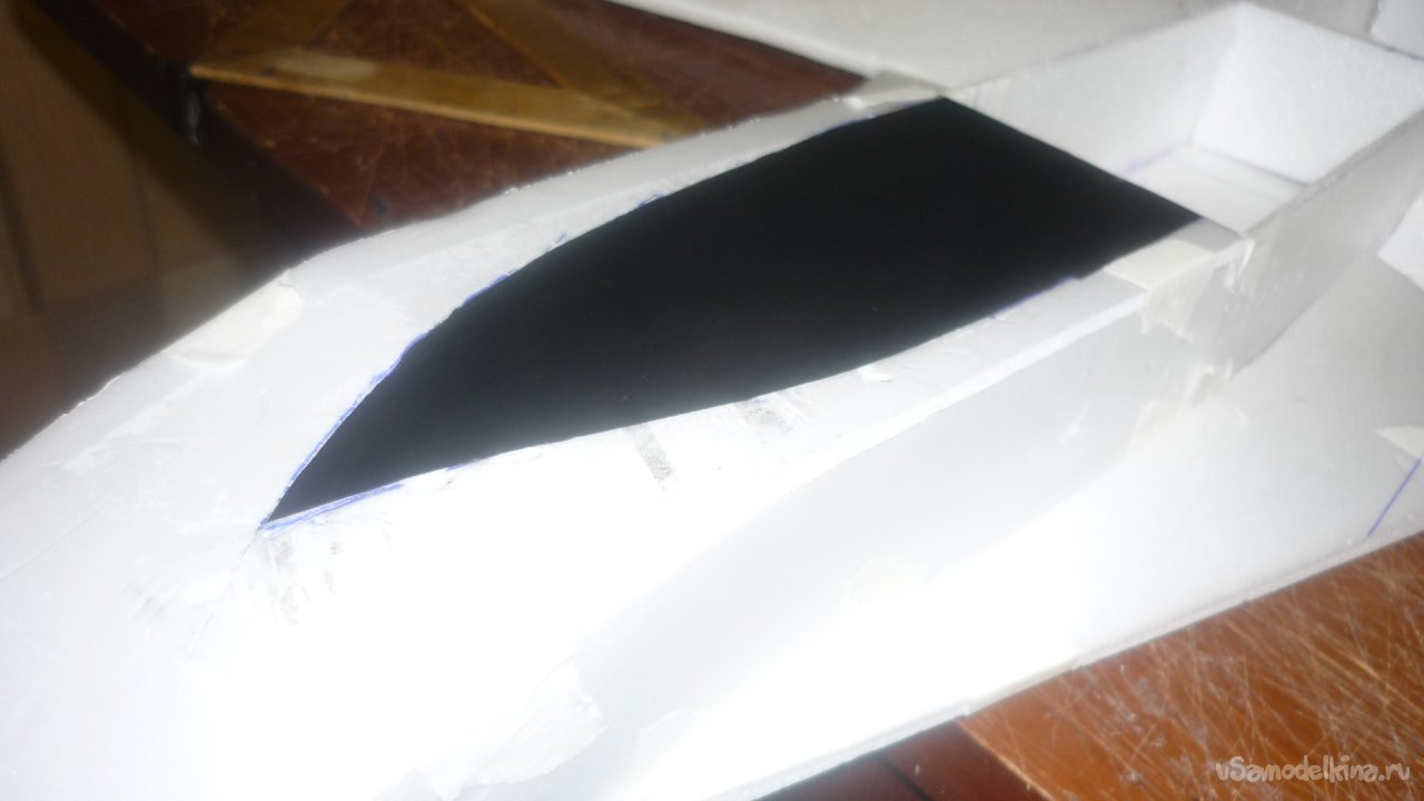 Вот в этот момент, у меня в голове промелькнула мысль- а зачем я хочу поставить на такую небольшую, я бы даже сказал - маленькую модельку, такой огромный импеллер? Тут же , не долго думая, выкроил и начал вклеивать боковые стенки фюзеляжа в расчёте на установку обычного мотора с винтом (пропеллером).
