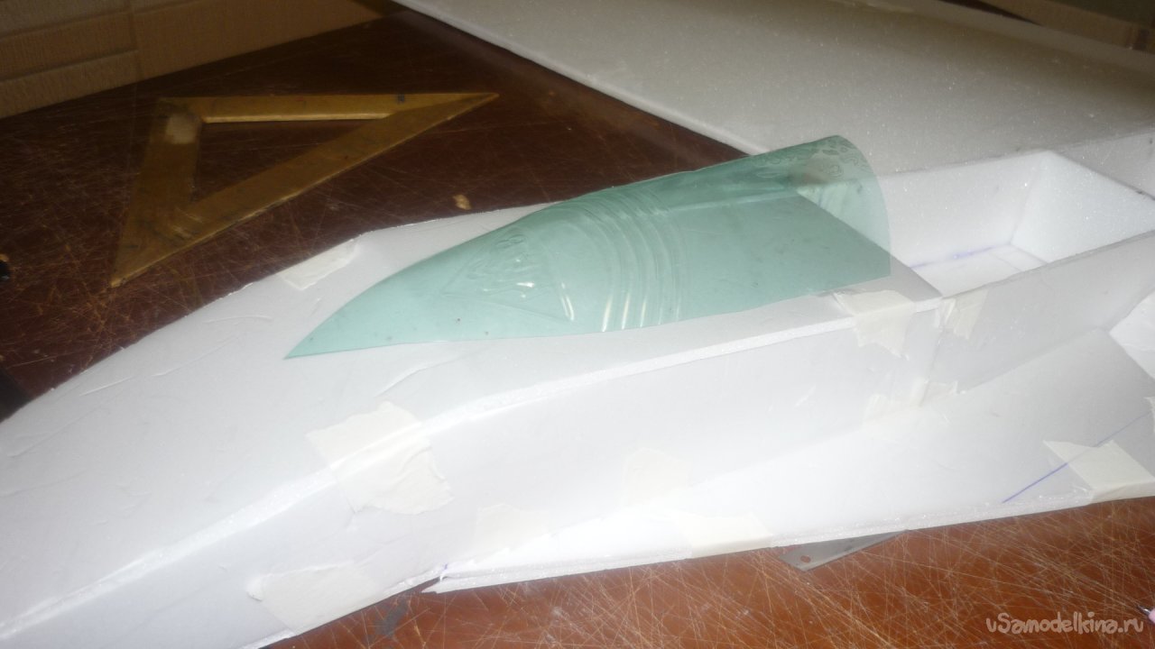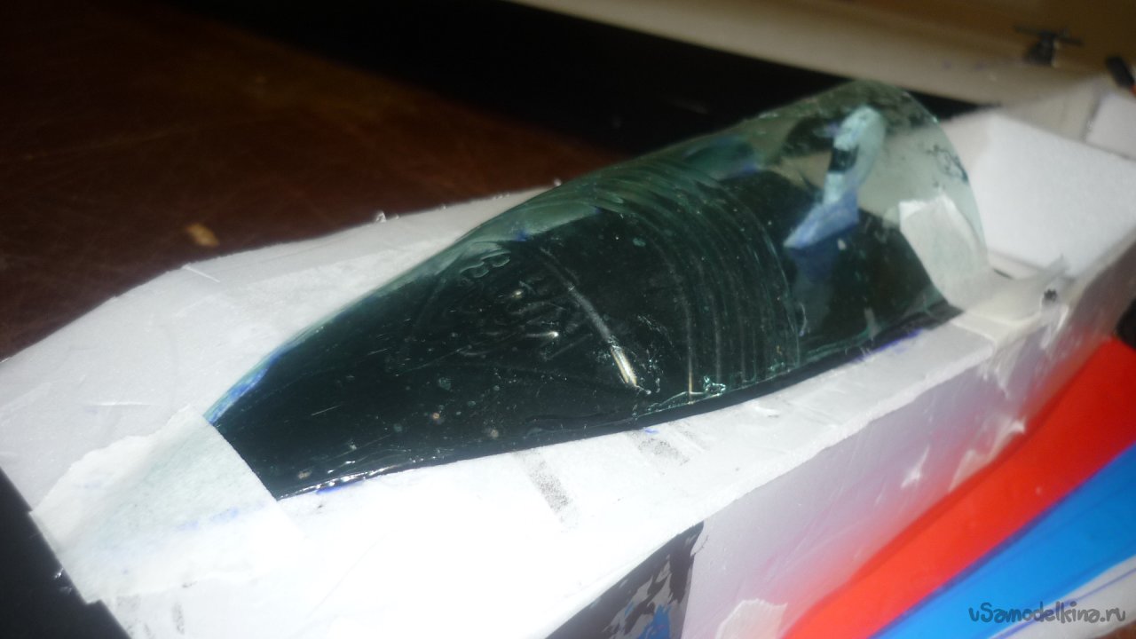 Из пластиковой бутылки из - под минеральной воды вырезал остекление кабины. Примерил.