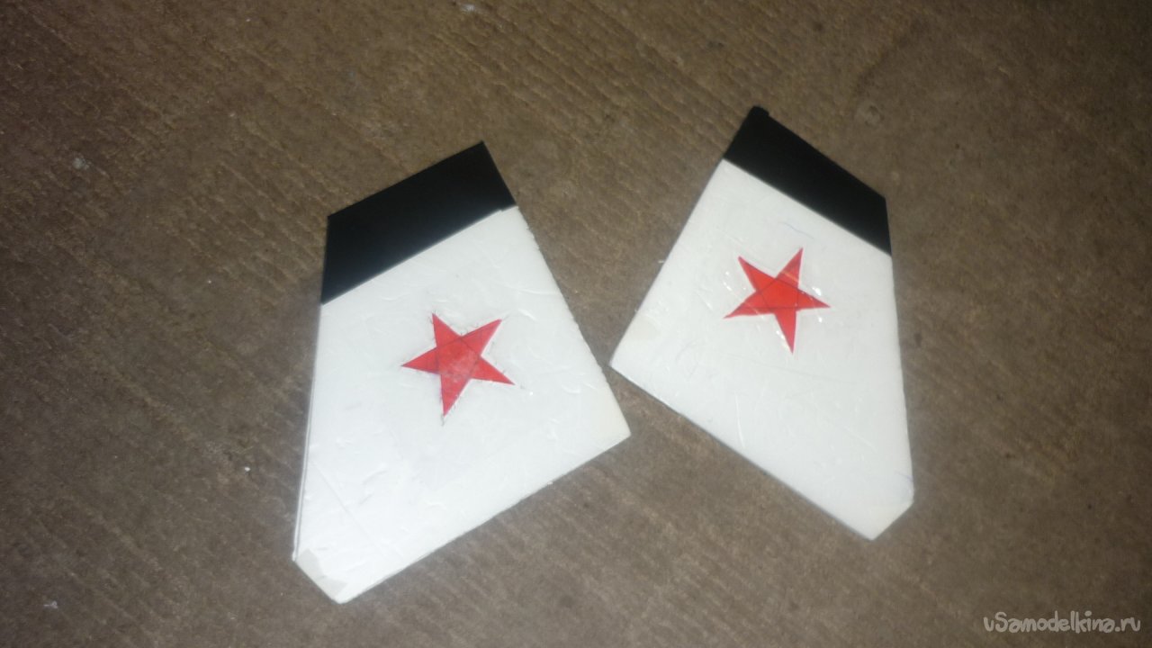 Изготавливаю красные звёзды и монтирую их на концах крыльев и на килях.