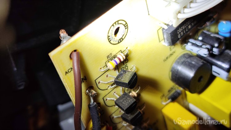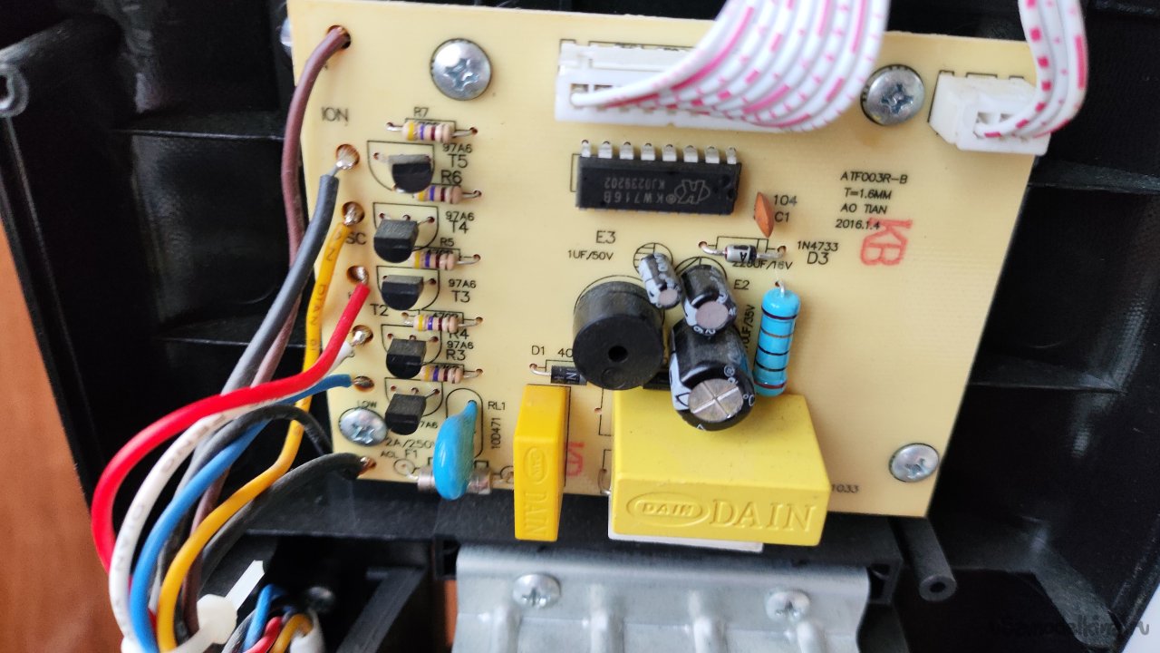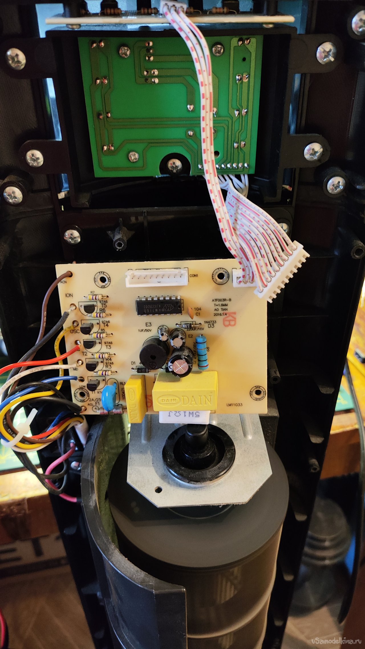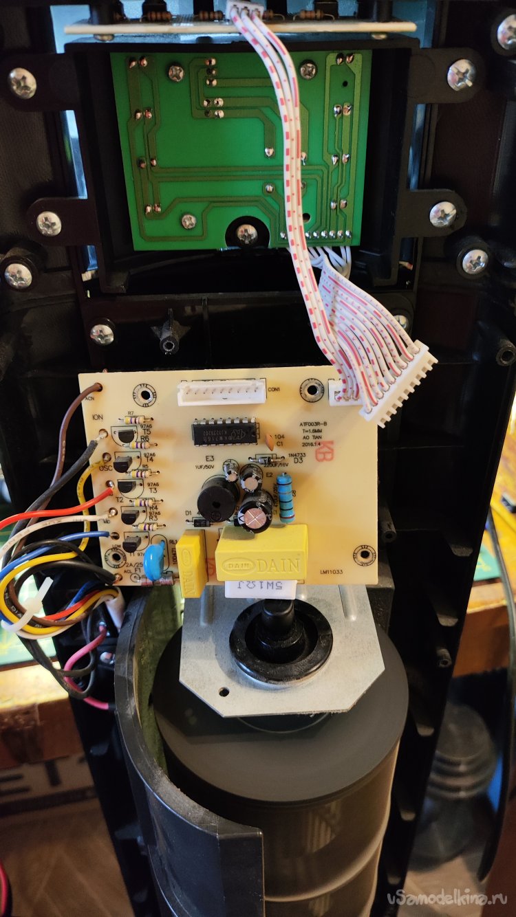 Установил плату на место. В глаза бросился еще один желтый конденсатор такой же фирмы DAIN. Он стоит на входе по питанию, сглаживает помехи. Надо бы и его проверить.