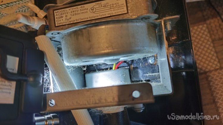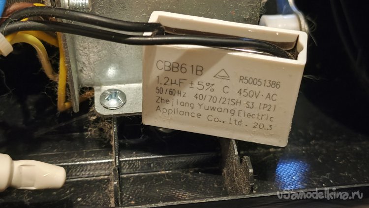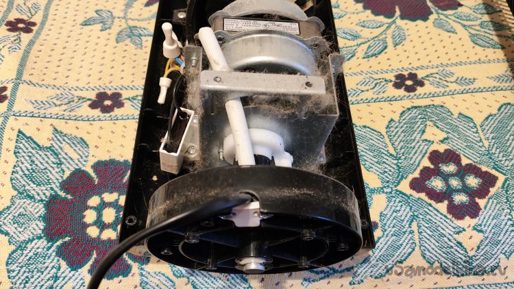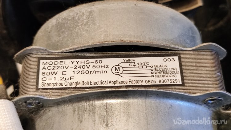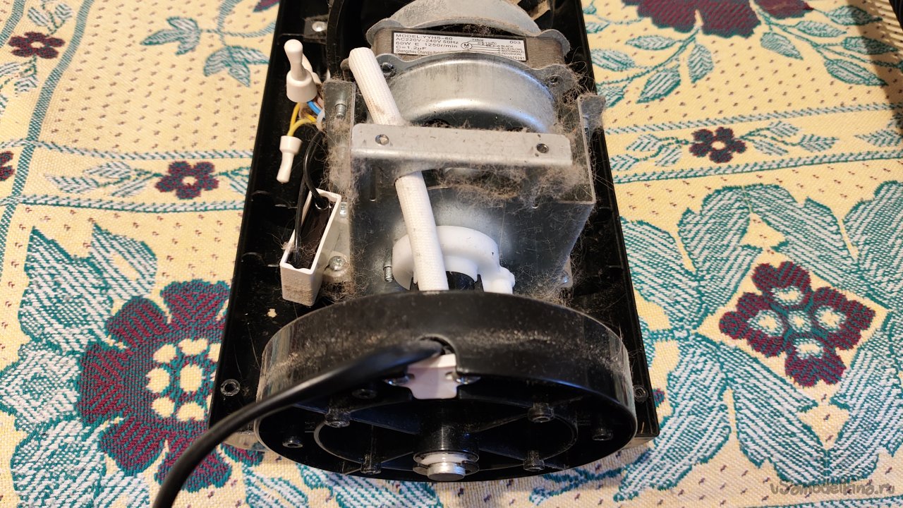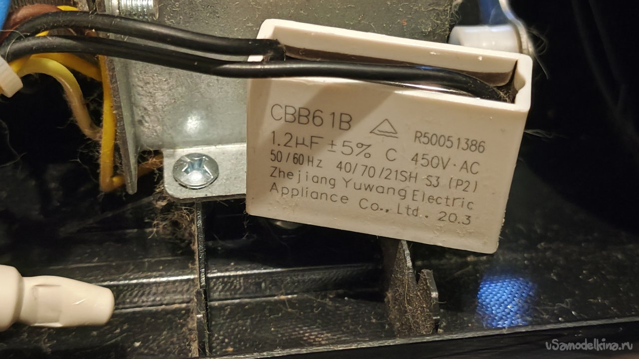 Немного пропылесосил нижнюю часть. Вентилятор трехскоростной с пусковой обмоткой. Обычно они достаточно надежные, выходят из строя только при заклинивании. Крутанул вентилятор, клина нет.