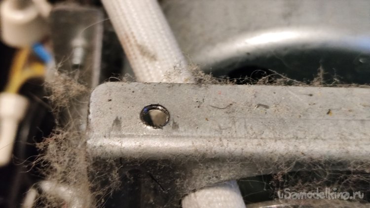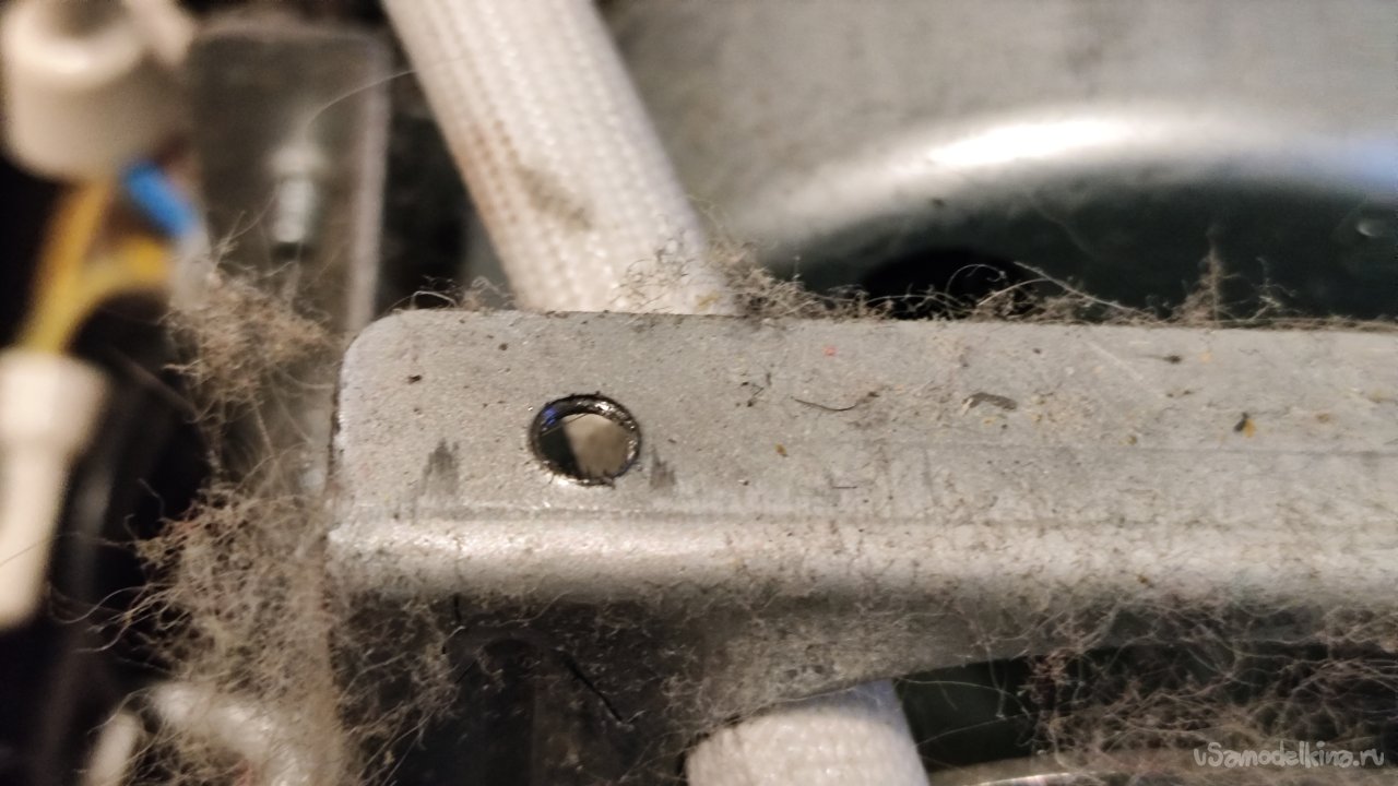 Правый винт выкрутился. Чтобы выкрутить левый, пришлось в щель между задней крышкой и опорой двигателя вставить большую отвертку и сильно надавить на крышку вверх. Только тогда получилось выкрутить винт. Внутри немного пыльно.