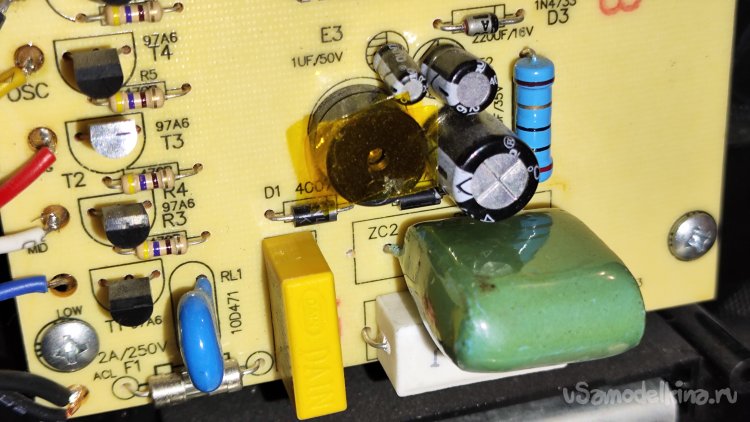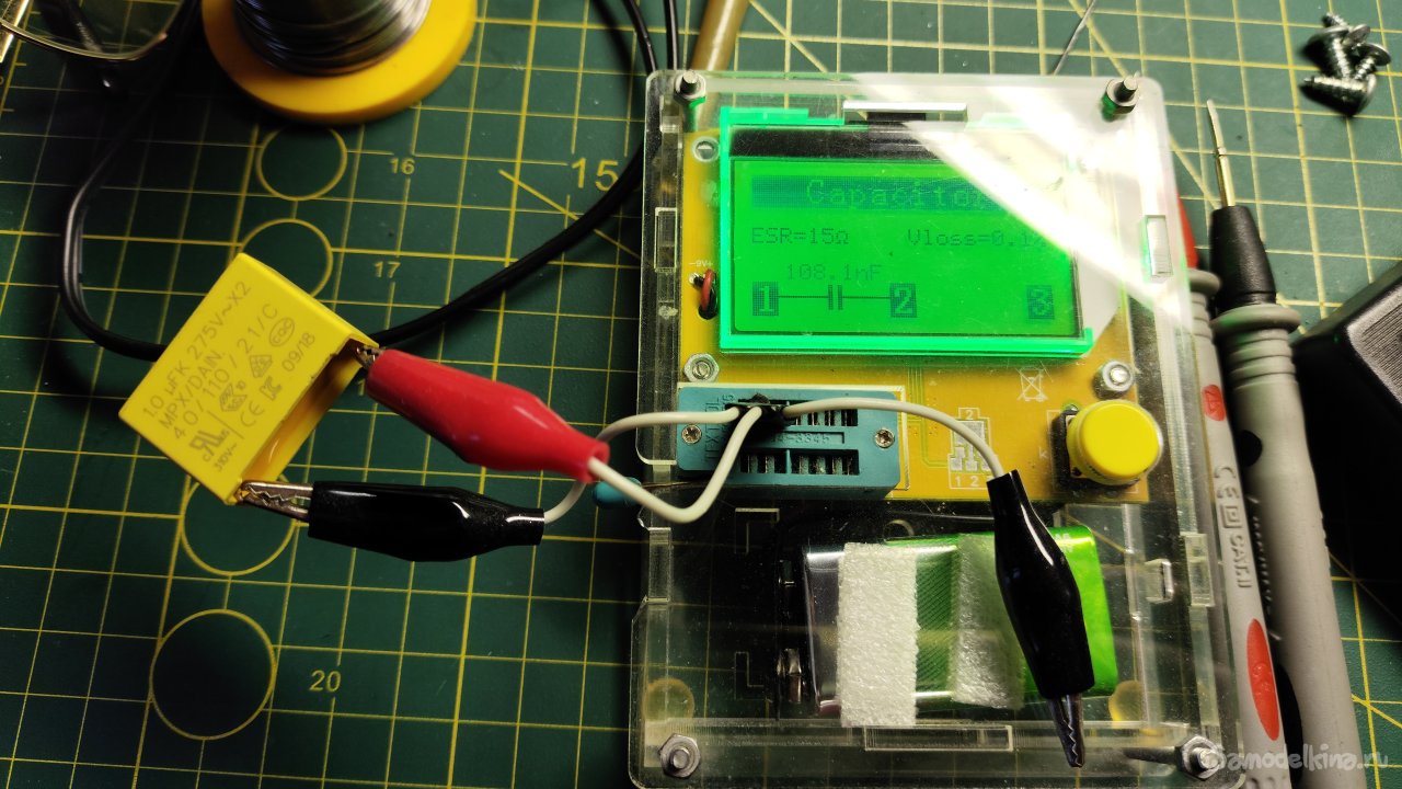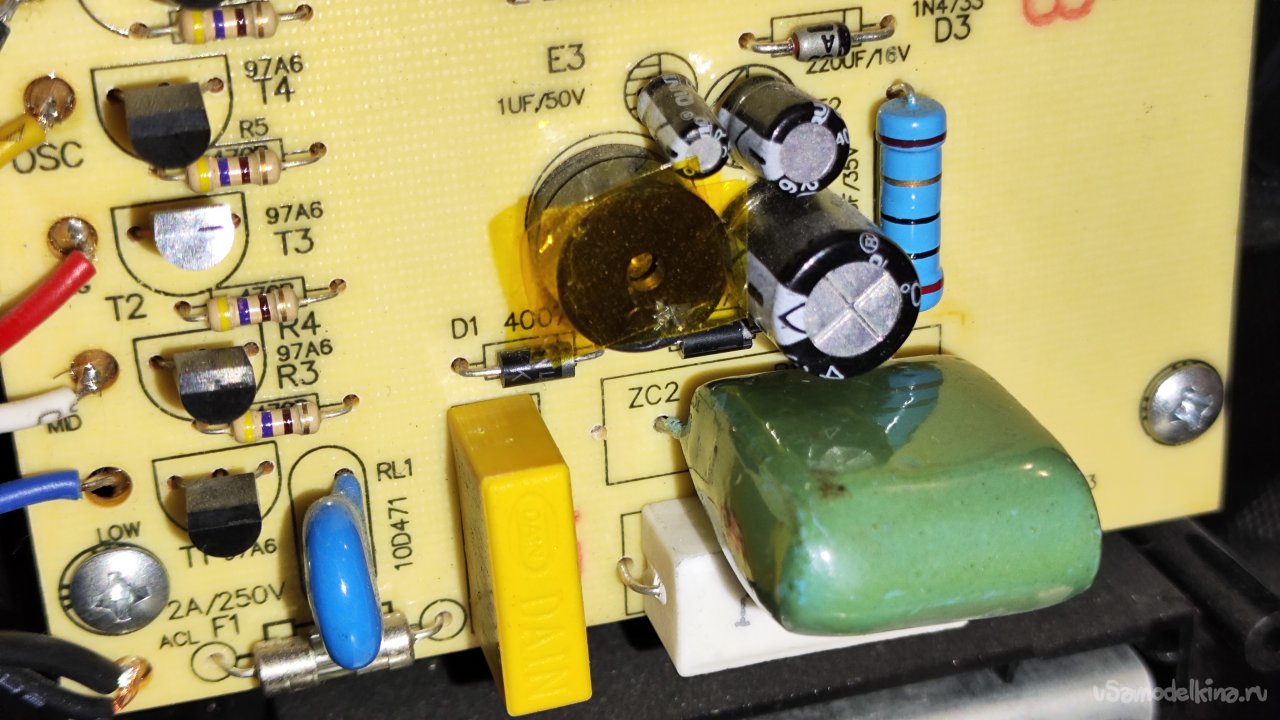 По схеме напряжение питания через предохранитель и непонятно зачем установленный резистор 5Вт 1 Ом, идет на гасящий конденсатор 1 мкФ х 275В, выпрямляется двумя диодами и сглаживается первым самым большим конденсатором. На сглаживающем конденсаторе при включении напряжение 4,7 В, которое при нажатии на кнопку включения падает до 2,5 В, даже с отключенной платой индикации, что не есть хорошо. Конечно, проблема может быть в сглаживающем электролите, но первым я проверю гасящий конденсатор. И действительно, емкость у него в десять раз занижена, а ESR 15 Ом.
